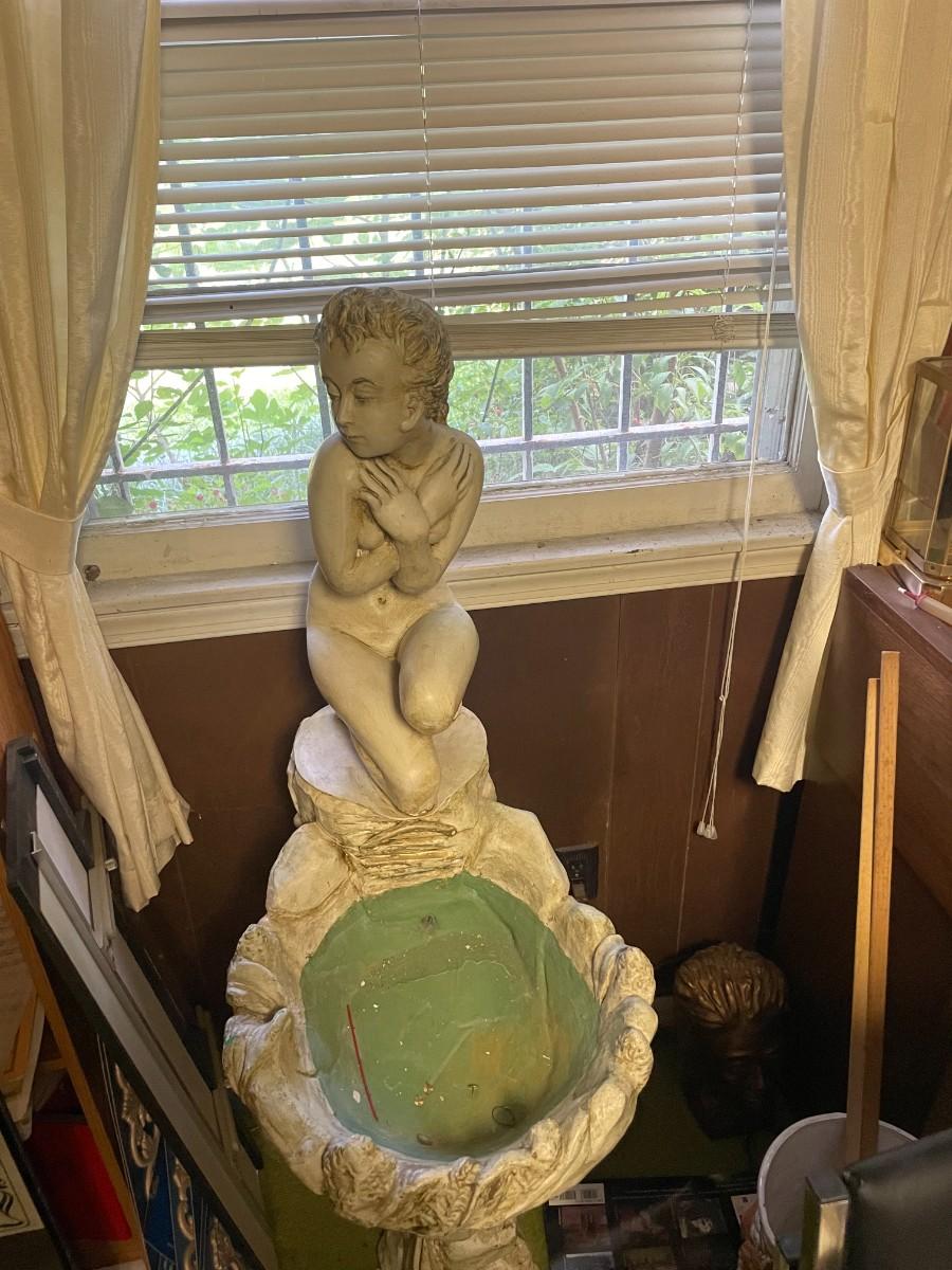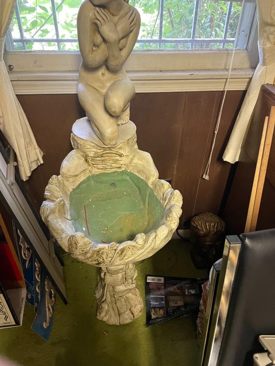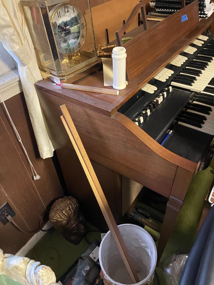 Vintage organ, bench, misc. items, fountain, statue, clock, chairs.