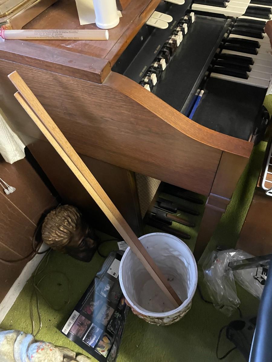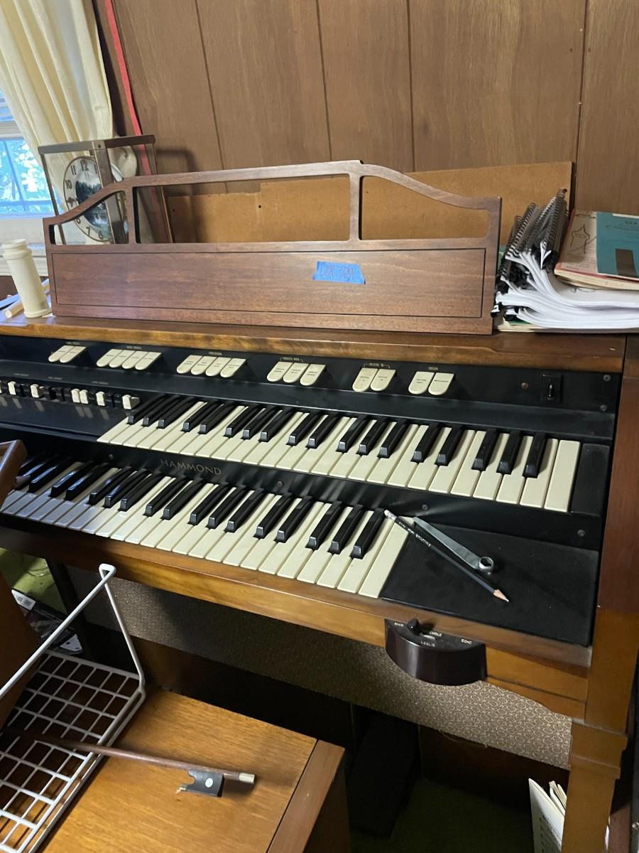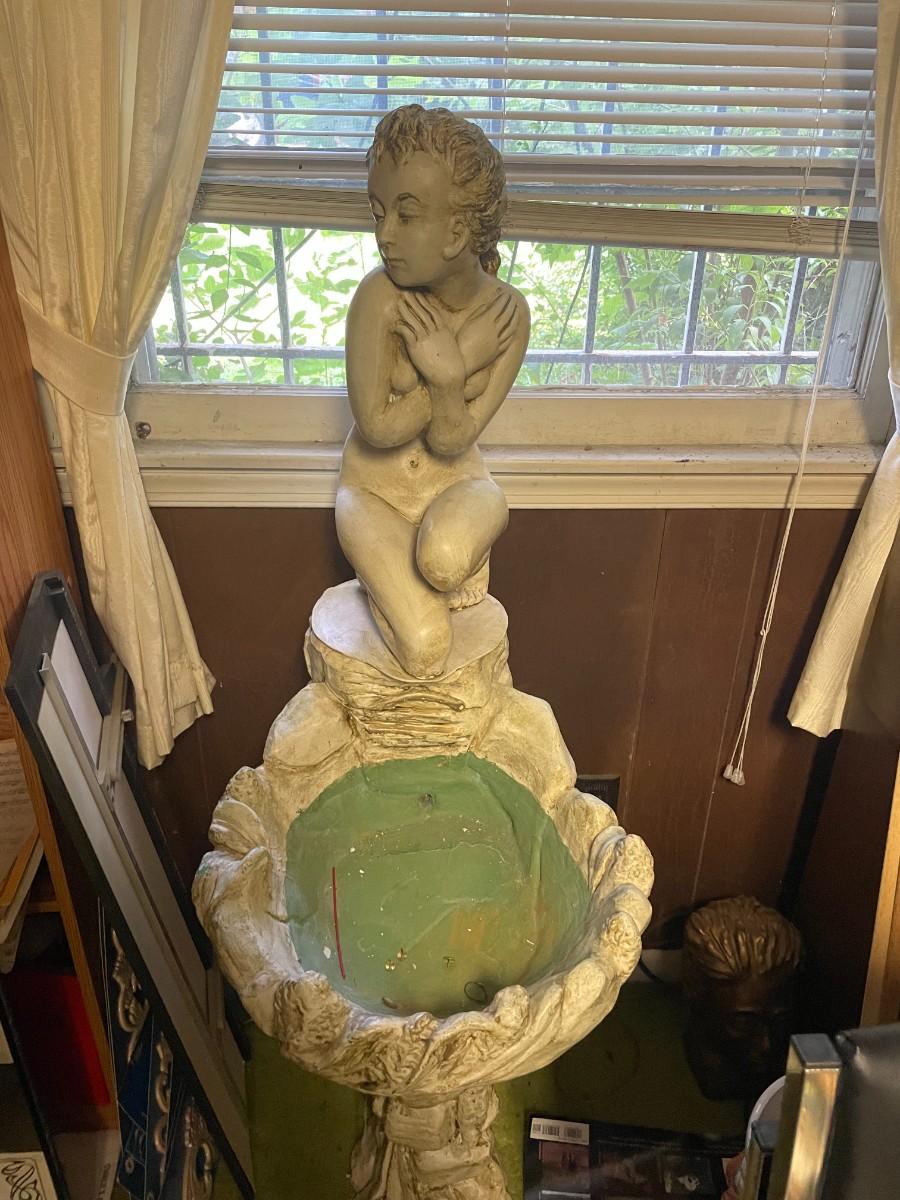 Vintage organ, bench, misc. items, fountain, statue, clock, chairs.