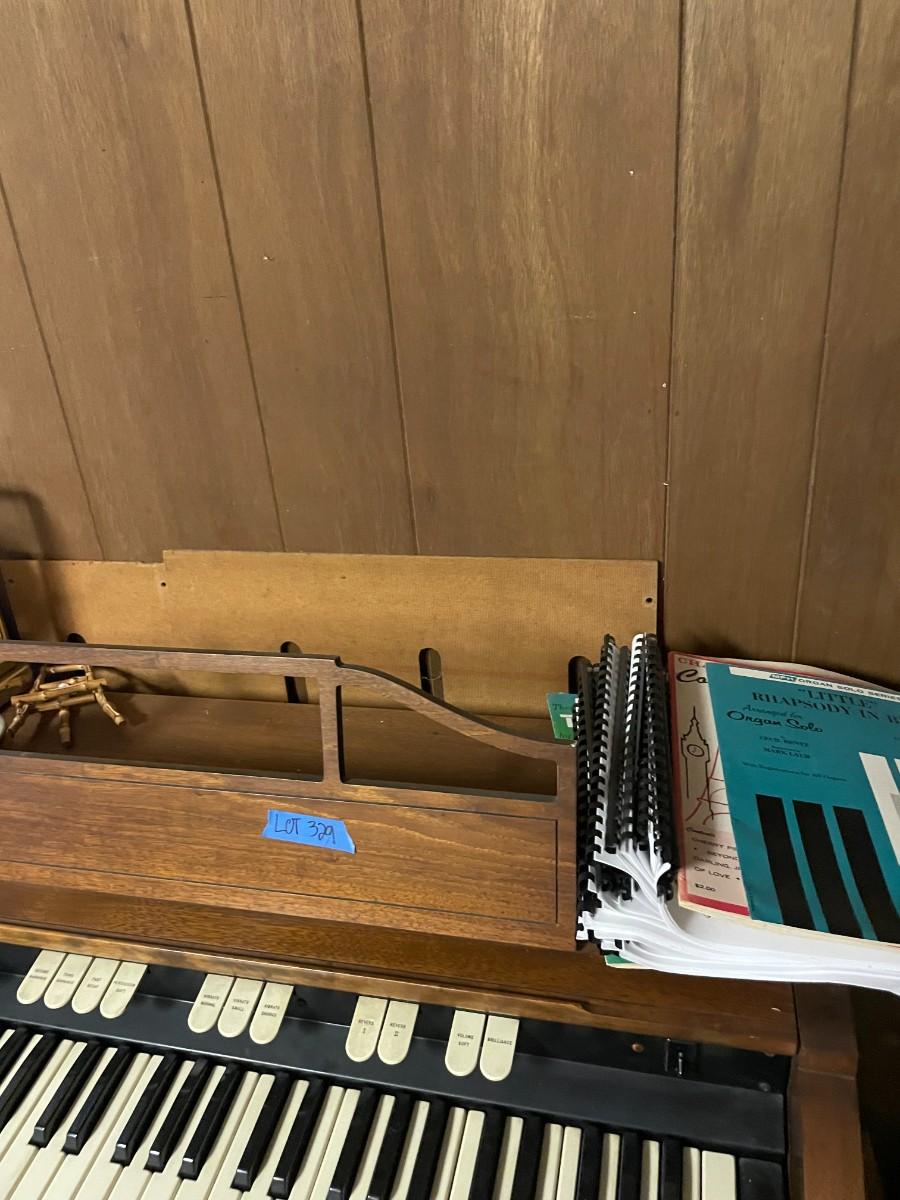 lot 329- Vintage organ, bench, misc. items, fountain, statue, clock, chairs