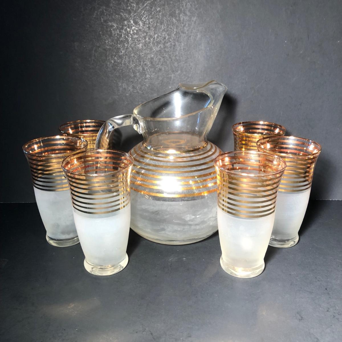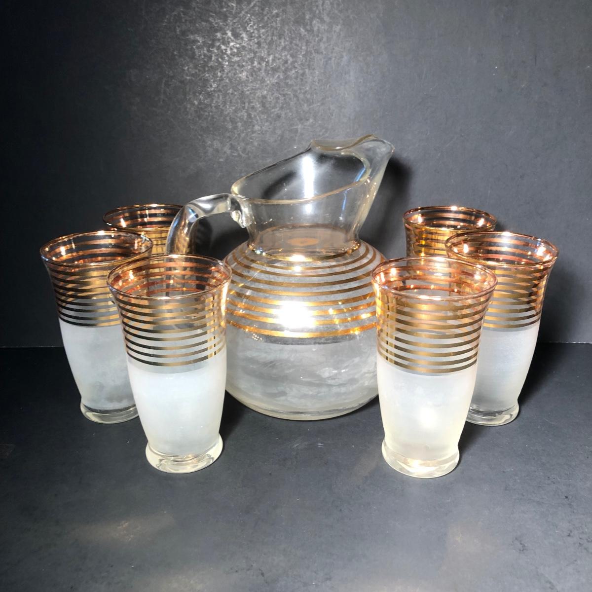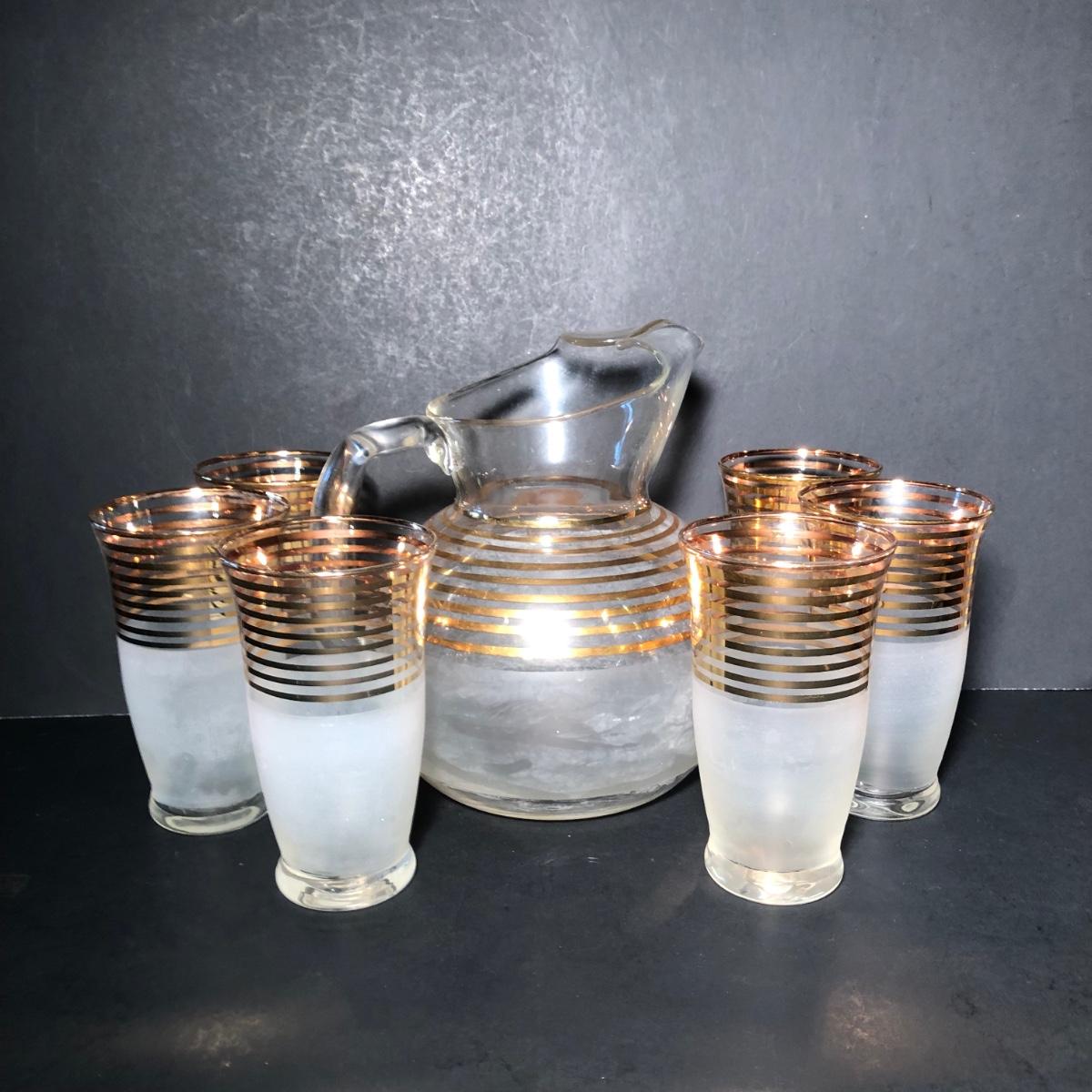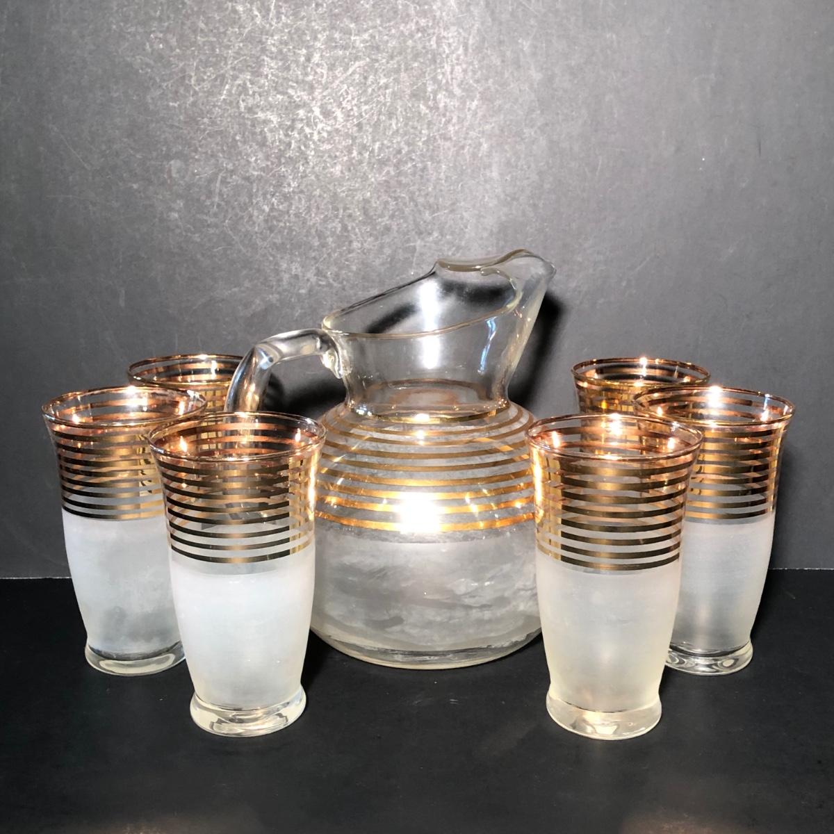 LOT 329K: Vintage 1940s Art Deco Frosted Gold Rimmed Pitcher w/ 6 Matching Glasses