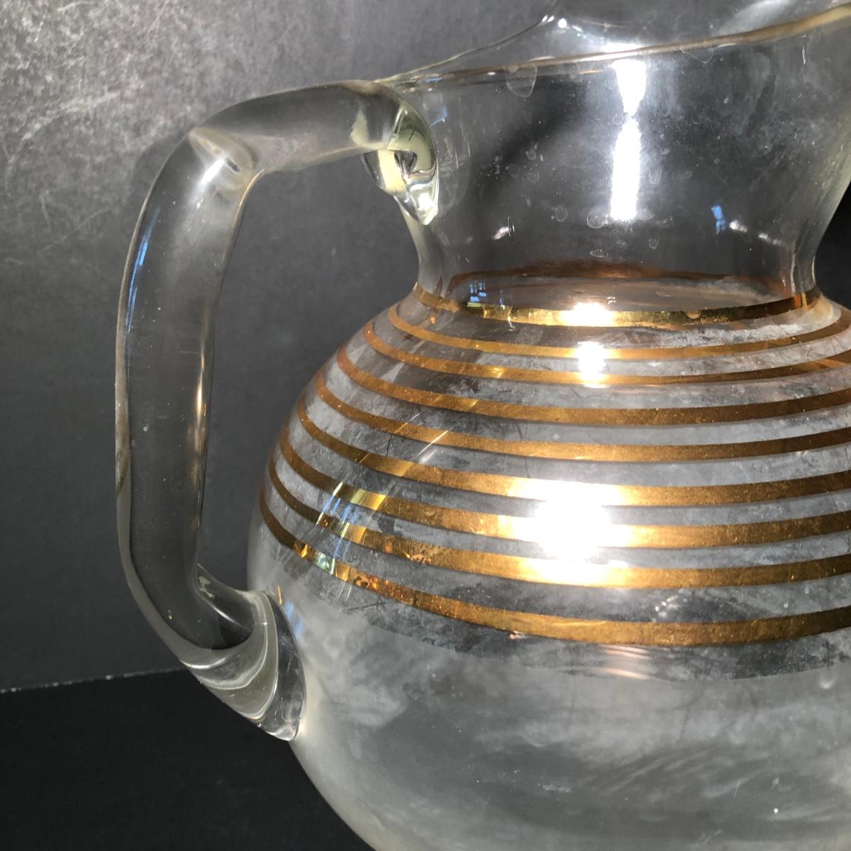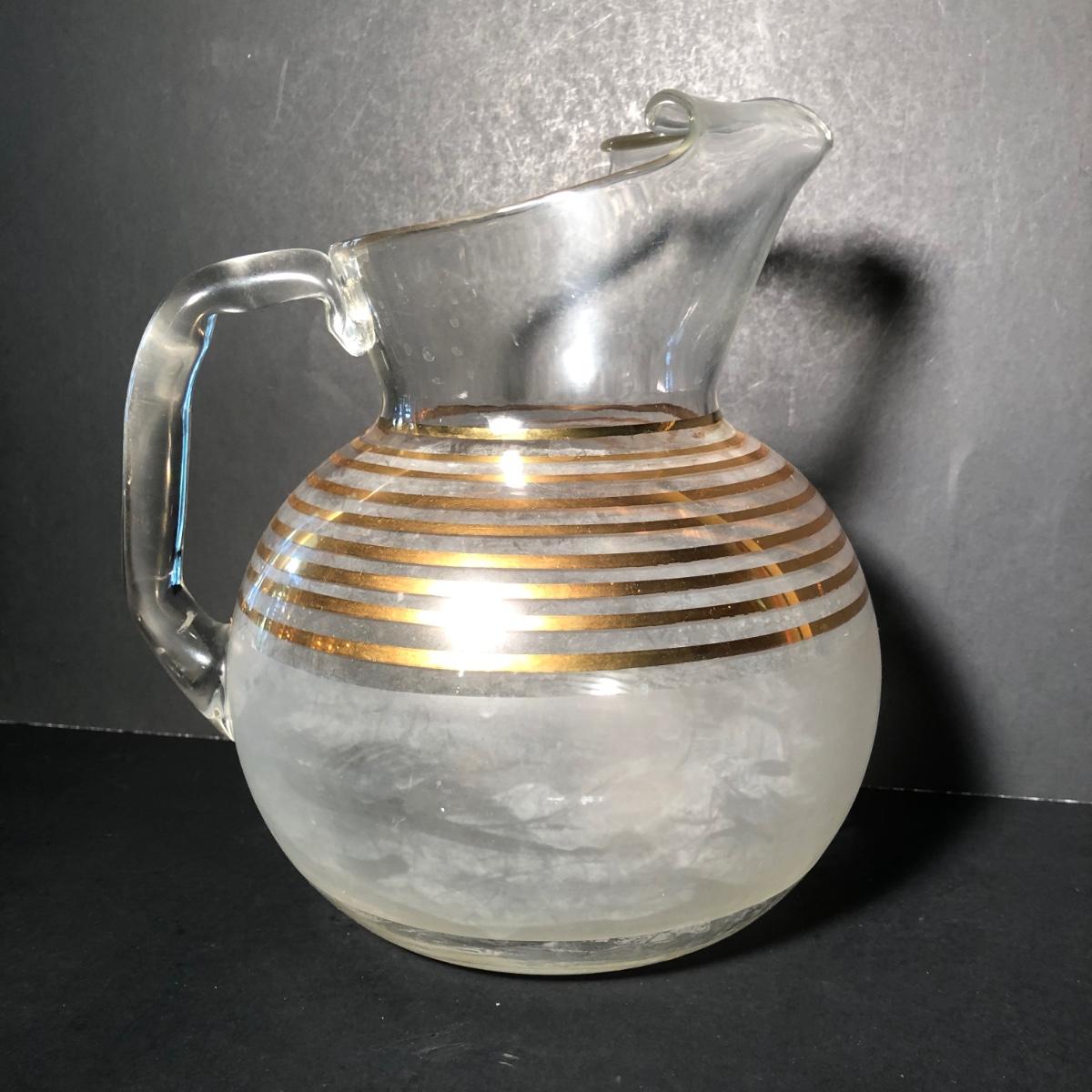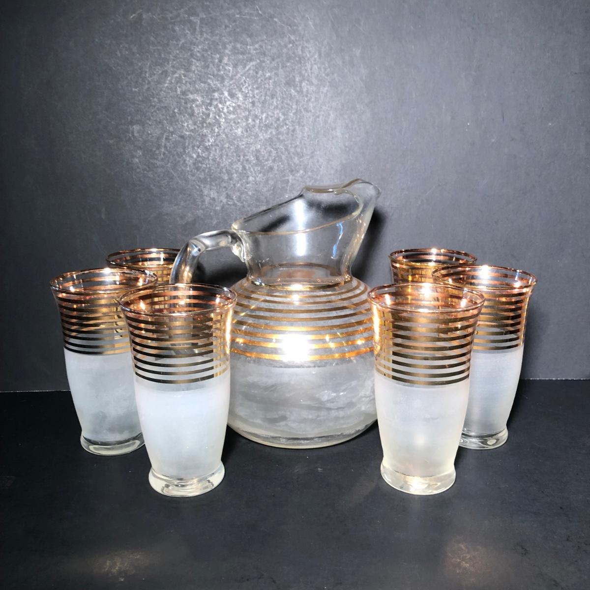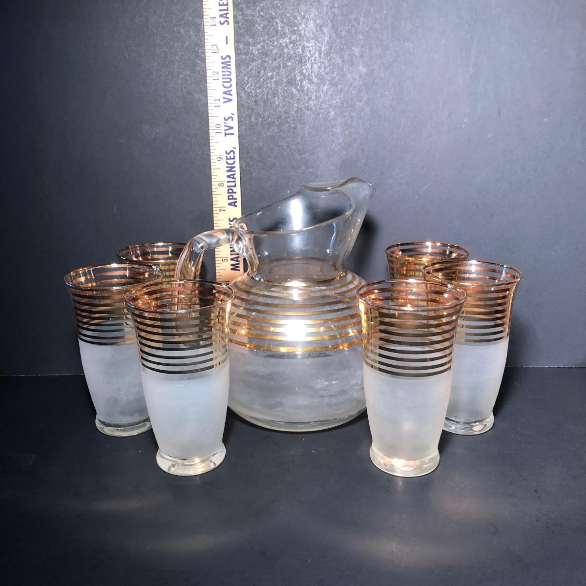LOT 329K: Vintage 1940s Art Deco Frosted Gold Rimmed Pitcher w/ 6 Matching Glasses