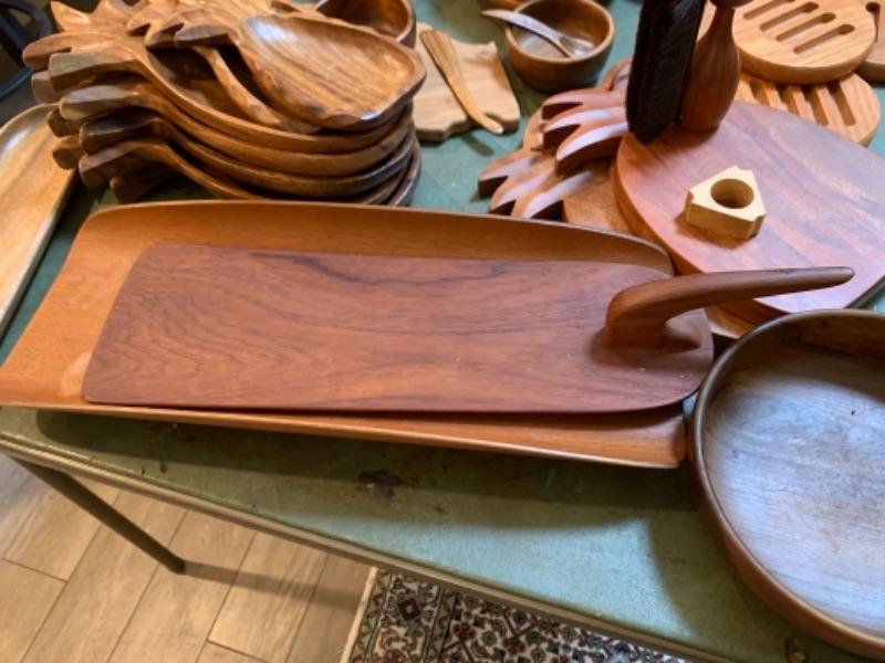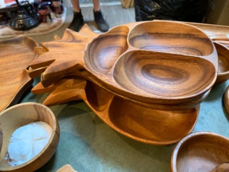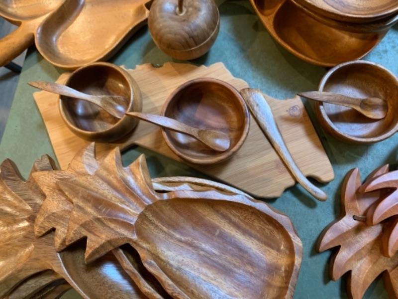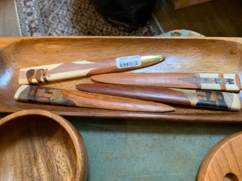 Lot 32D. Wooden bowls, platters, four letter openers, Hawaiian monkey pod serving bowls, cutting boards, wooden utensils, etc.--$80