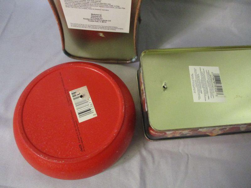 These tins are in very good condition with the tallest being about 13" tall. Three of the tins have small holes in the back that look like it is from a drill so that they could be hung on a wall.