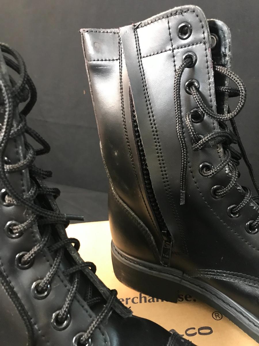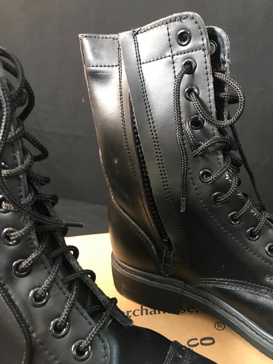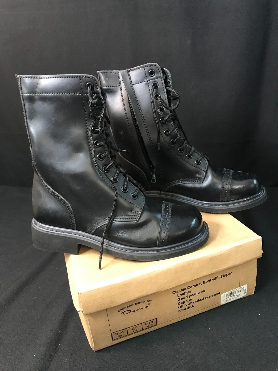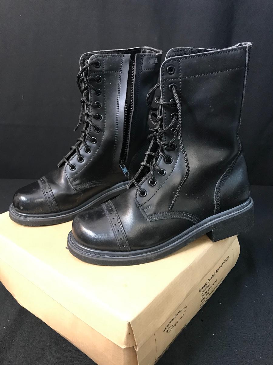 Black Combat Boots With Zipper Size 8.5. New in box. Box shows shelf wear. Please see all pictures as they are the best representation of the items. The pictures show condition, measurements if taken, and what is included in the lot. Due to the large amount that we photograph and the time frame, we are not always able to take measurements. All items unless noted, are pre-owned and have been used. If you purchased furniture, you must bring help. We do not allow one person to carry large furniture out on their own. Bring help, tools and a truck for the safety of our client’s homes, and your personal safety. Company policy. Thank you.