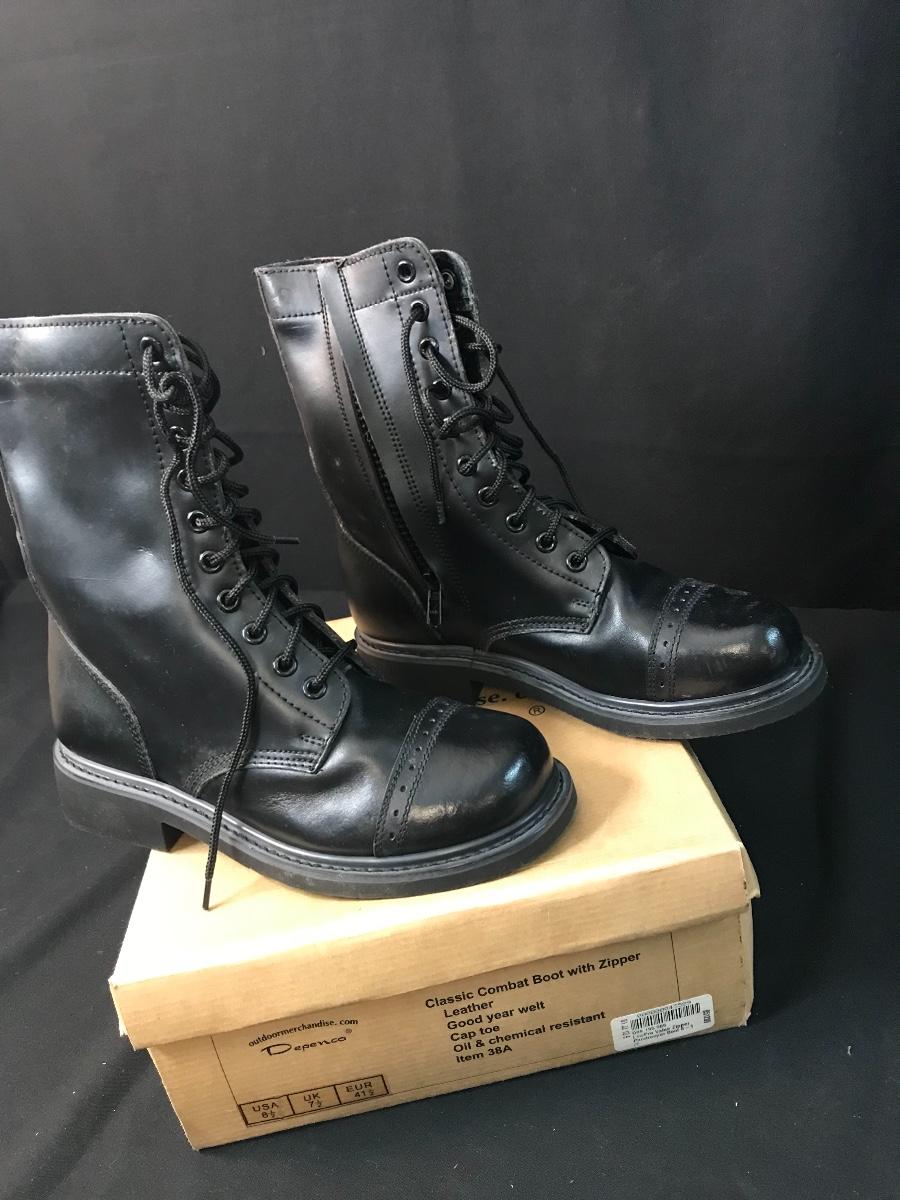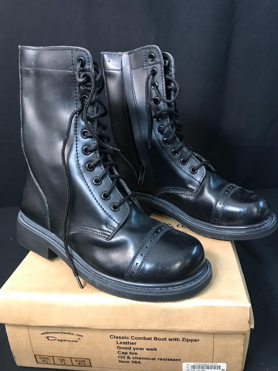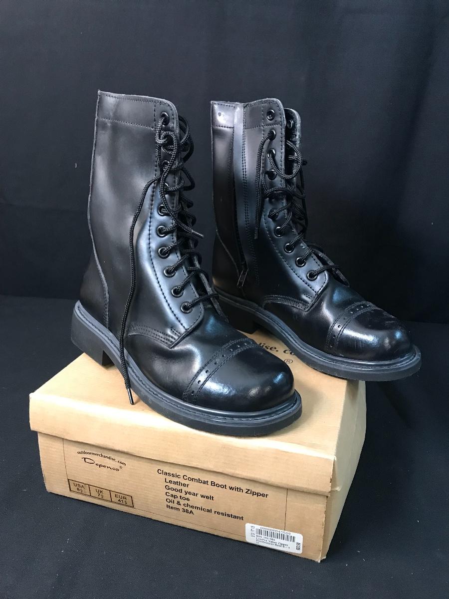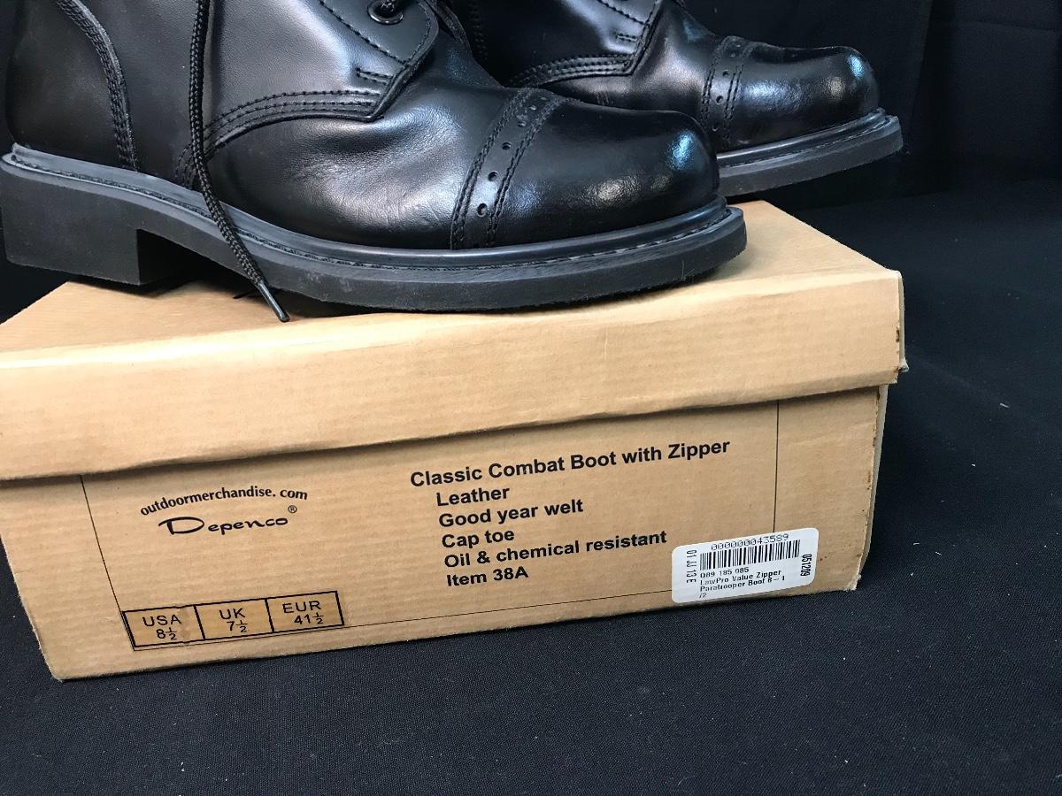 Black Combat Boots With Zipper Size 8.5. New in box. Box shows shelf wear. Please see all pictures as they are the best representation of the items. The pictures show condition, measurements if taken, and what is included in the lot. Due to the large amount that we photograph and the time frame, we are not always able to take measurements. All items unless noted, are pre-owned and have been used. If you purchased furniture, you must bring help. We do not allow one person to carry large furniture out on their own. Bring help, tools and a truck for the safety of our client’s homes, and your personal safety. Company policy. Thank you.
