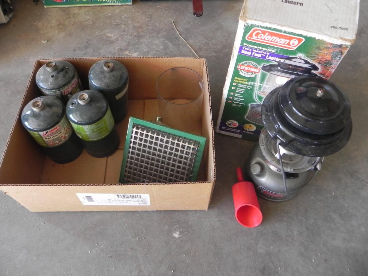 COLEMAN TWO MANTLE DUAL FUEL LANTERN AND COLEMAN HEATER