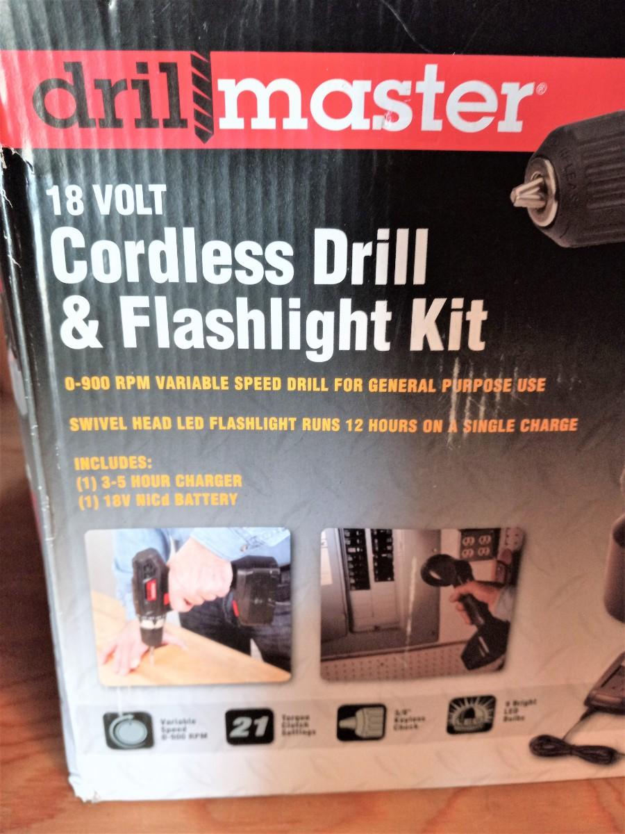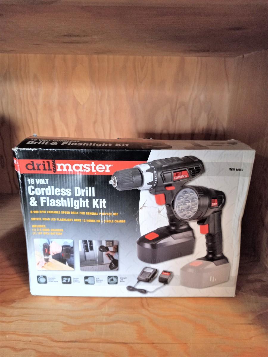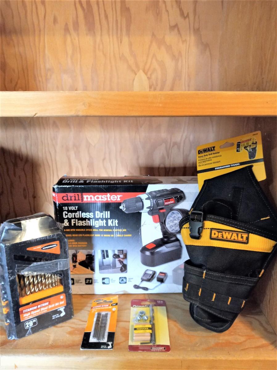 NEW CORDLESS DRILL AND FLASHLIGHT, DRILL BITS & DRILL HOLSTER