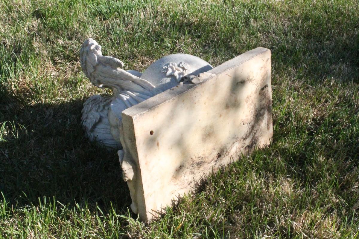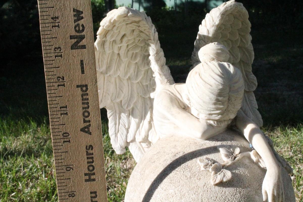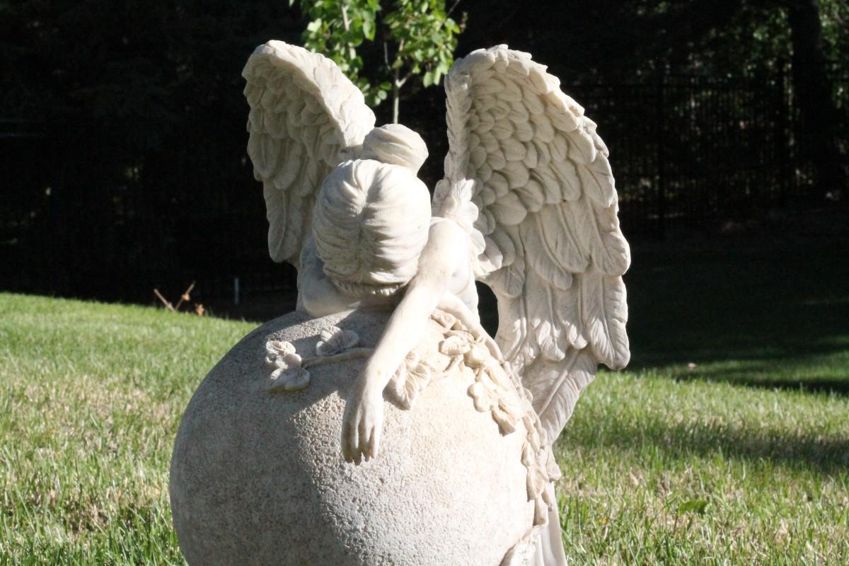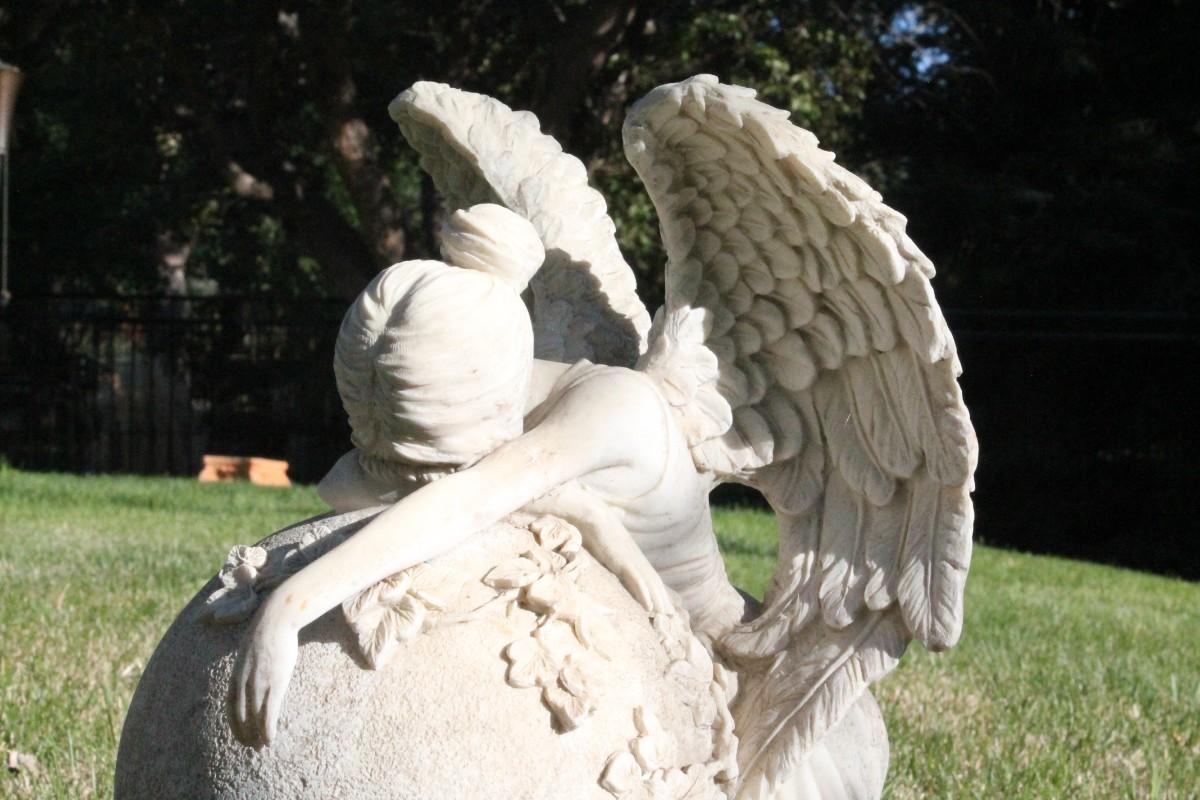 This vintage plaster garden feature shows a crying Angel.