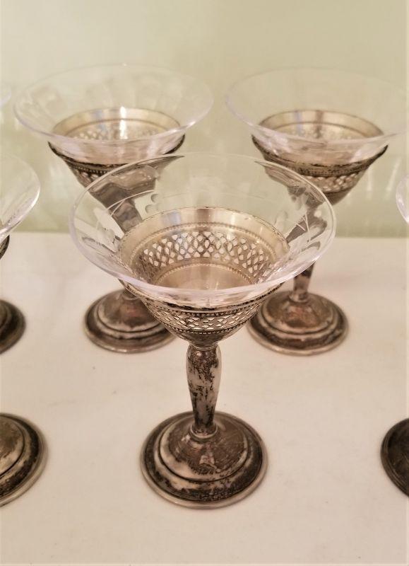9 delicate, etched crystal cordial glasses in sterling silver bases (not weighted). Each screws into the base and can be removed for easy cleaning. 2 of these have tiny flecks to the rim that you can feel with your finger - the others are fine. Each is 4.5" tall.