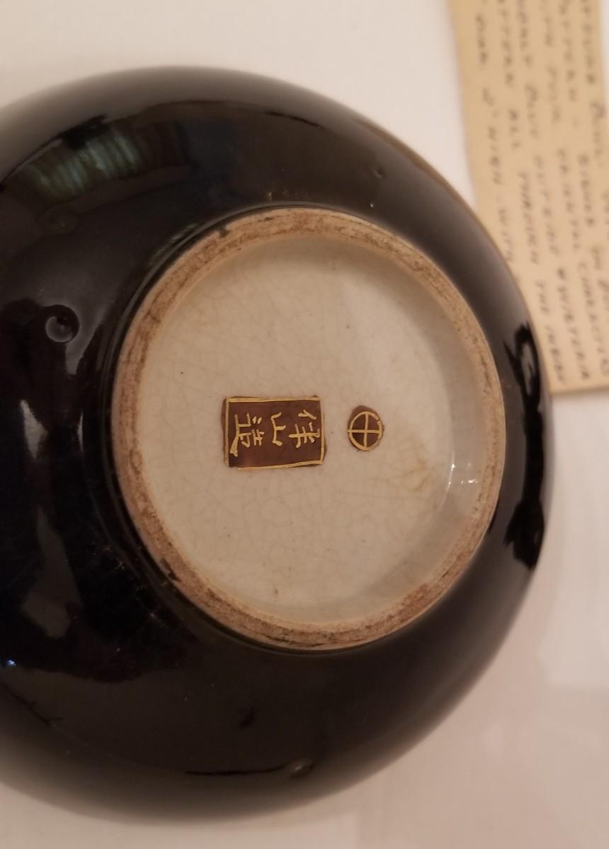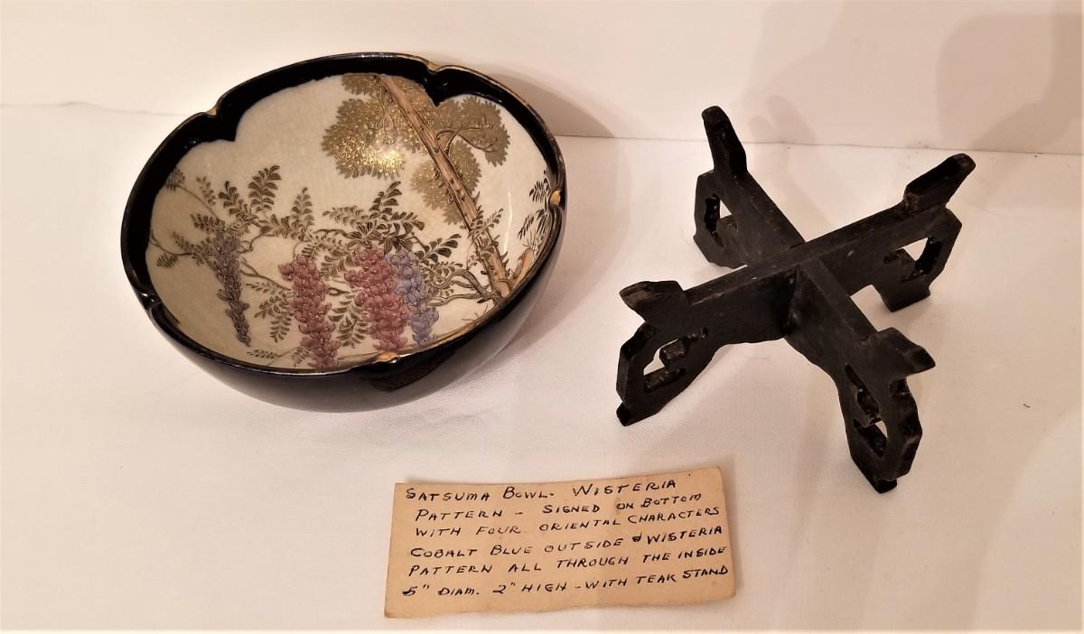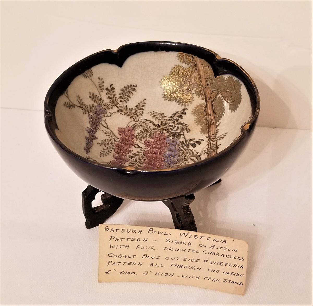 Nice antique Satsuma bowl - wisteria pattern - on stand. The previous owner had a note from the antique store she purchased it from - it's included. 5" across, 3.75" tall (not on stand). Good antique condition.