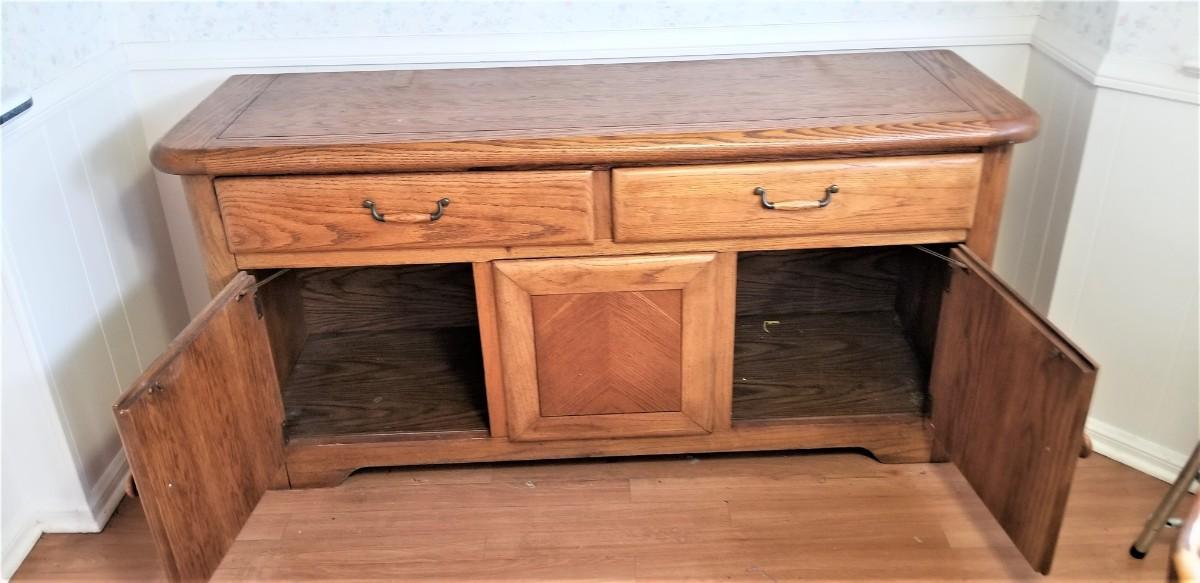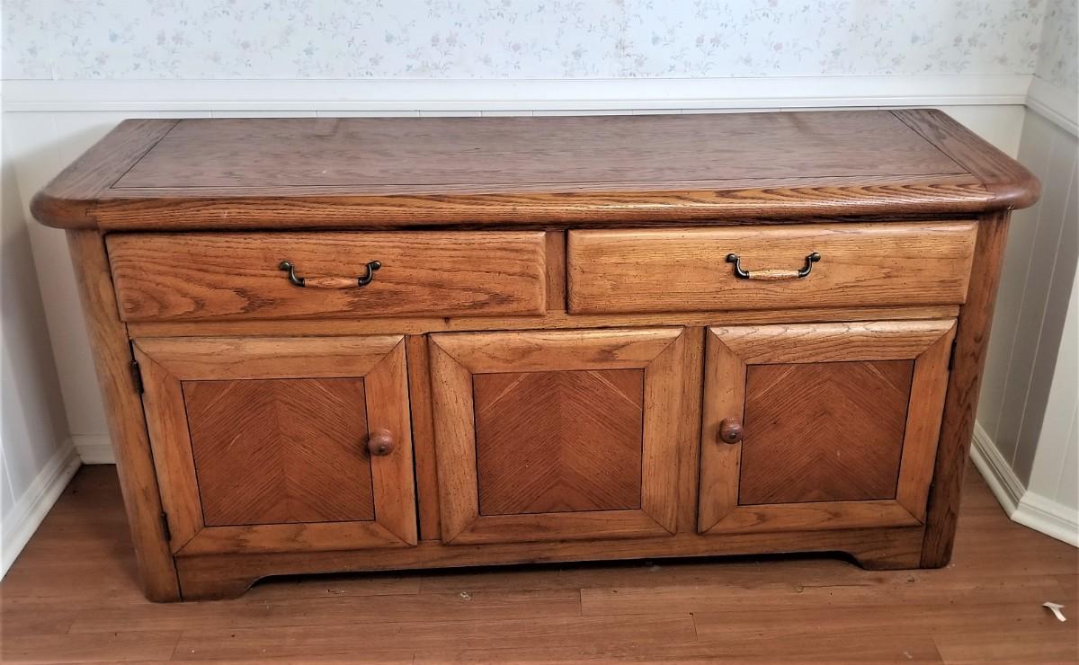 Oak sideboard - very heavy - no manufacturer's name noted. Two drawers, lots of storage beneath. 64" across, 20" deep, 31" tall. A very versatile piece of furniture. You will need help loading. Good, gently used condition.