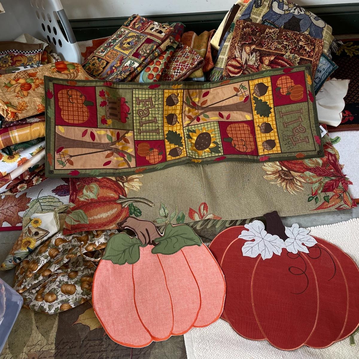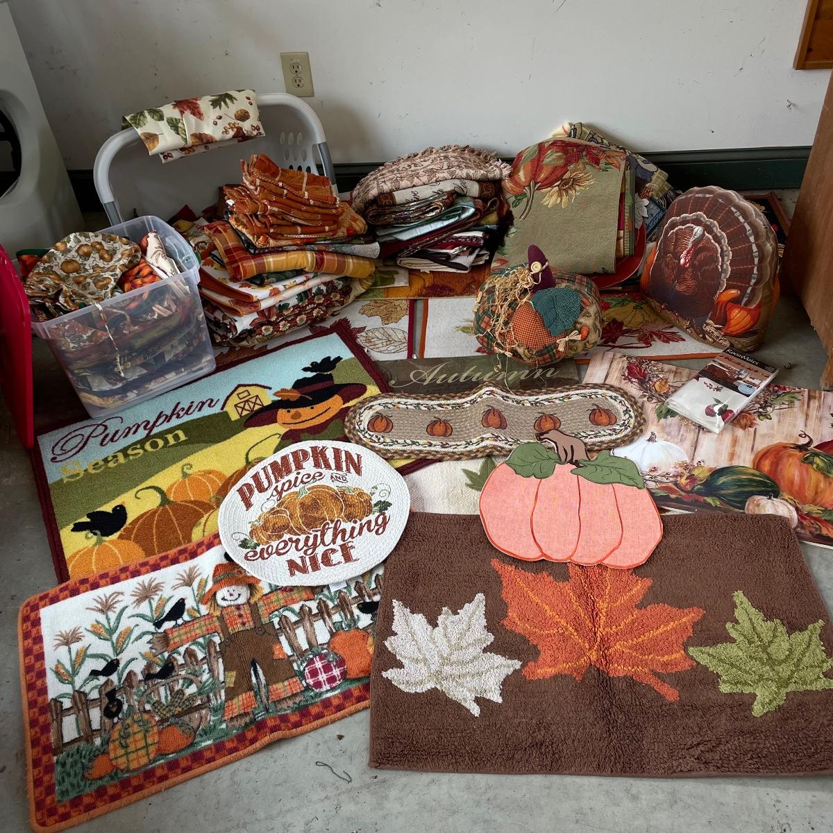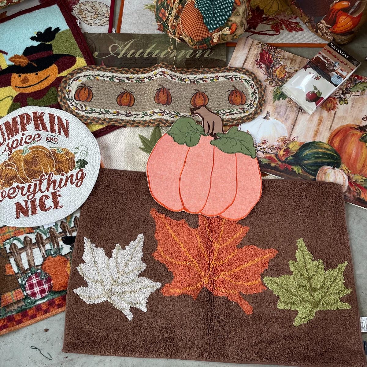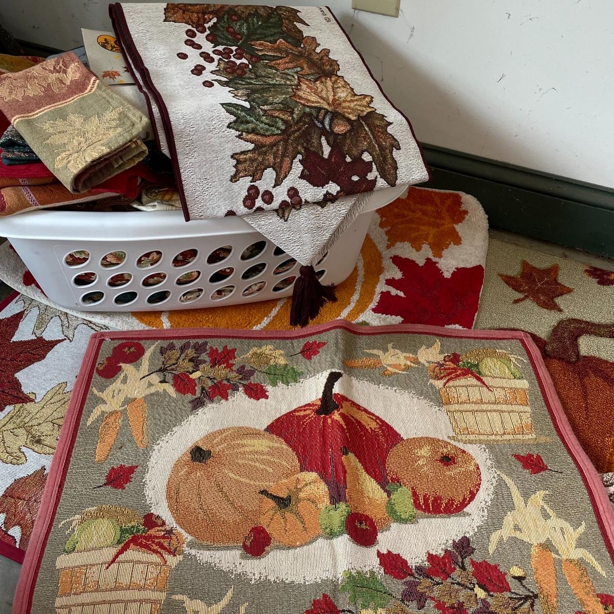 Calling all Pumpkin Spice Lovers! Completely show your love of fall with this large lot of mostly accent rugs and table runners! Rugs included are roughly 30” x 20” give or take a few inches, and range from woven to non-slip to rubber. Lot features a plethora of table runners along with a few cloth napkins, table cloths and placemat accents. A quilt-like stuffed pumpkin is the perfect centerpiece for the season. The laundry basket and small lidded storage bin are included in the lot. See images. Local pick up only.