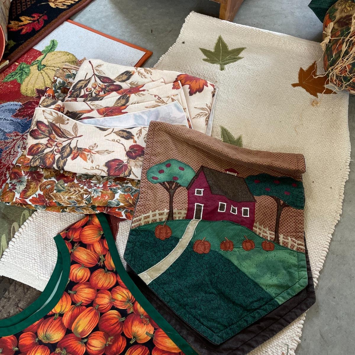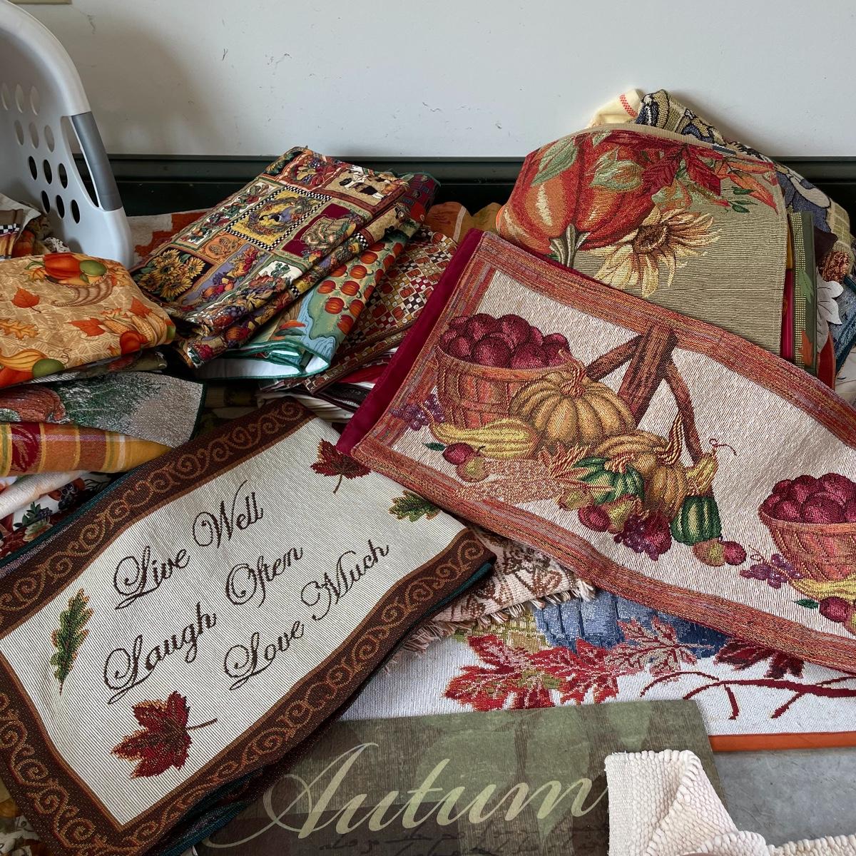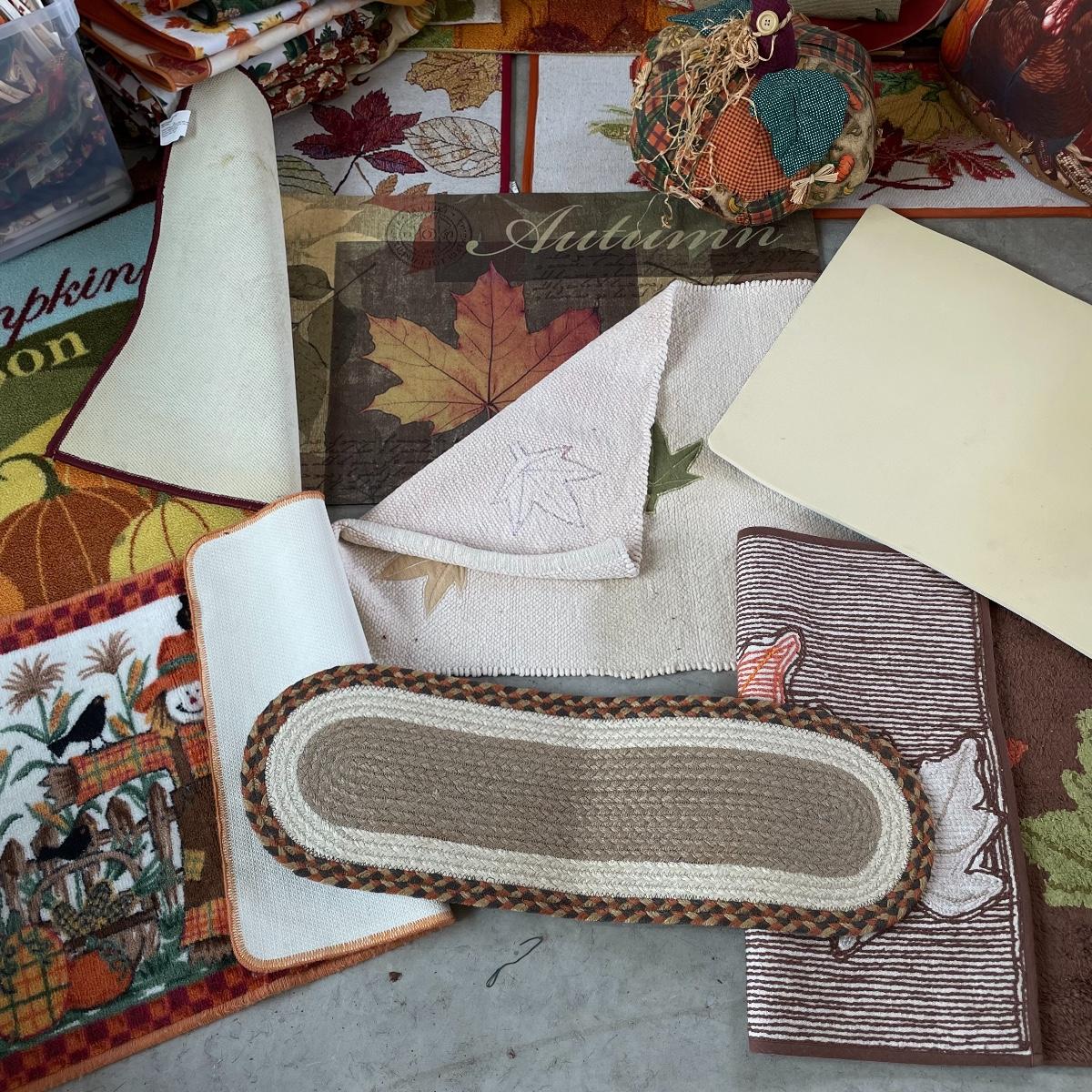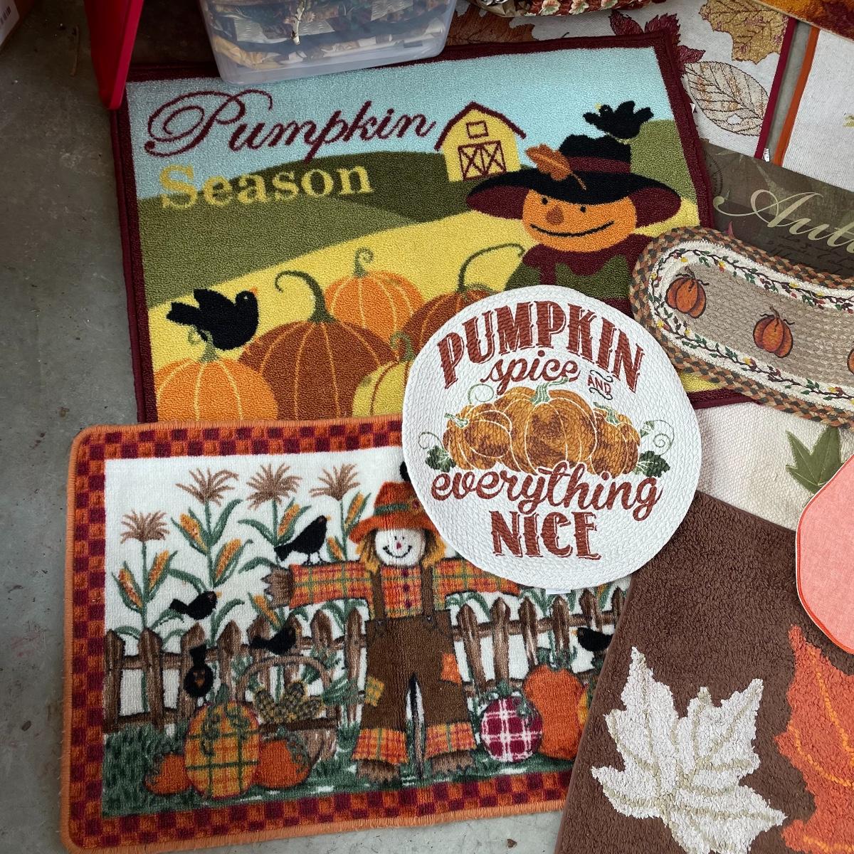Calling all Pumpkin Spice Lovers! Completely show your love of fall with this large lot of mostly accent rugs and table runners! Rugs included are roughly 30” x 20” give or take a few inches, and range from woven to non-slip to rubber. Lot features a plethora of table runners along with a few cloth napkins, table cloths and placemat accents. A quilt-like stuffed pumpkin is the perfect centerpiece for the season. The laundry basket and small lidded storage bin are included in the lot. See images. Local pick up only.