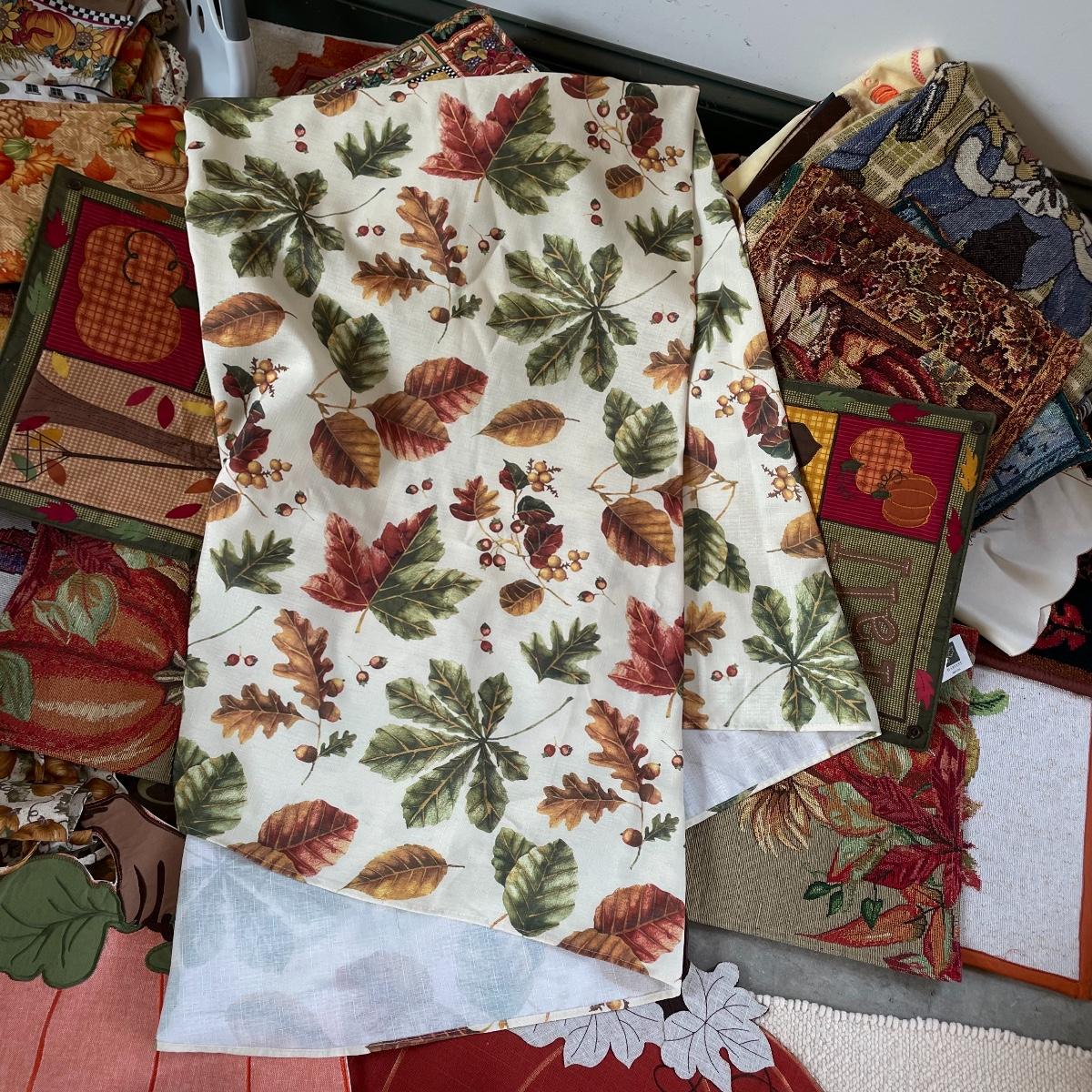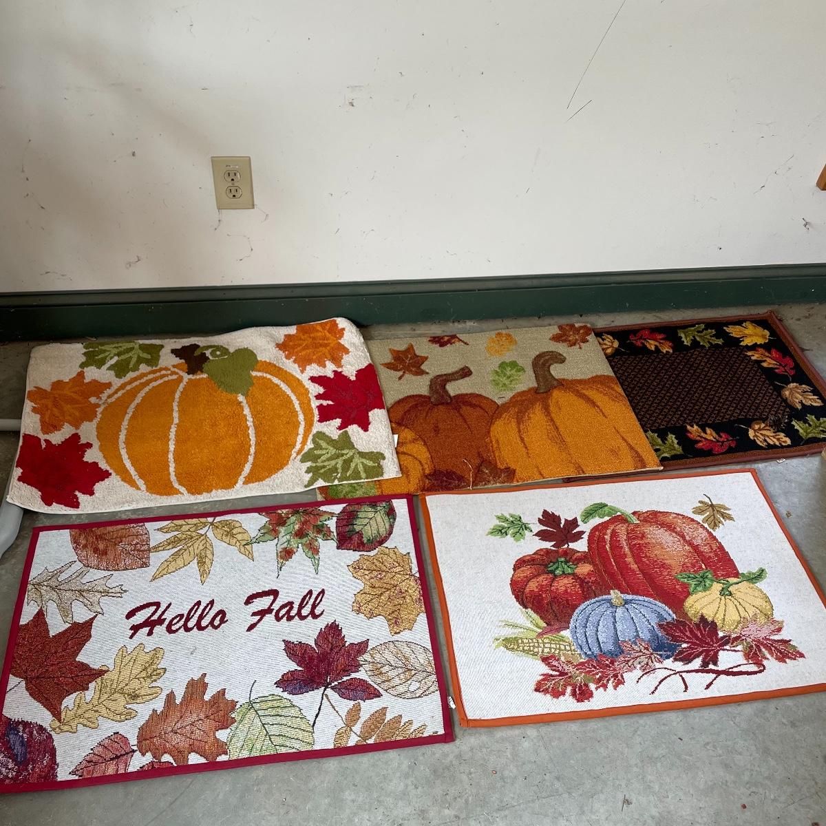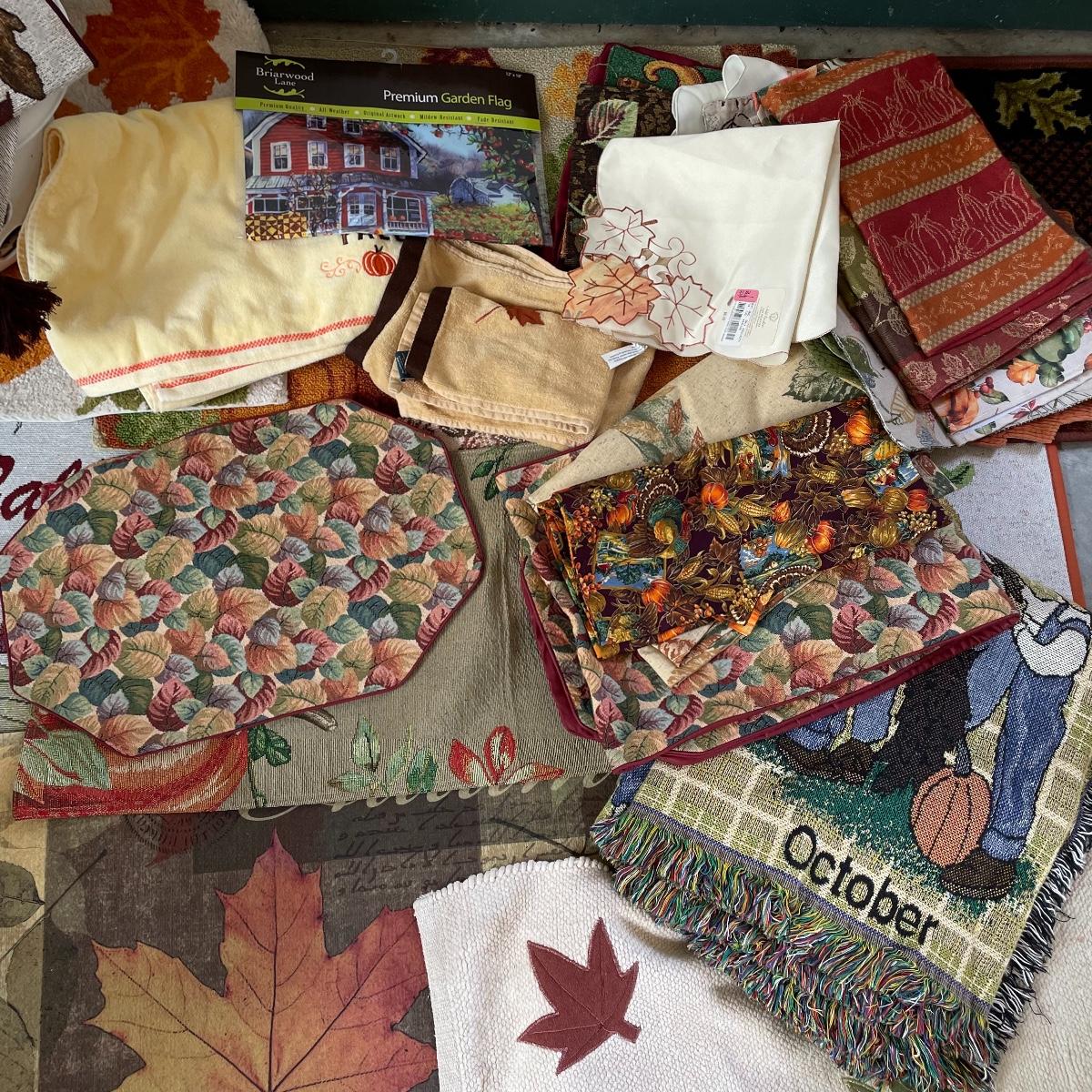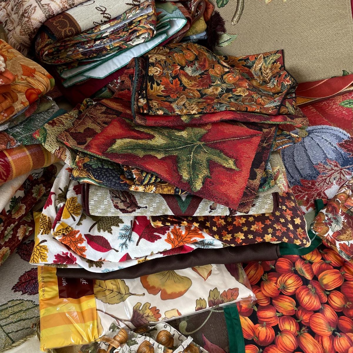 Calling all Pumpkin Spice Lovers! Completely show your love of fall with this large lot of mostly accent rugs and table runners! Rugs included are roughly 30” x 20” give or take a few inches, and range from woven to non-slip to rubber. Lot features a plethora of table runners along with a few cloth napkins, table cloths and placemat accents. A quilt-like stuffed pumpkin is the perfect centerpiece for the season. The laundry basket and small lidded storage bin are included in the lot. See images. Local pick up only.