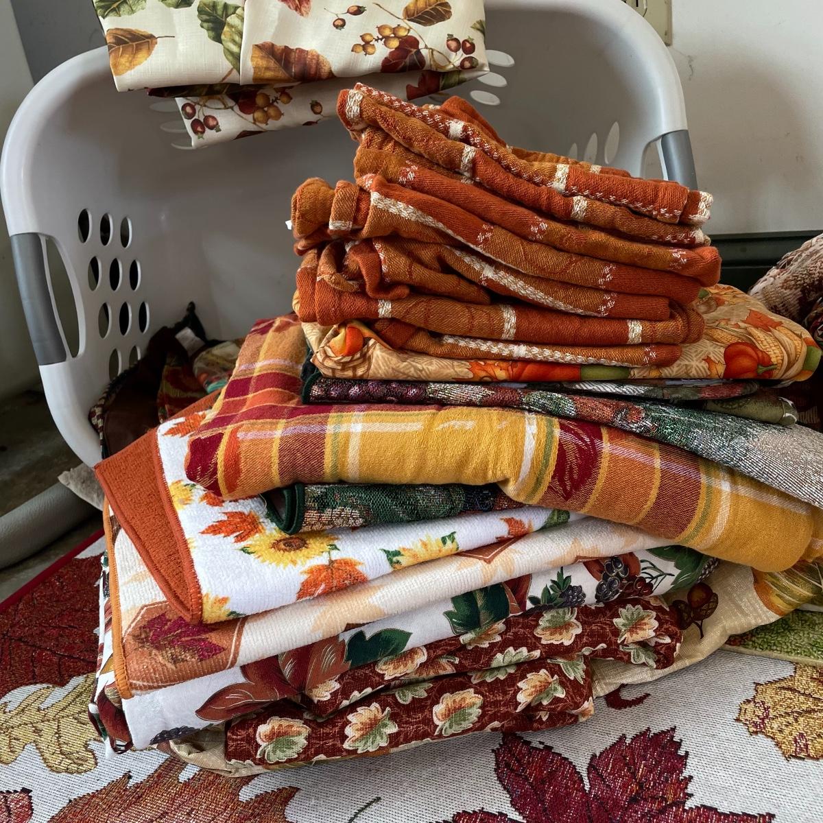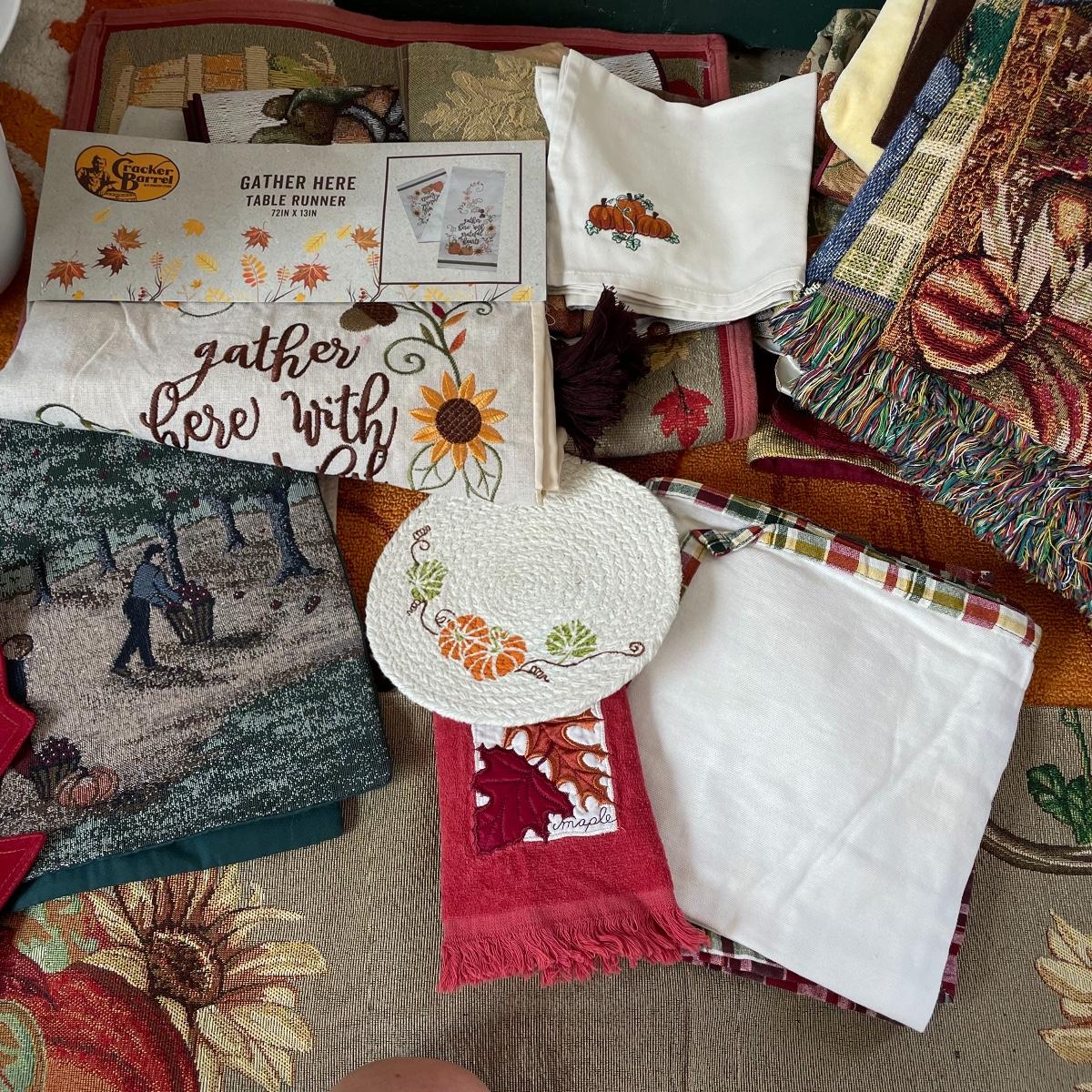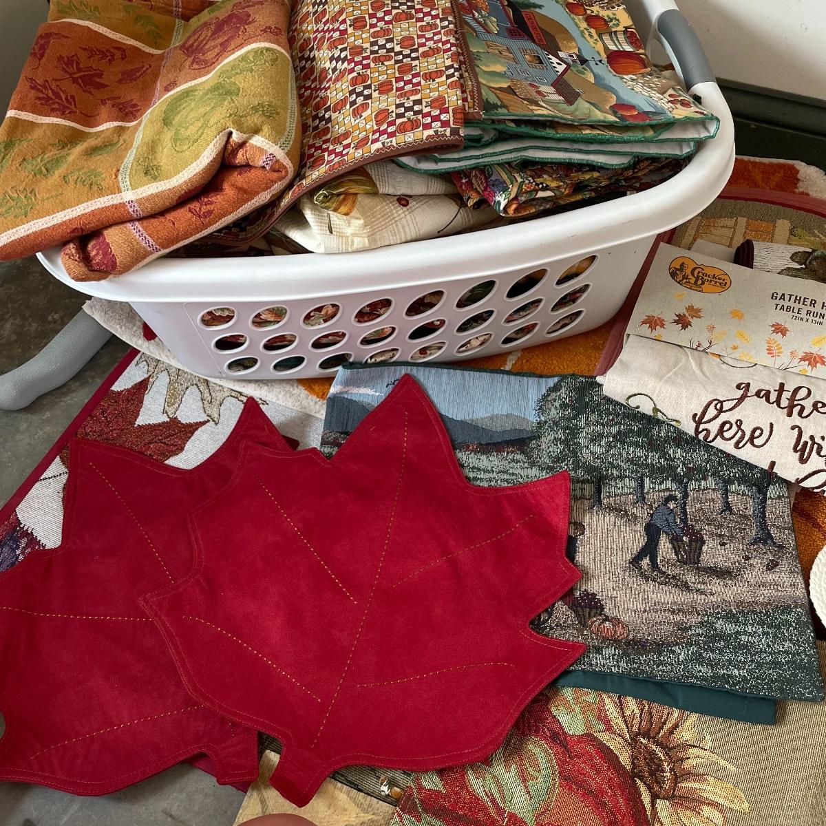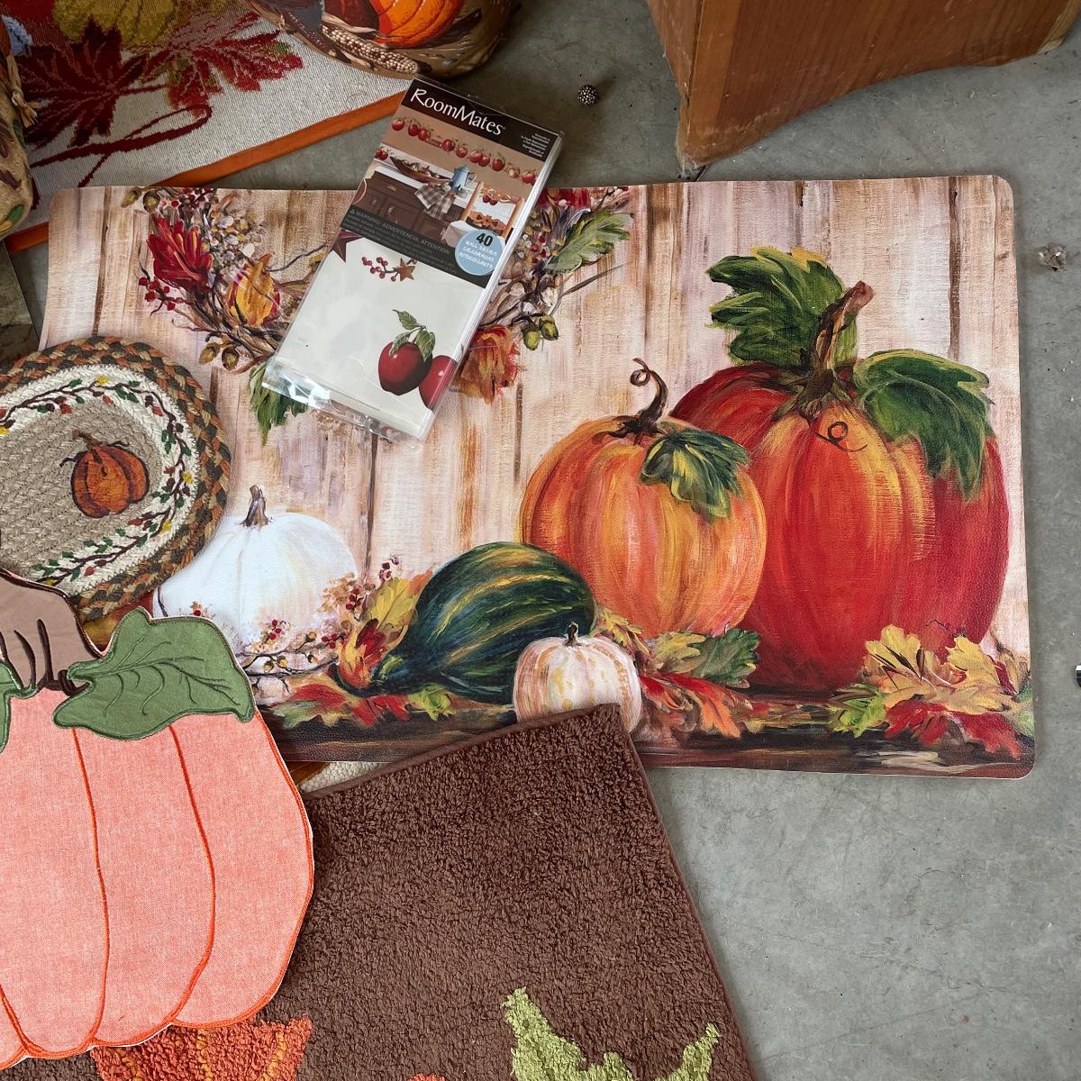 Calling all Pumpkin Spice Lovers! Completely show your love of fall with this large lot of mostly accent rugs and table runners! Rugs included are roughly 30” x 20” give or take a few inches, and range from woven to non-slip to rubber. Lot features a plethora of table runners along with a few cloth napkins, table cloths and placemat accents. A quilt-like stuffed pumpkin is the perfect centerpiece for the season. The laundry basket and small lidded storage bin are included in the lot. See images. Local pick up only.