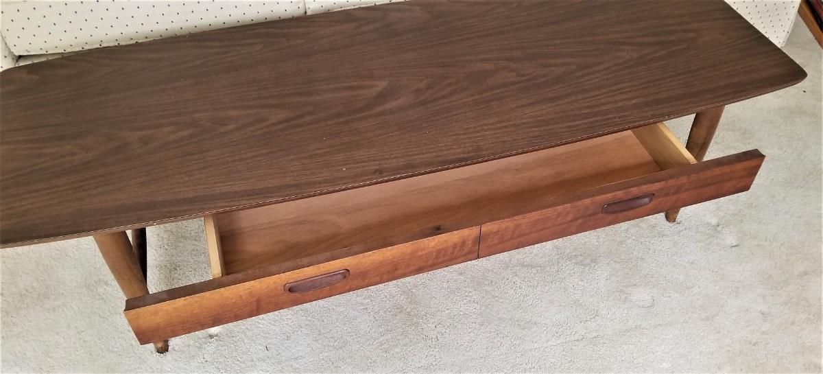 Totally cool 1960's mid-century modern coffee table by LANE - one drawer. Measures 56" long, 20" across - great vintage condition. We have the lamp table to match it later in the sale. A set like this is currently being offering on ebay for over $500.00, plus shipping.