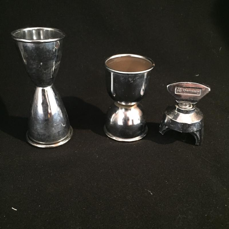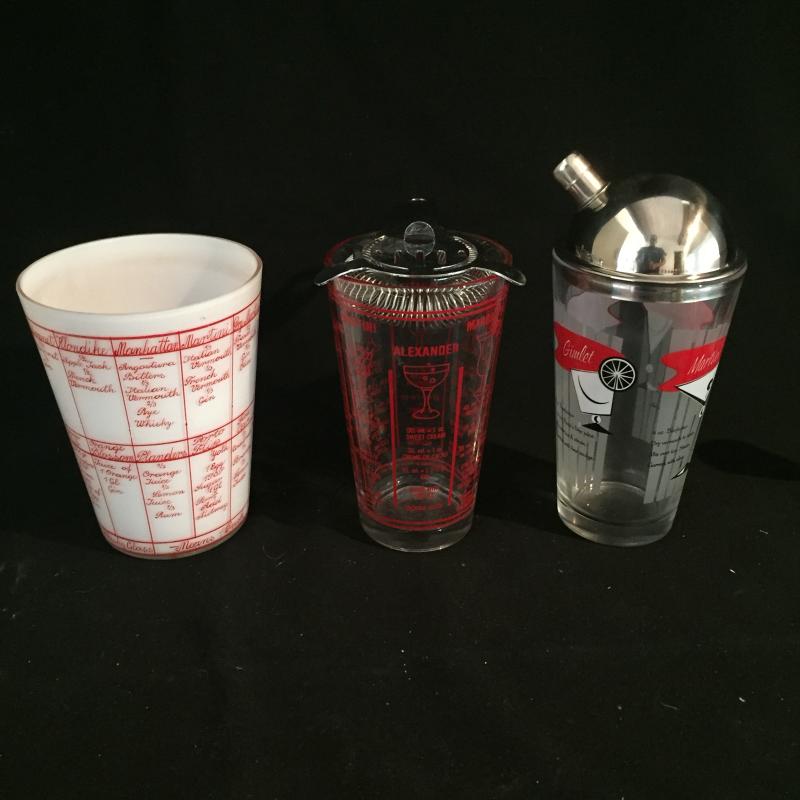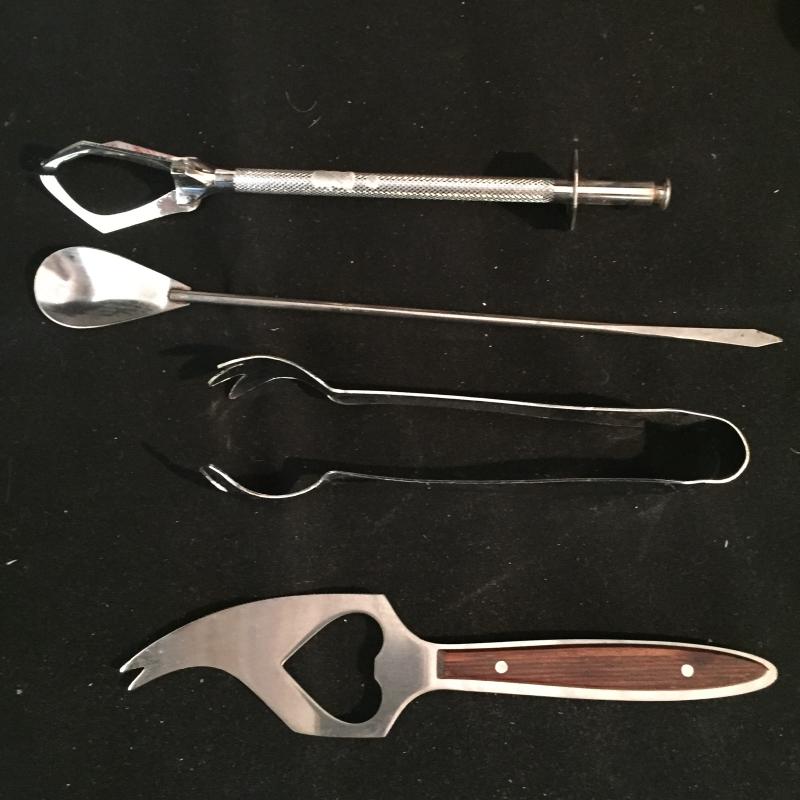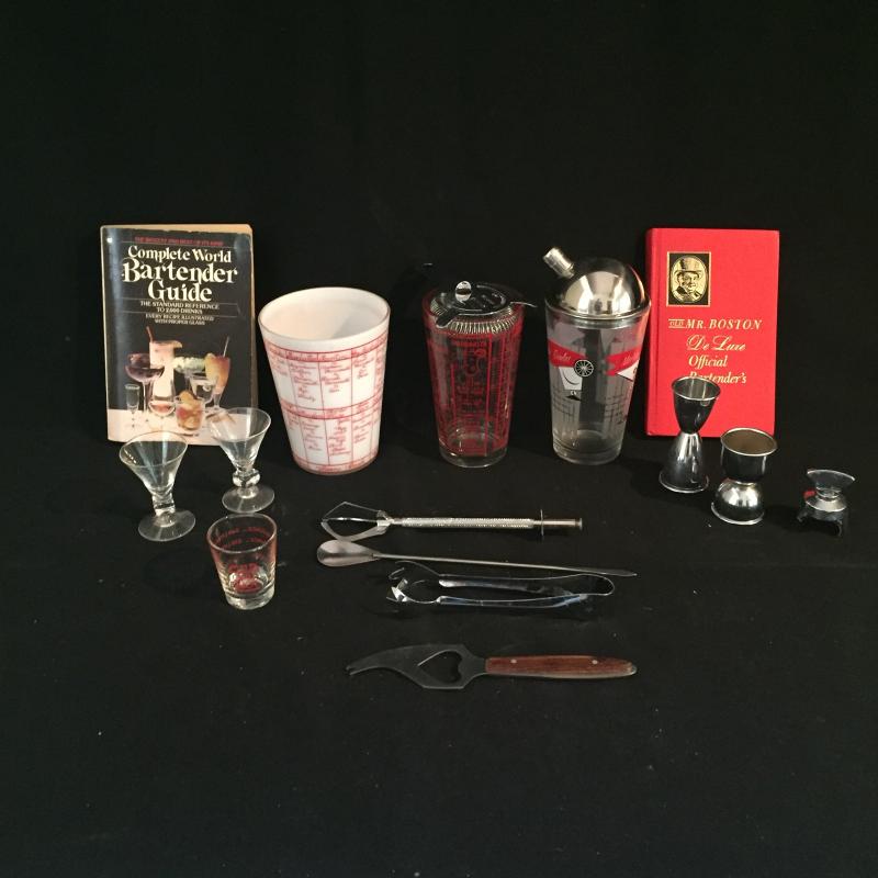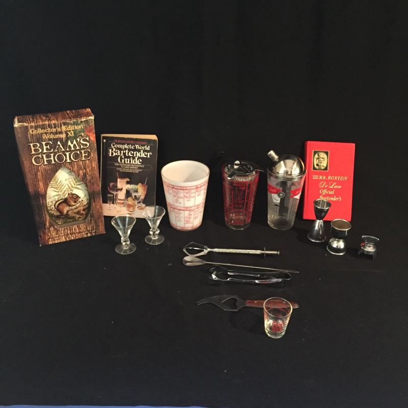Assortment of Bar Utensils and Bartender Guide. Lot includes Jim Beam Decanter in Box with James Lockhart Art (Bottle is full and seal unbroken). Enjoy making all types of libations. Local Pickup Only