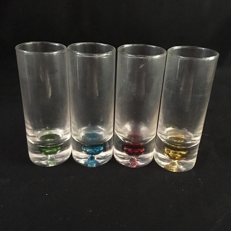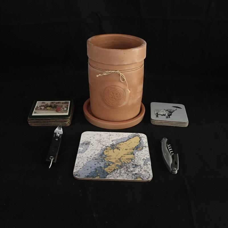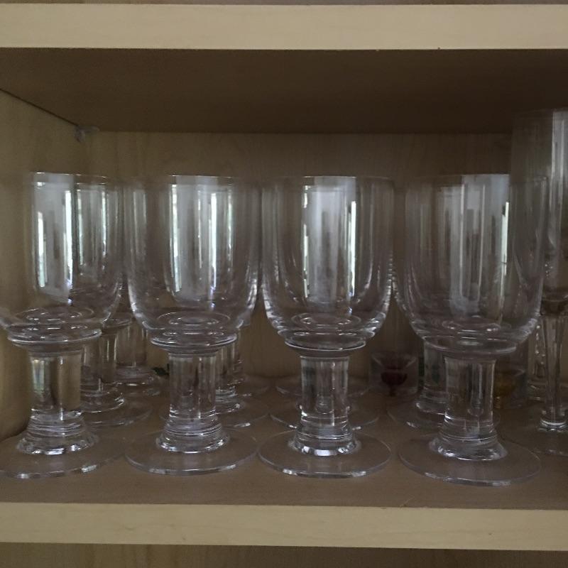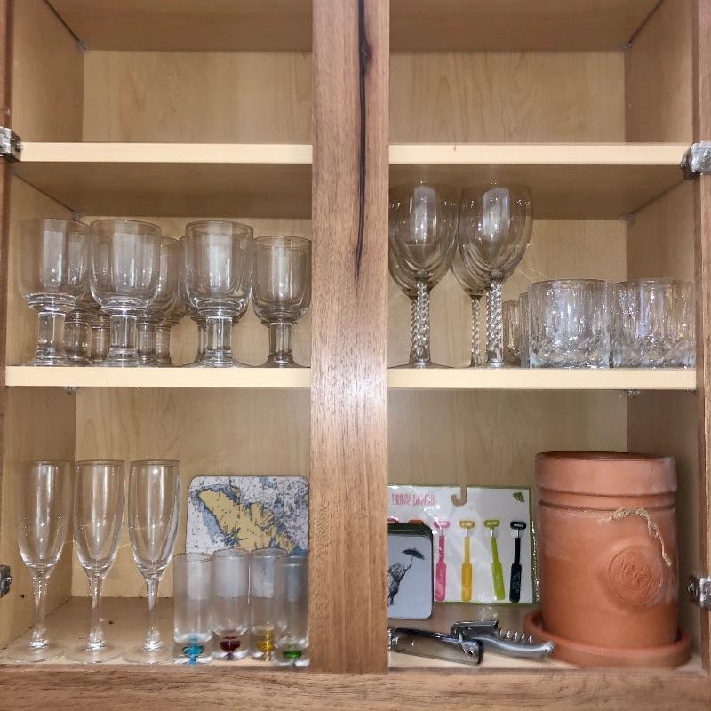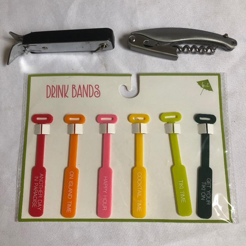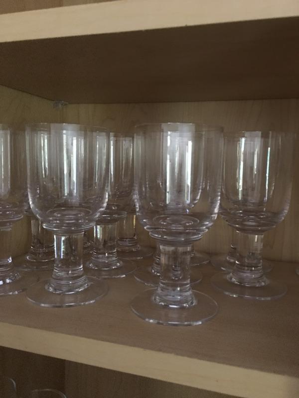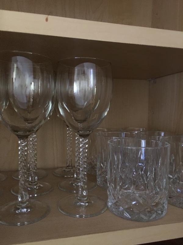 Barware lot includes terra cotta wine chiller, coasters, wine opener, a variety of glasses that includes three champagne flutes, four small glasses with colored bottom, six old fashioned glasses, eight wine glasses and ten stemmed glasses.