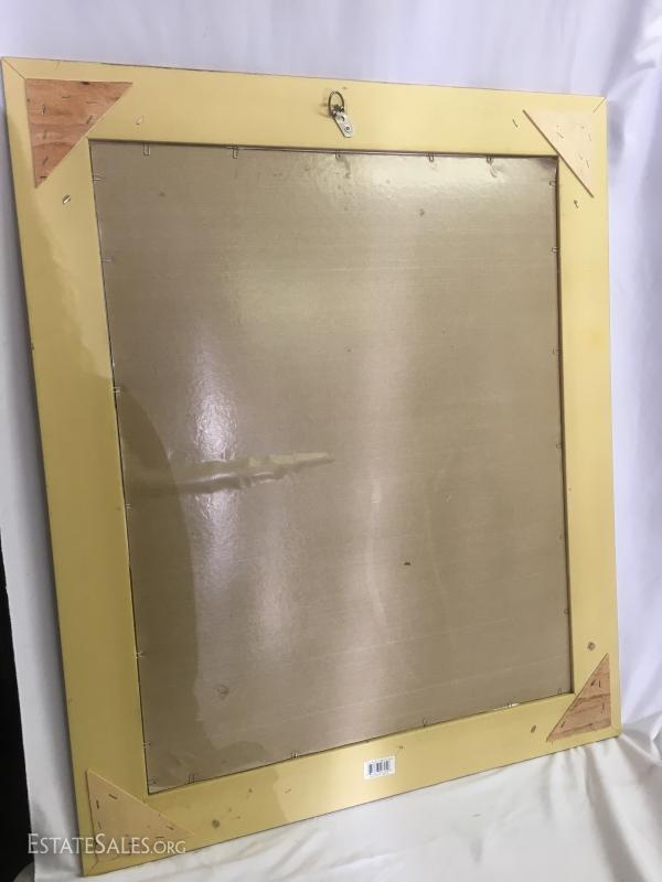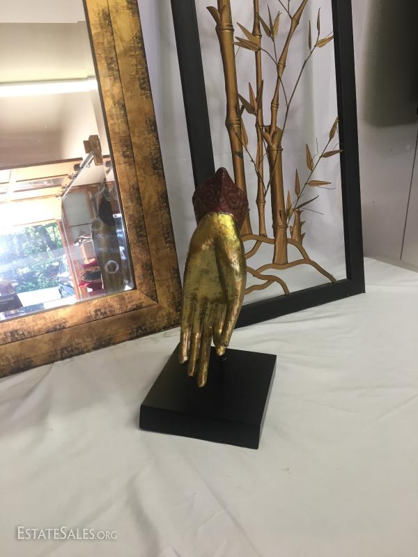 Gyana Mudra carving and stand. Measures 13.5" tall. Gold and black detailed frame of beveled mirror. Measures 30.5" X 38". Black wood frame of metal bamboo and bird art. Piece measures 42" x 14". This lot is avaiable for local pick up in Waynesville, NC only.