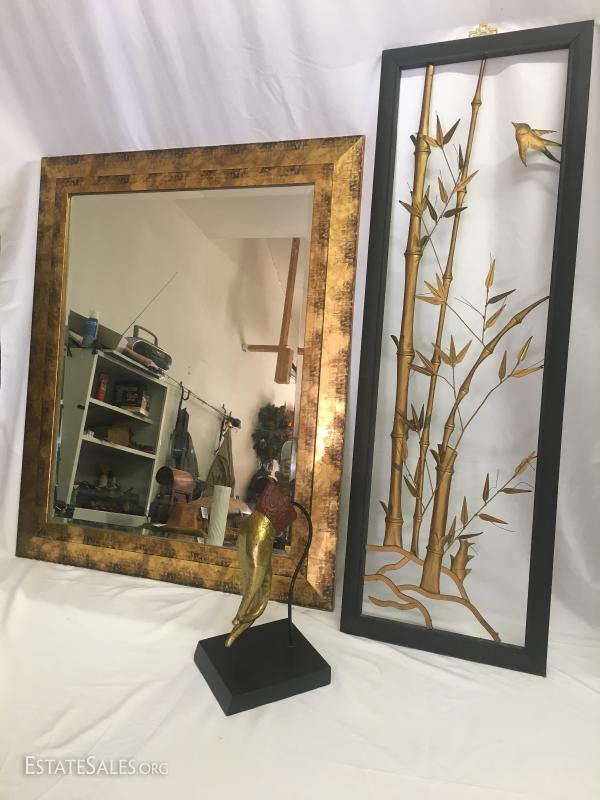 Lot 33 - Beveled Mirror, Metal Wall Art and Mudra Carving