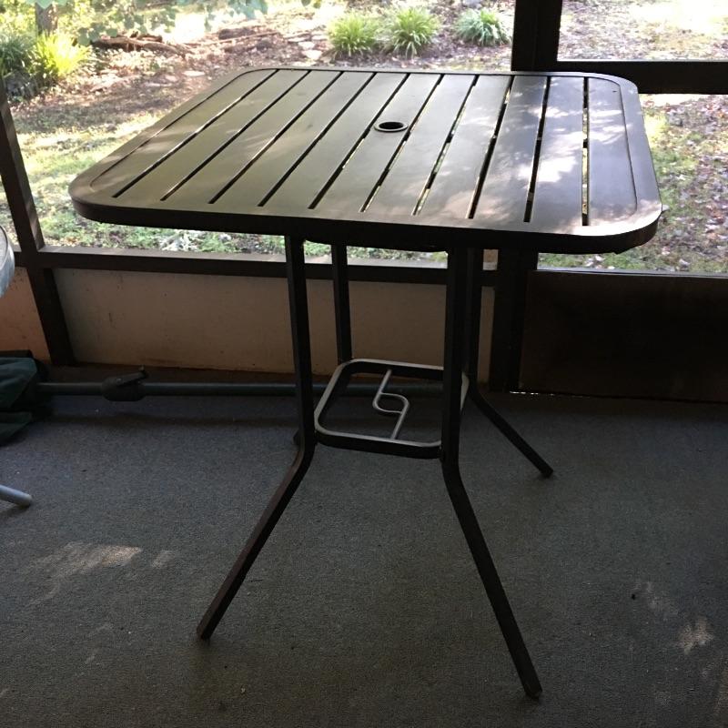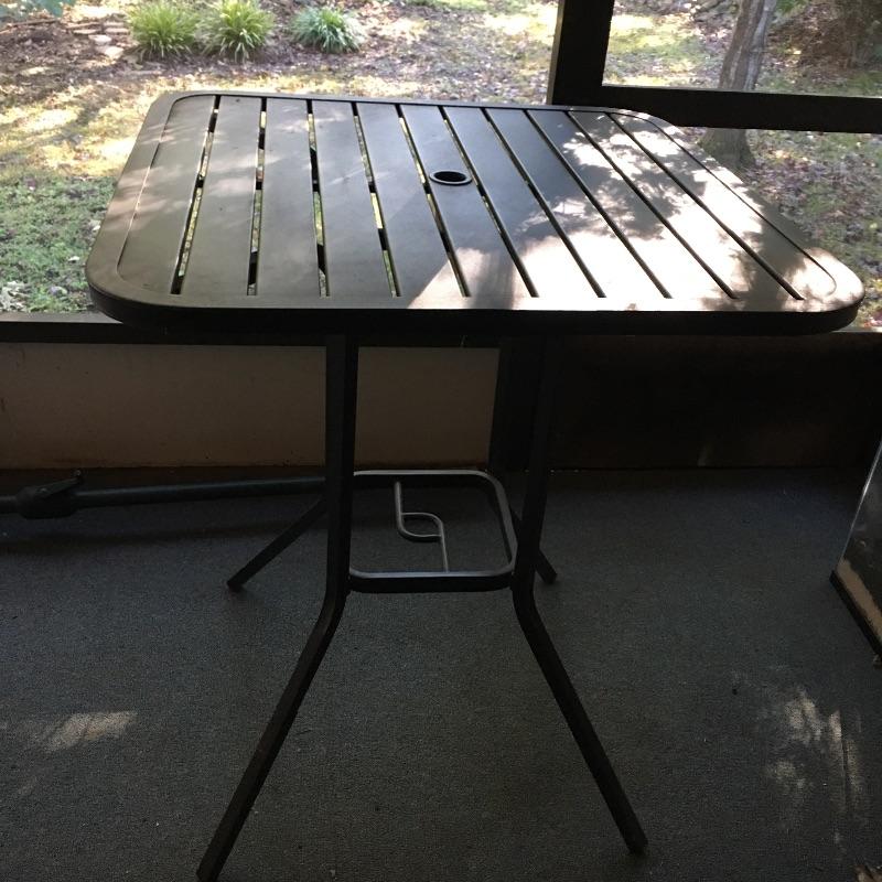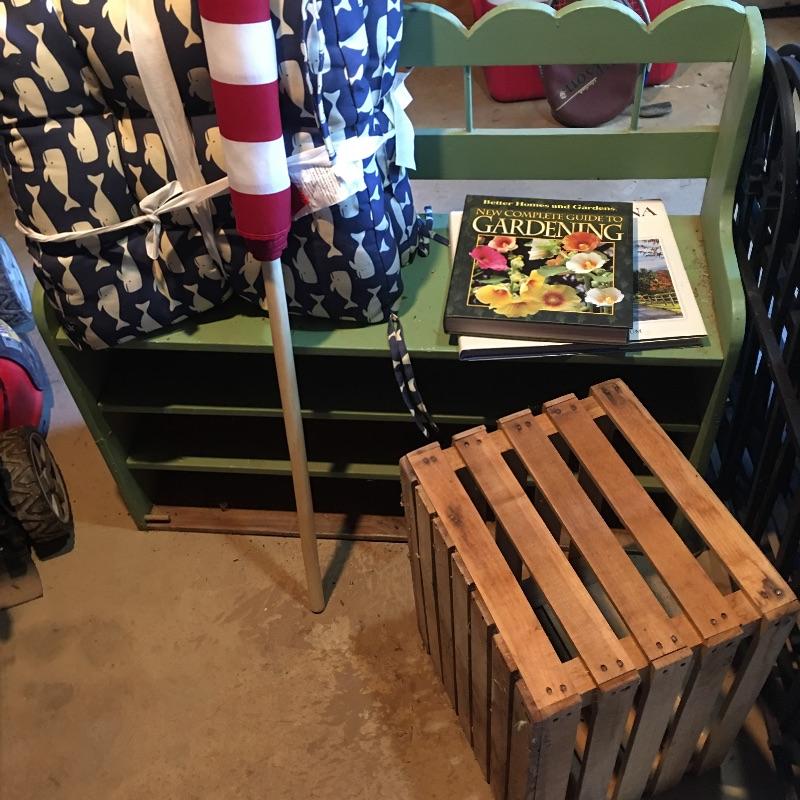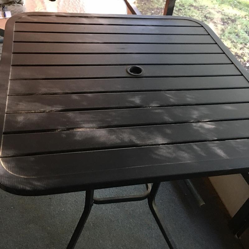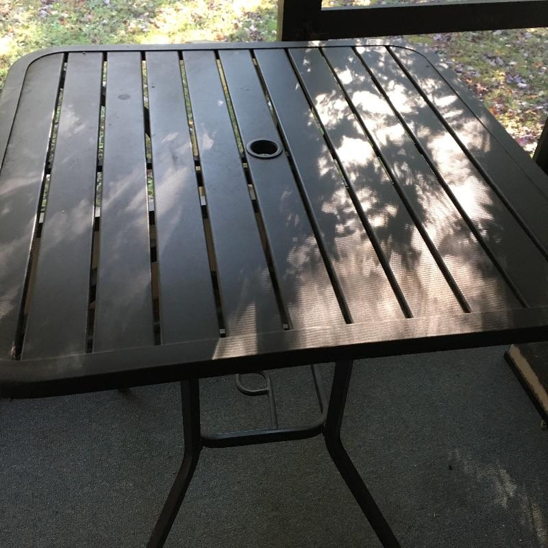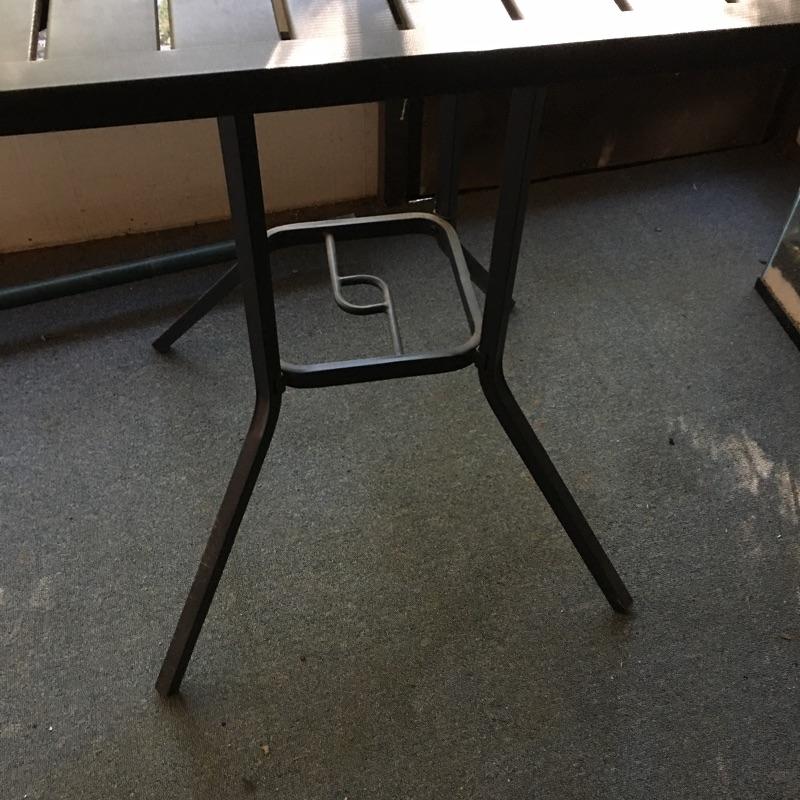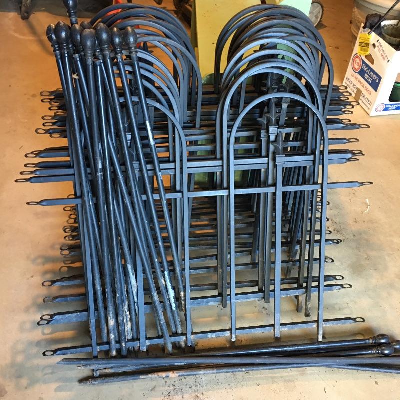 Lot includes sixteen black metal fence panels with matching posts, faux stone fountain, wooden bench and box, two seat cushions, sprayer, outdoor storage box and a bistro table. Fence panels measure 37” x 30” (16 pcs.), bistro table measures 33” x 33” x 39” and storage box measures 24” x 46” x 24”.
