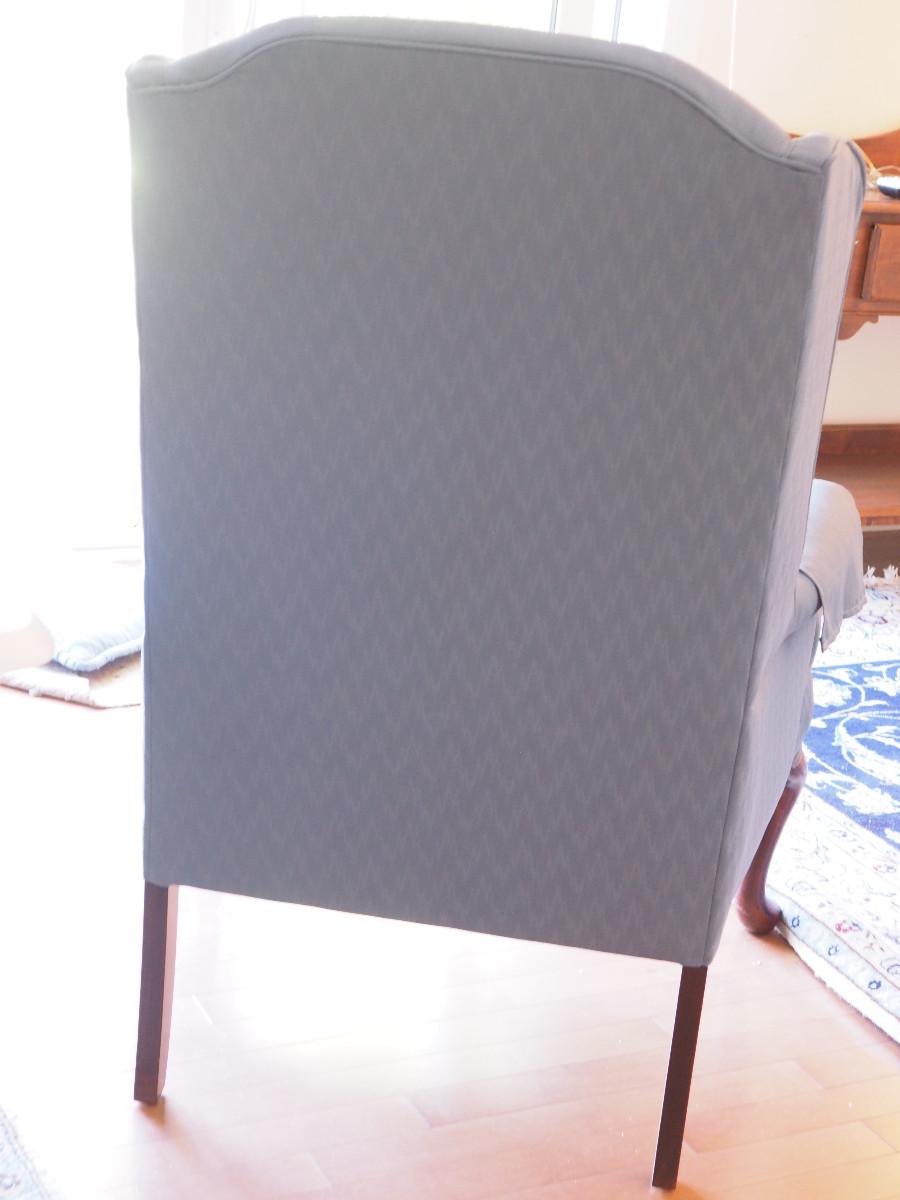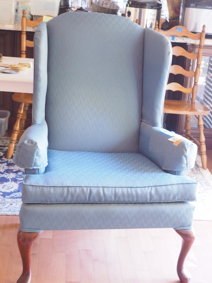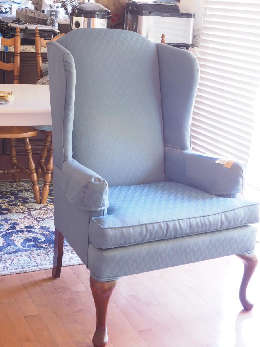 Lot 33 Blue armchair Matches Lot 026:Study comfortable chair 31 X 29 x 45. High back and arm covers.
