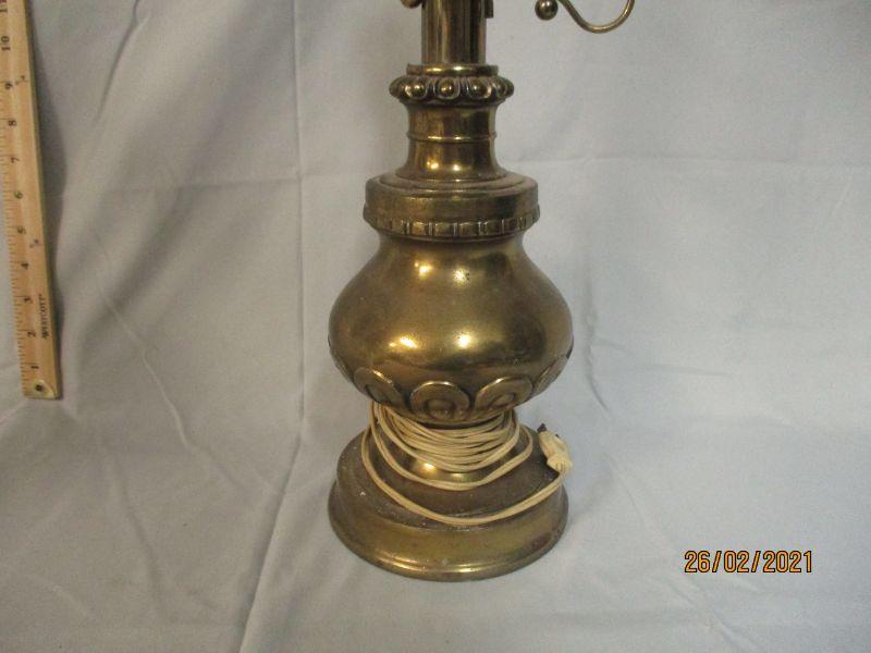 Very nice lamp with some embellishments. Consignor states that it works and to me it just needs to be cleaned. It stands 25" tall to the top of the finial.