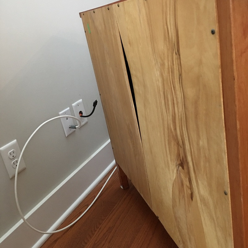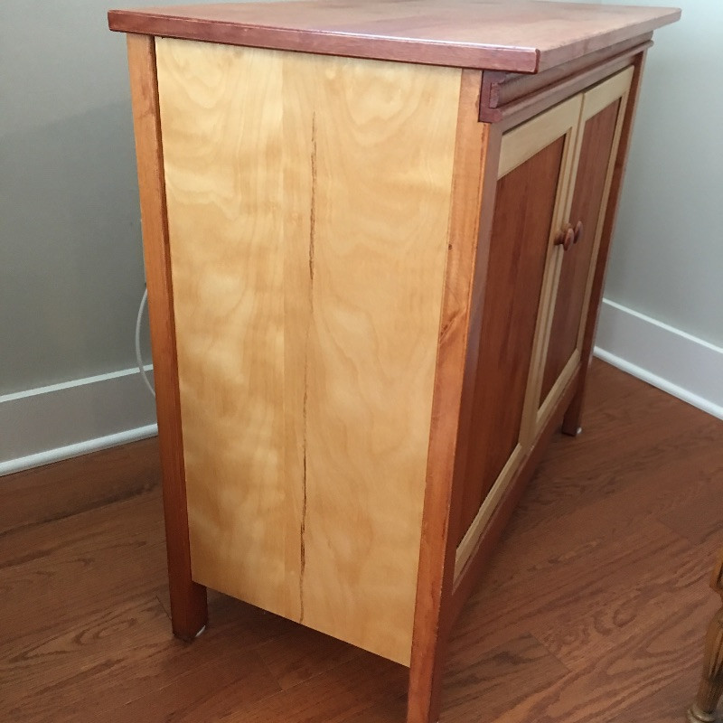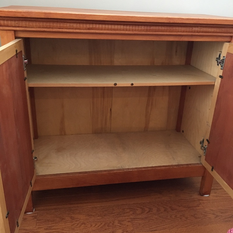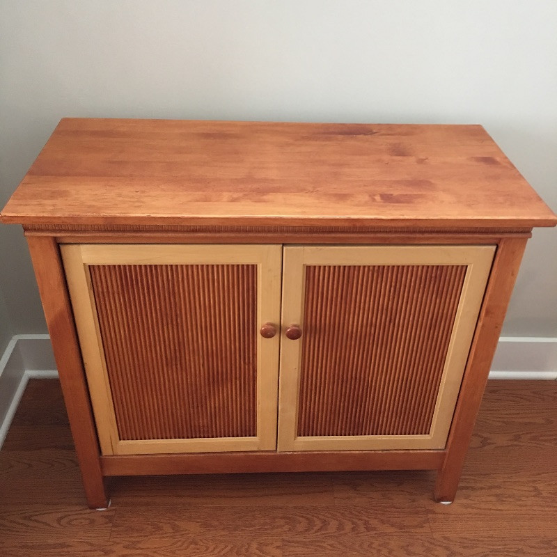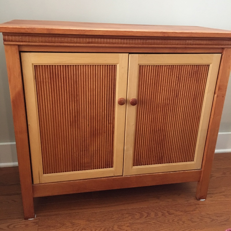 This wooden cabinet has simple, stylish Scandinavian style elegance. A unique two toned light wooden cabinet that offers great storage space and could also be used as a tv stand. Please note the backing of the cabinet is two pieces of plywood that are separated a little at the seem. It is still fully functional, see images. Cabinet measures 16.5” x 35.5” x 31.75”.