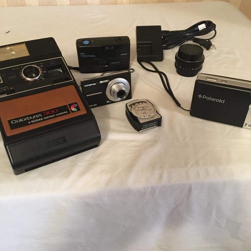 Cameras lot includes Kodak colorburst 300 instant camera, Olympus FE -20 digital camera, Ansco Pix Panorama, Polaroid Zink , Argus meter and a Pentax lense. All cameras were not tested.