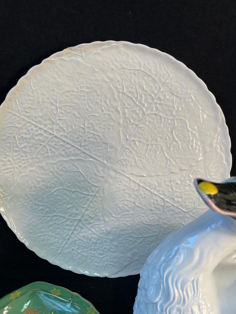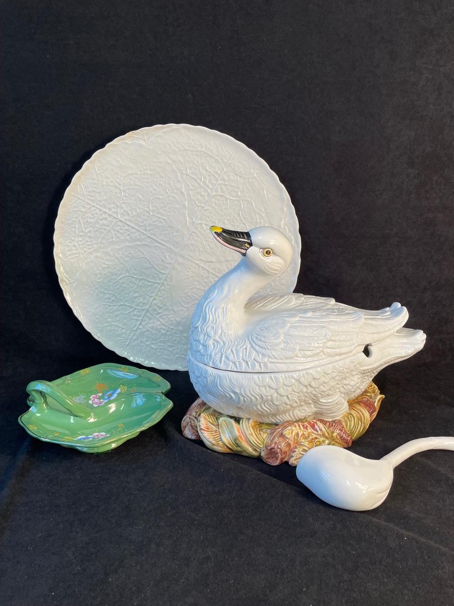 Goose-shaped soup tureen, ceramic platter, and antique candy dish
