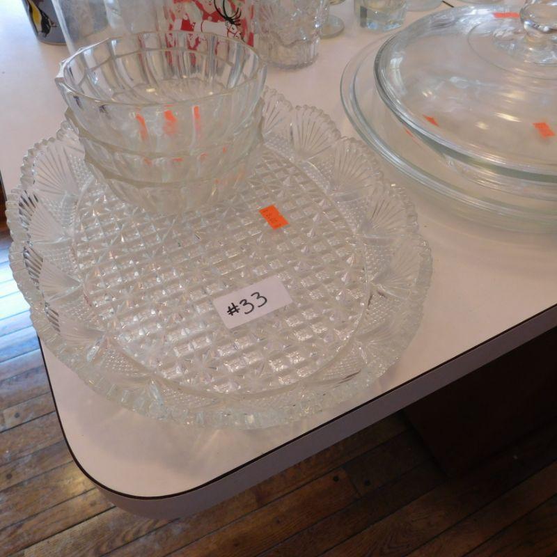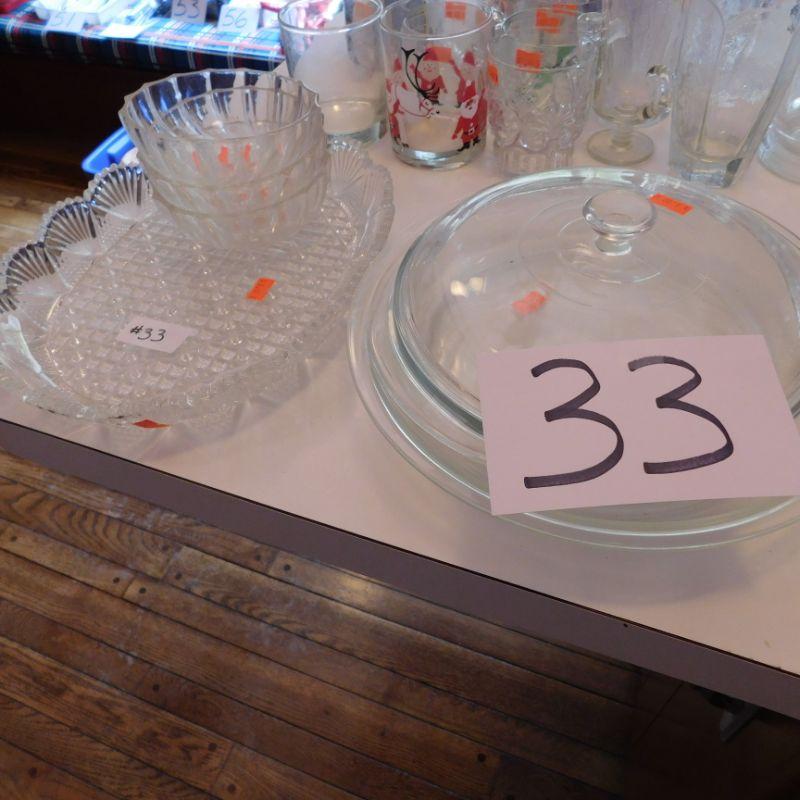 Lot 33 clear glass cookware and serving platter +3 small bowls