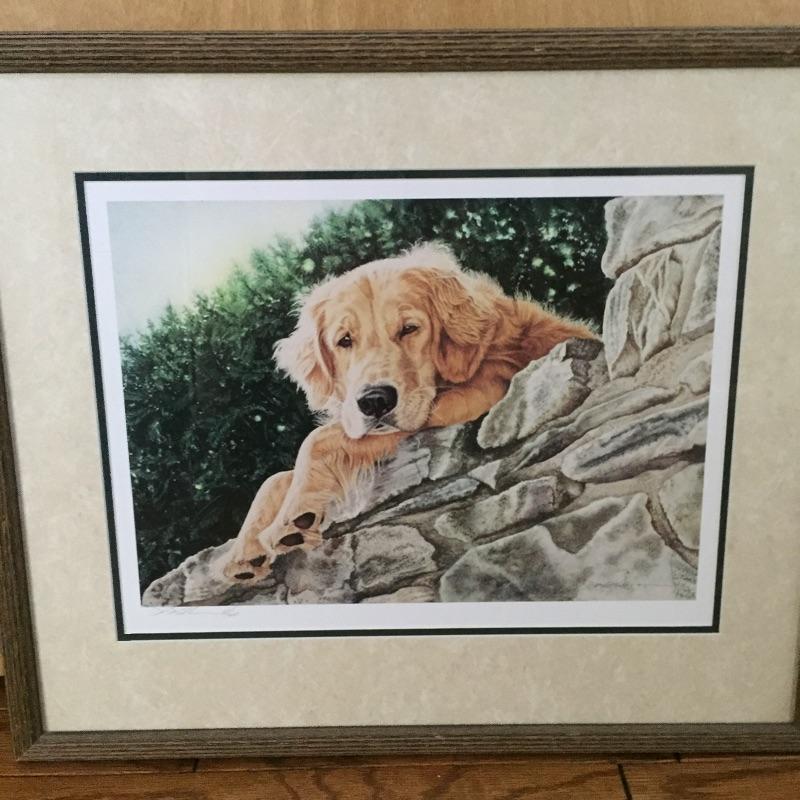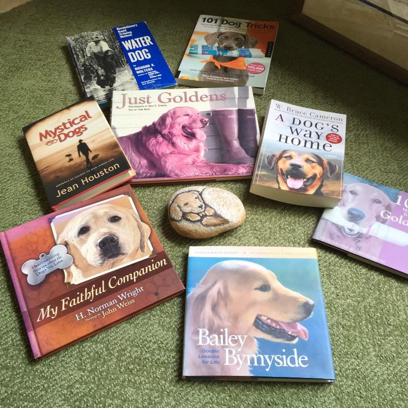 This collection includes a lovely framed and numbered print of a Golden Retriever. Artist unknown but it is numbered 69/700. Also included are a collection of books about and for dogs and a cute painted stone.