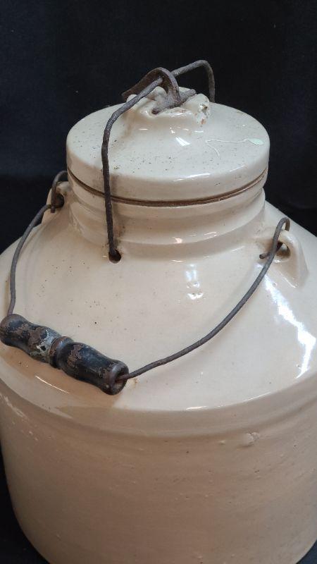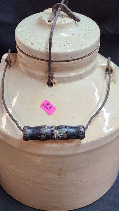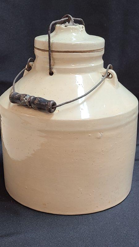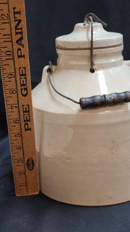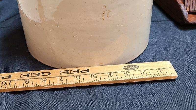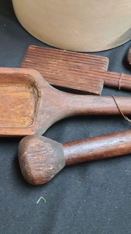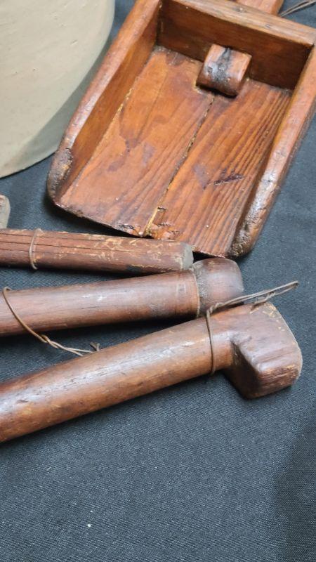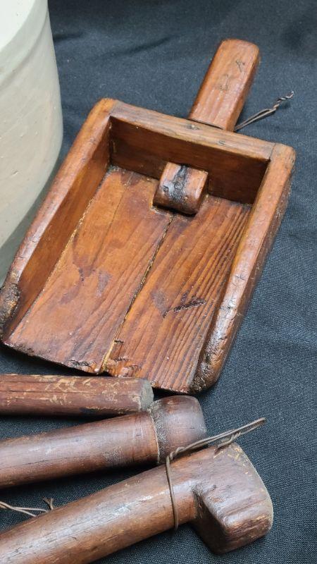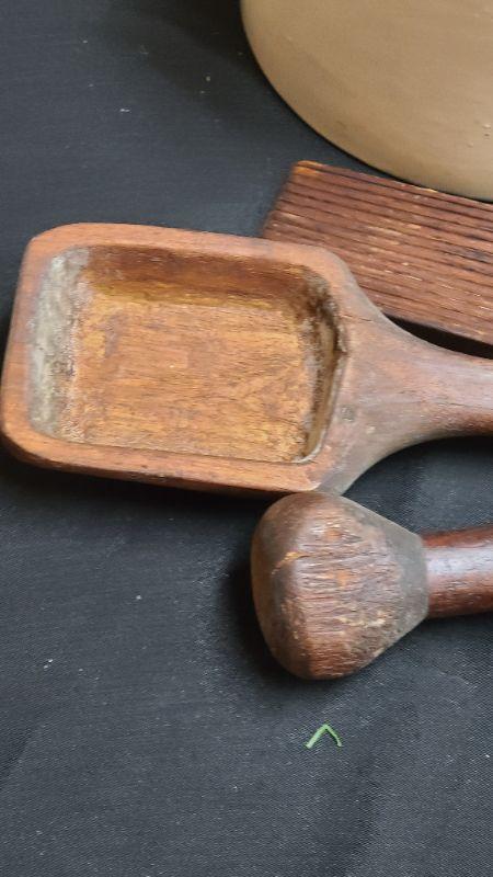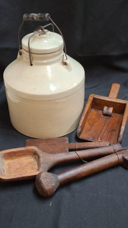 Unique crock, unopened. Large, 12 inches in size. Primitive wood kitchen tools as-is. Please see all pictures for condition of the items listed and what is included in the lot. Pictures will also show any measurements if taken and is the best representation of the items. Thank you for looking and have fun bidding! We appreciate Treasure Hunters!