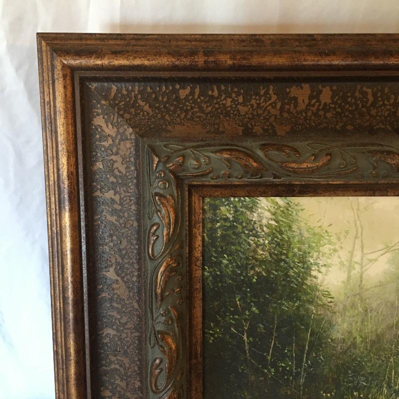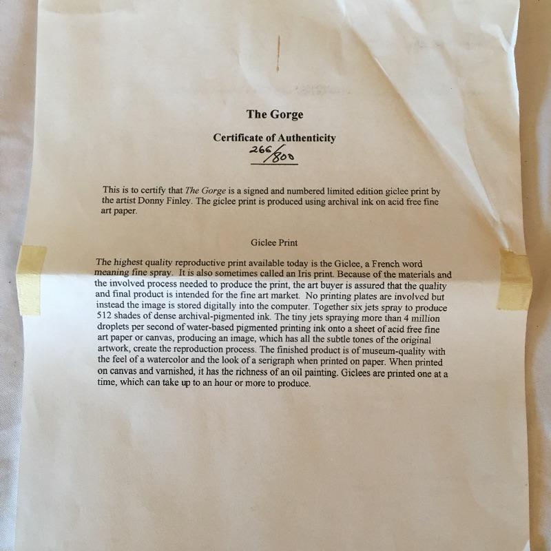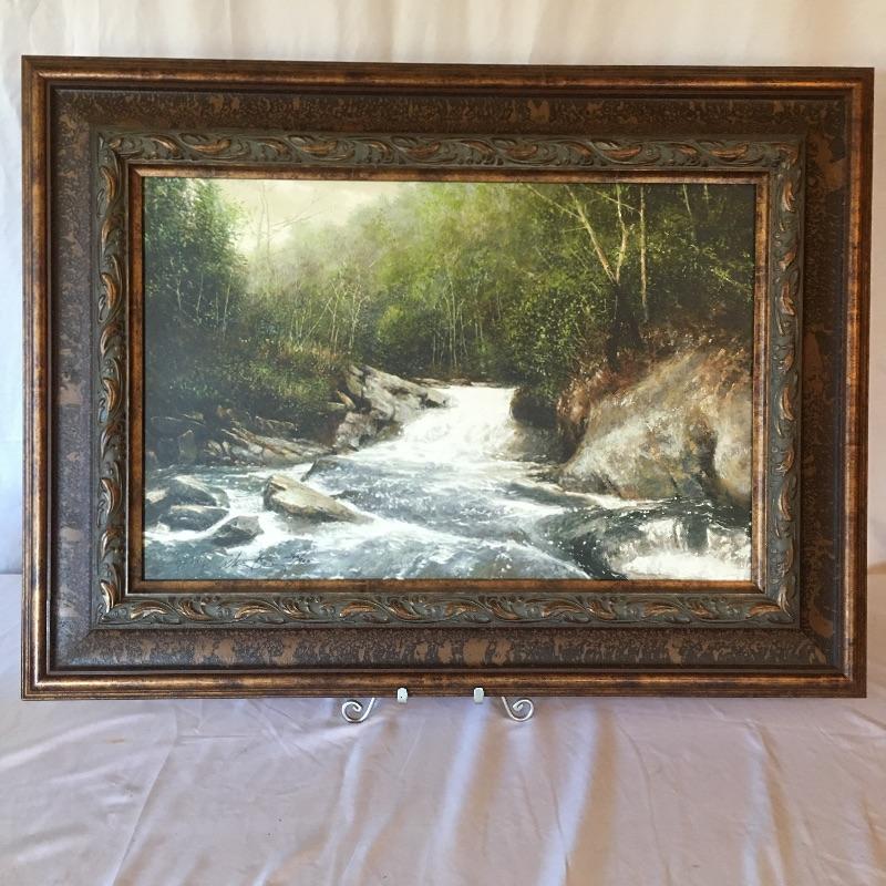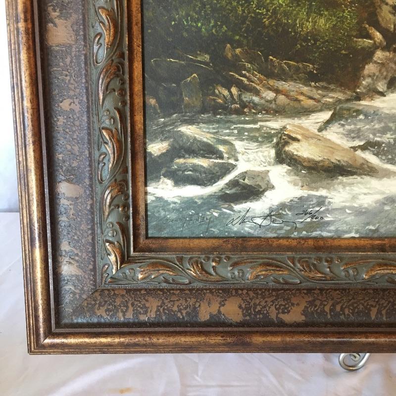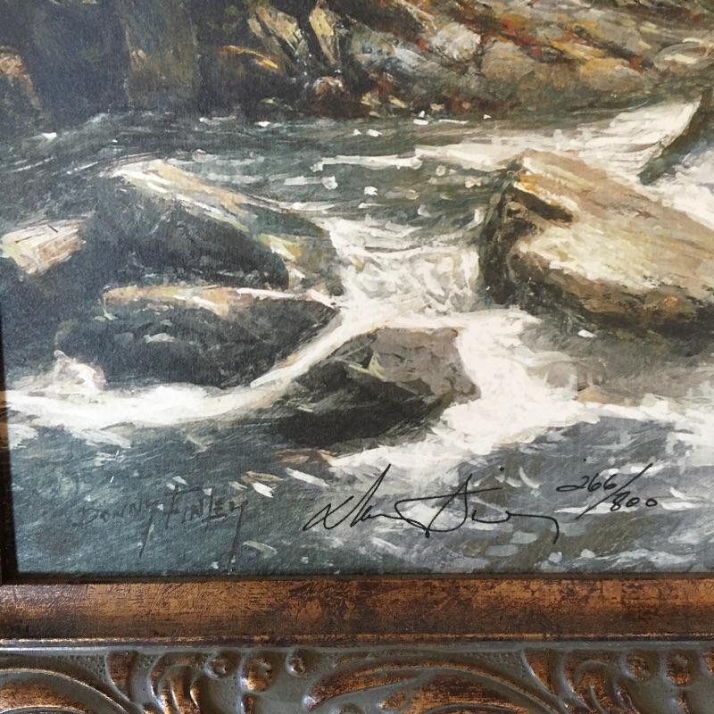 This signed and numbered Donny Finley Giclee print is titled “The Gorge” and comes is in a wooden frame with a intricate design that compliments this peaceful river scene perfectly. COA comes with this print.