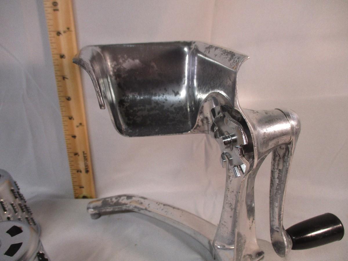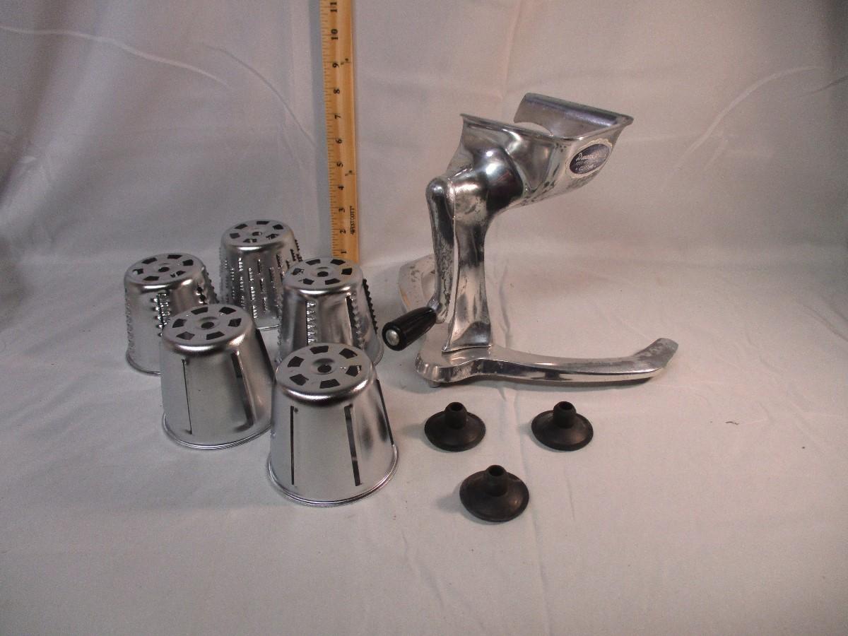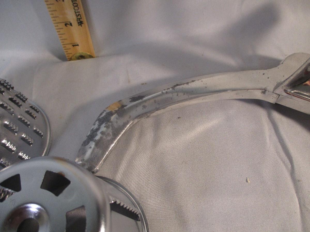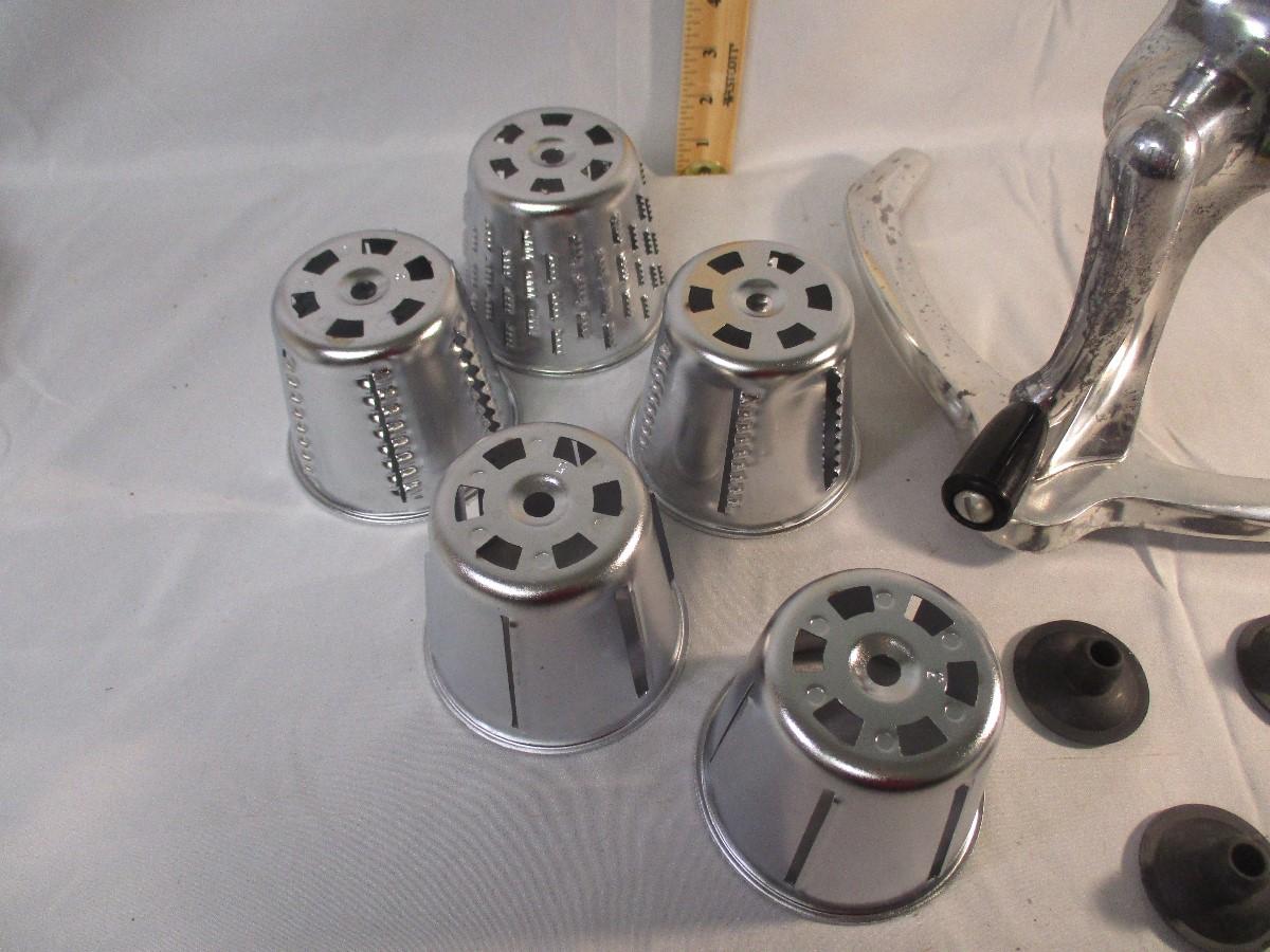 All pieces appear to be here and the inserts (blades) look super clean. The main body has discoloration to the metal, but that shouldn't interfere with it's usage. Think of the coleslaw you could make with this!