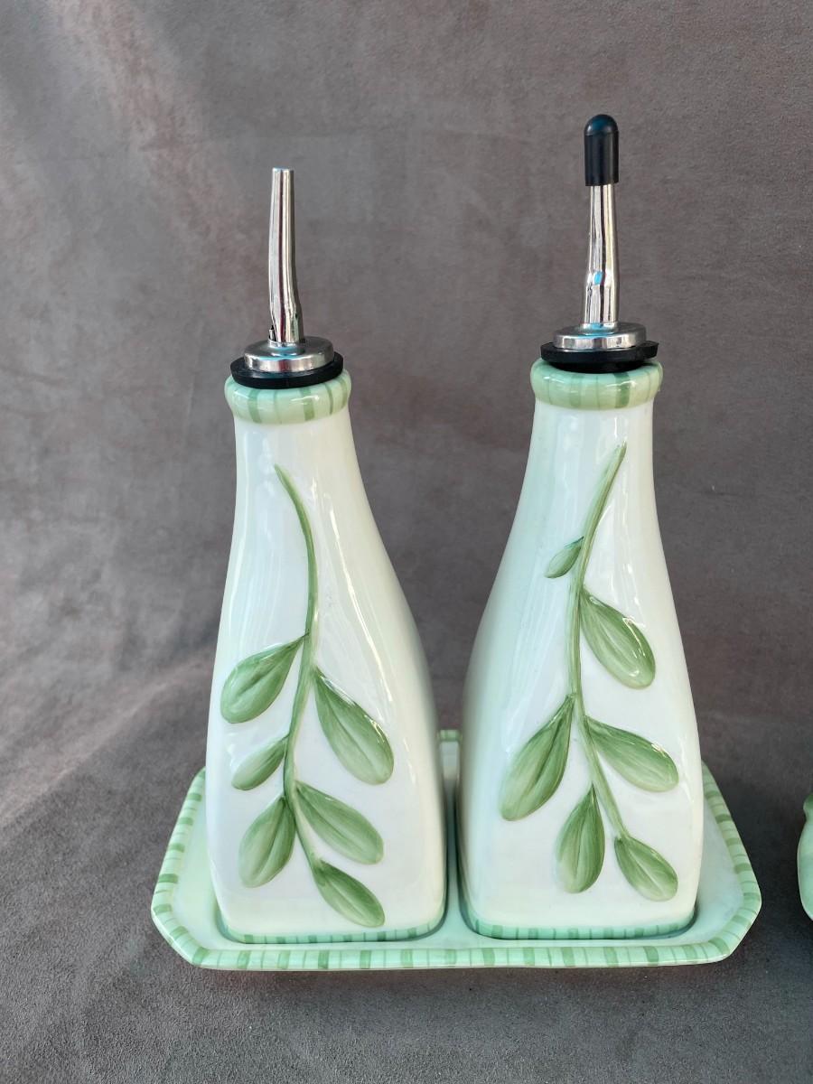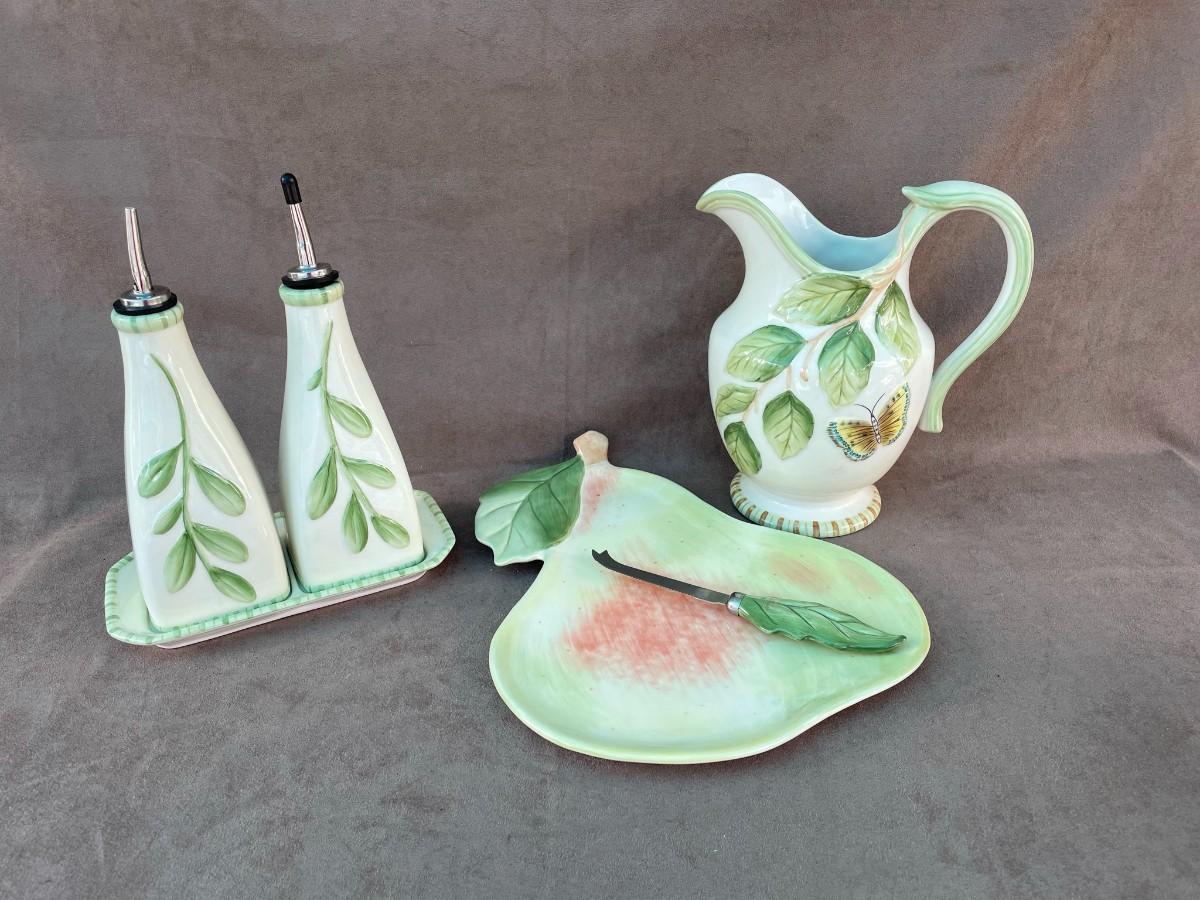 Includes Oil & Vinegar Set, Water Pitcher, and Pear-Shaped Cheese Plate w/ Serving Knife.