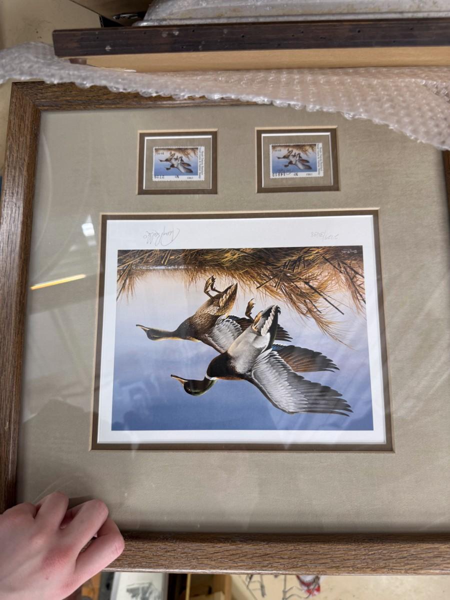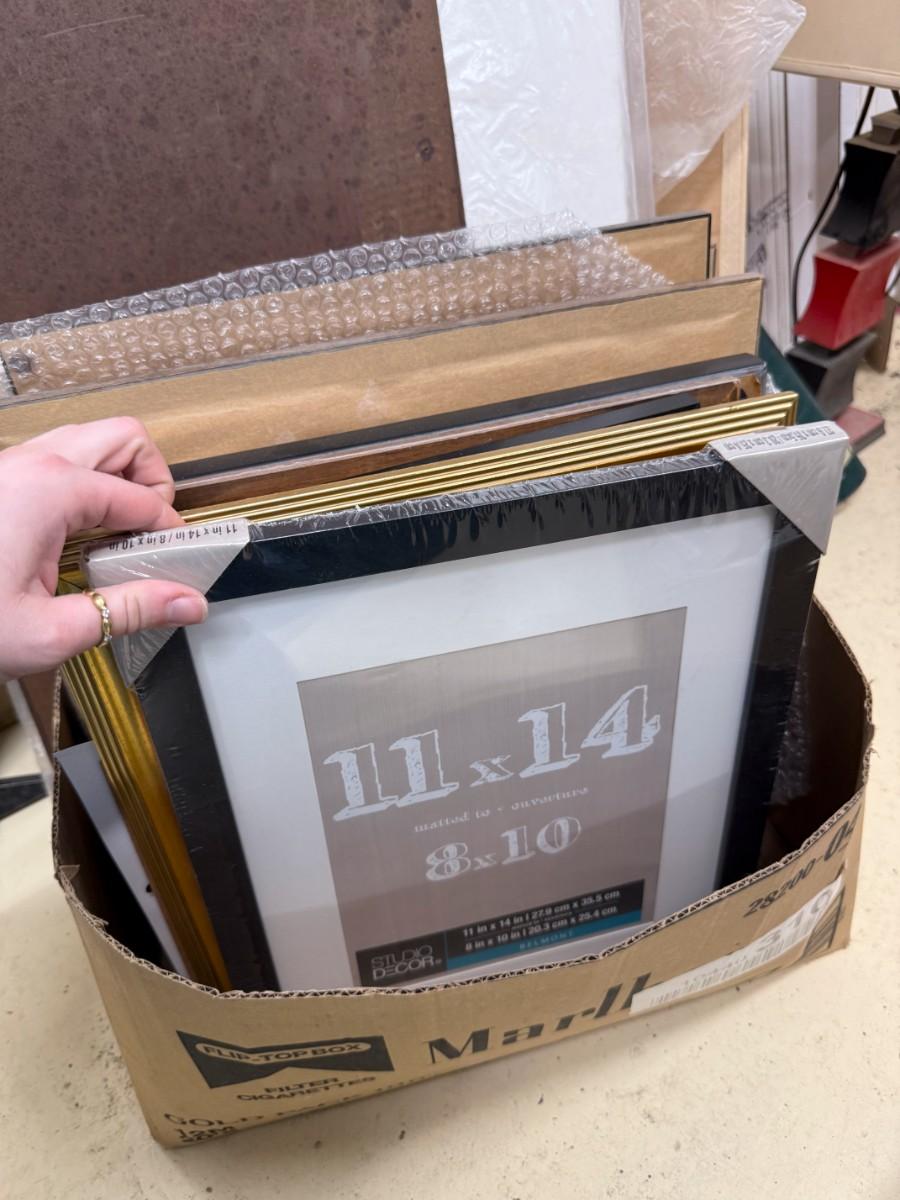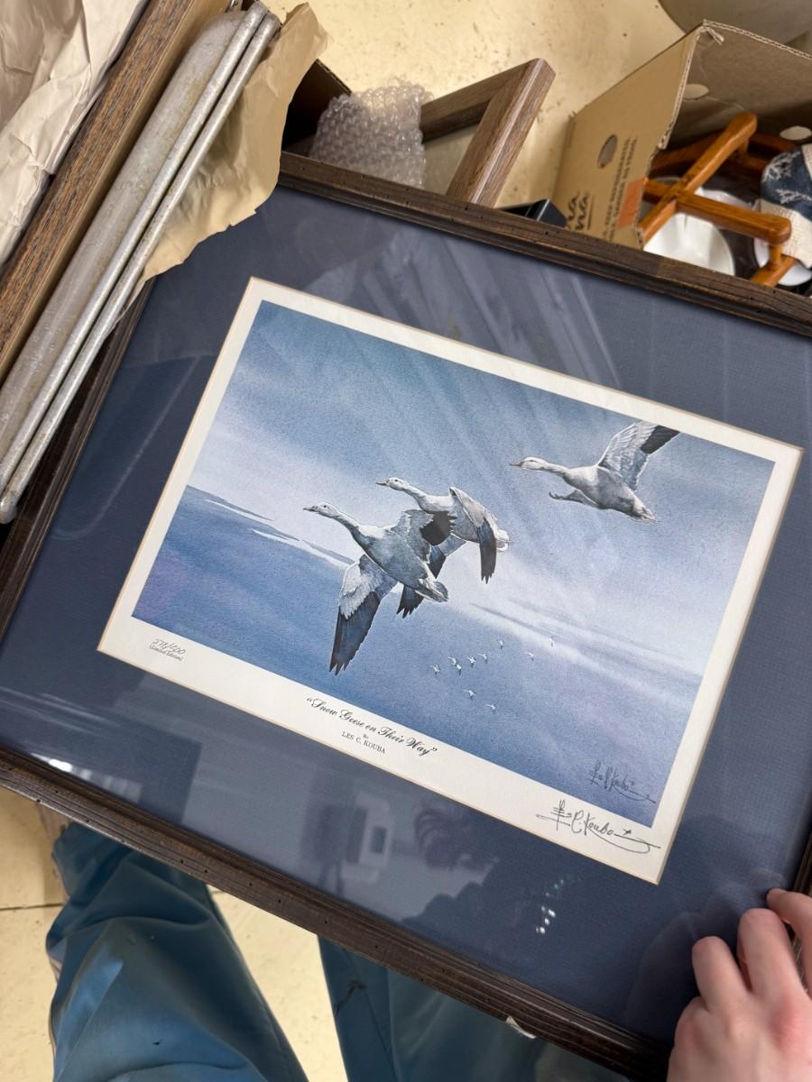 Mostly empty frames, some prints including Terry Redlin, large foam pieces in back