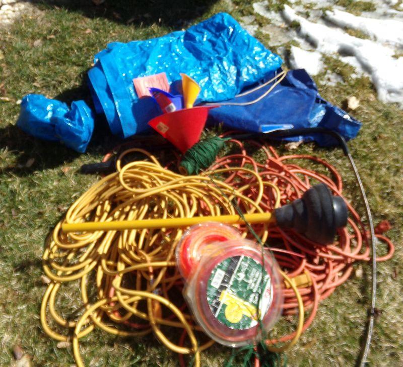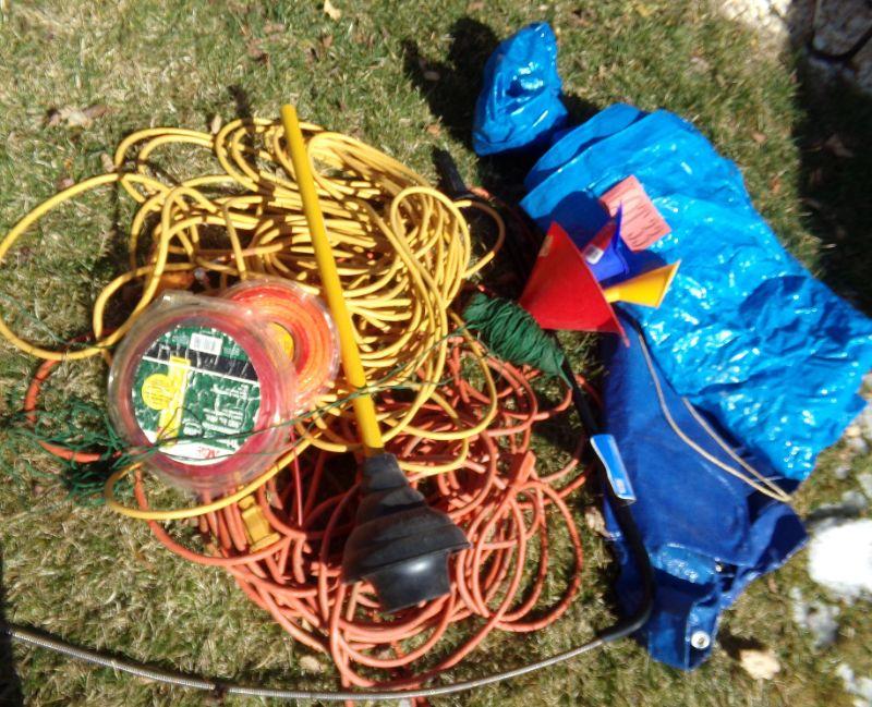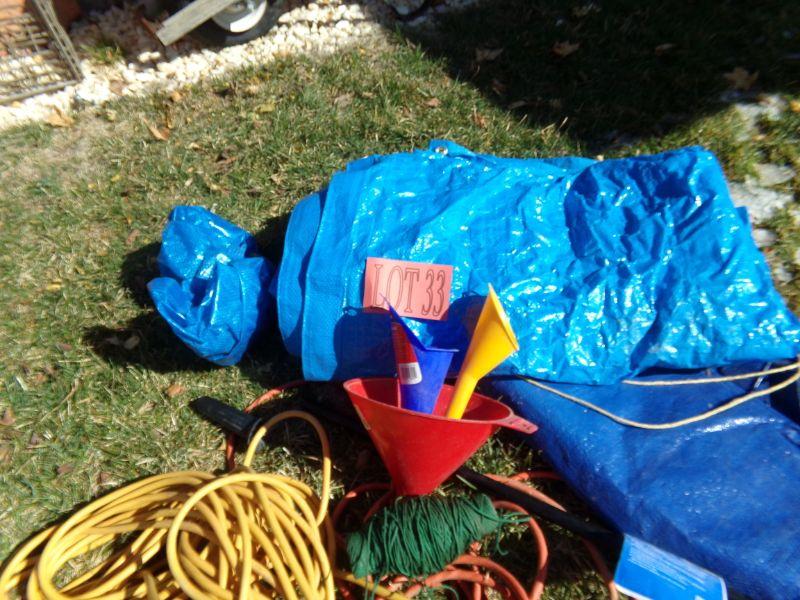 2 Tarps, 2 long extension cords, funnels, sewer line auger (snake), plunger and weed trimmer line