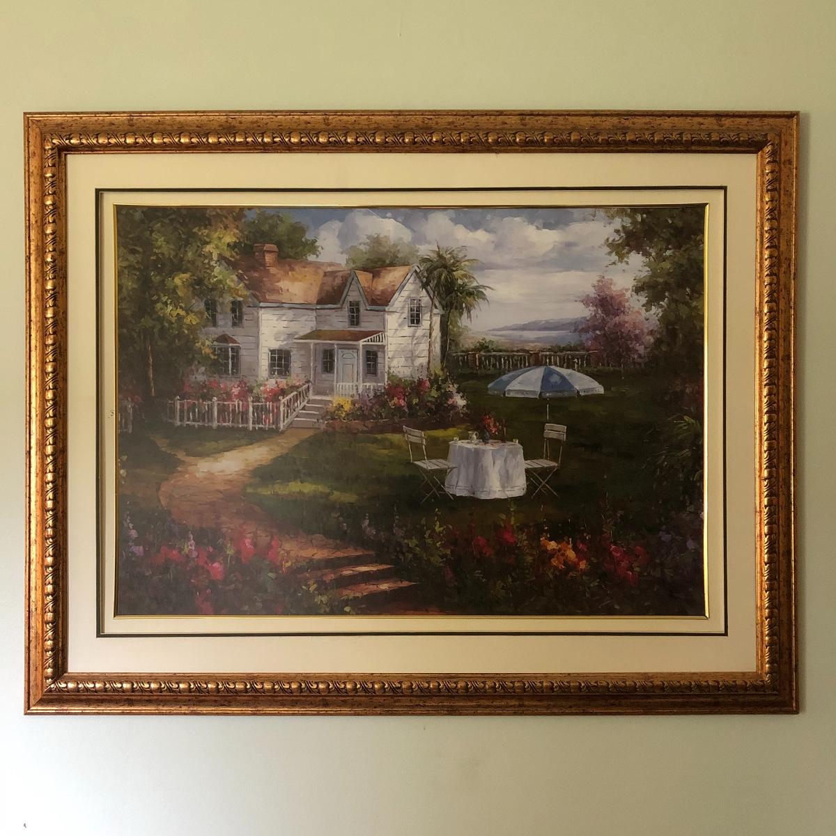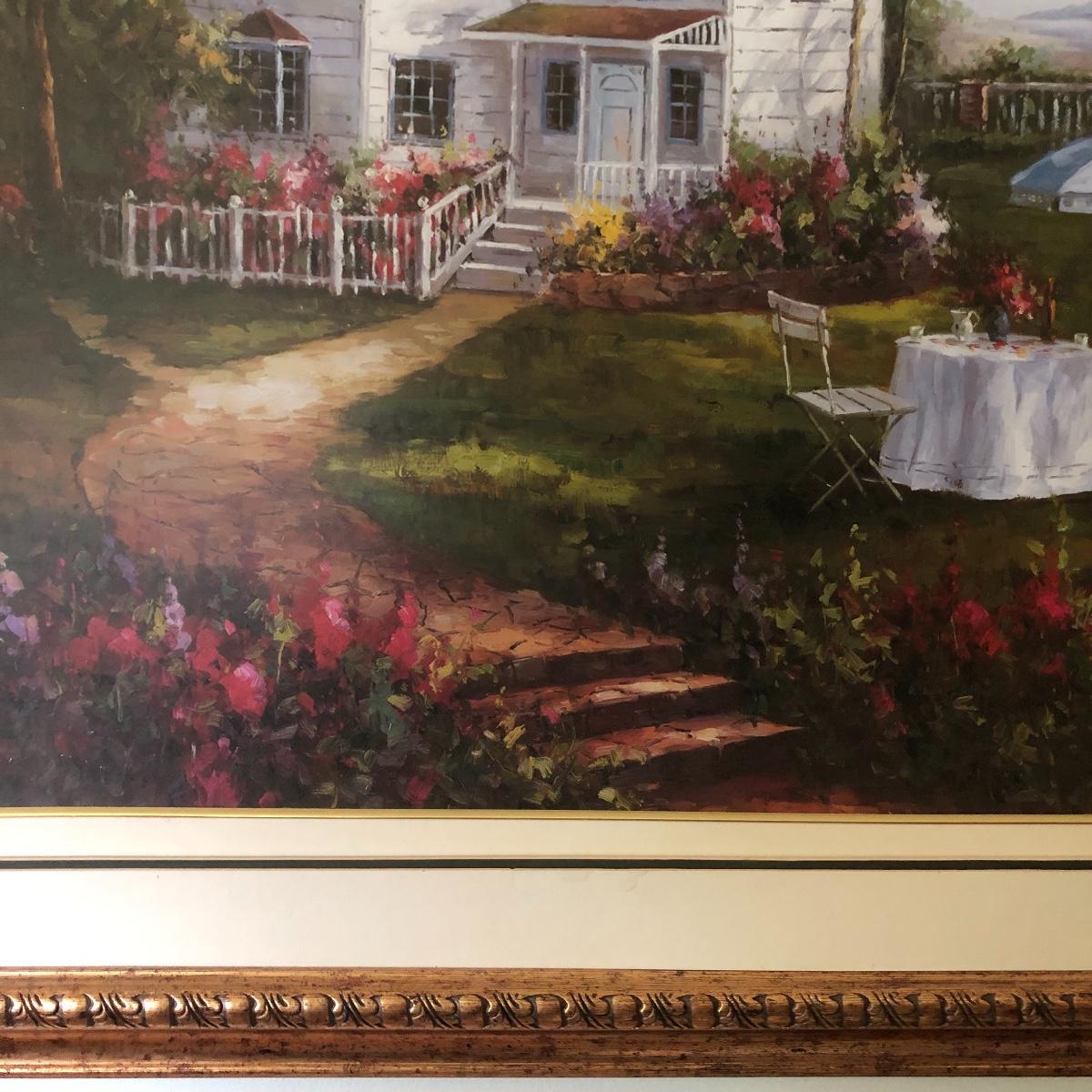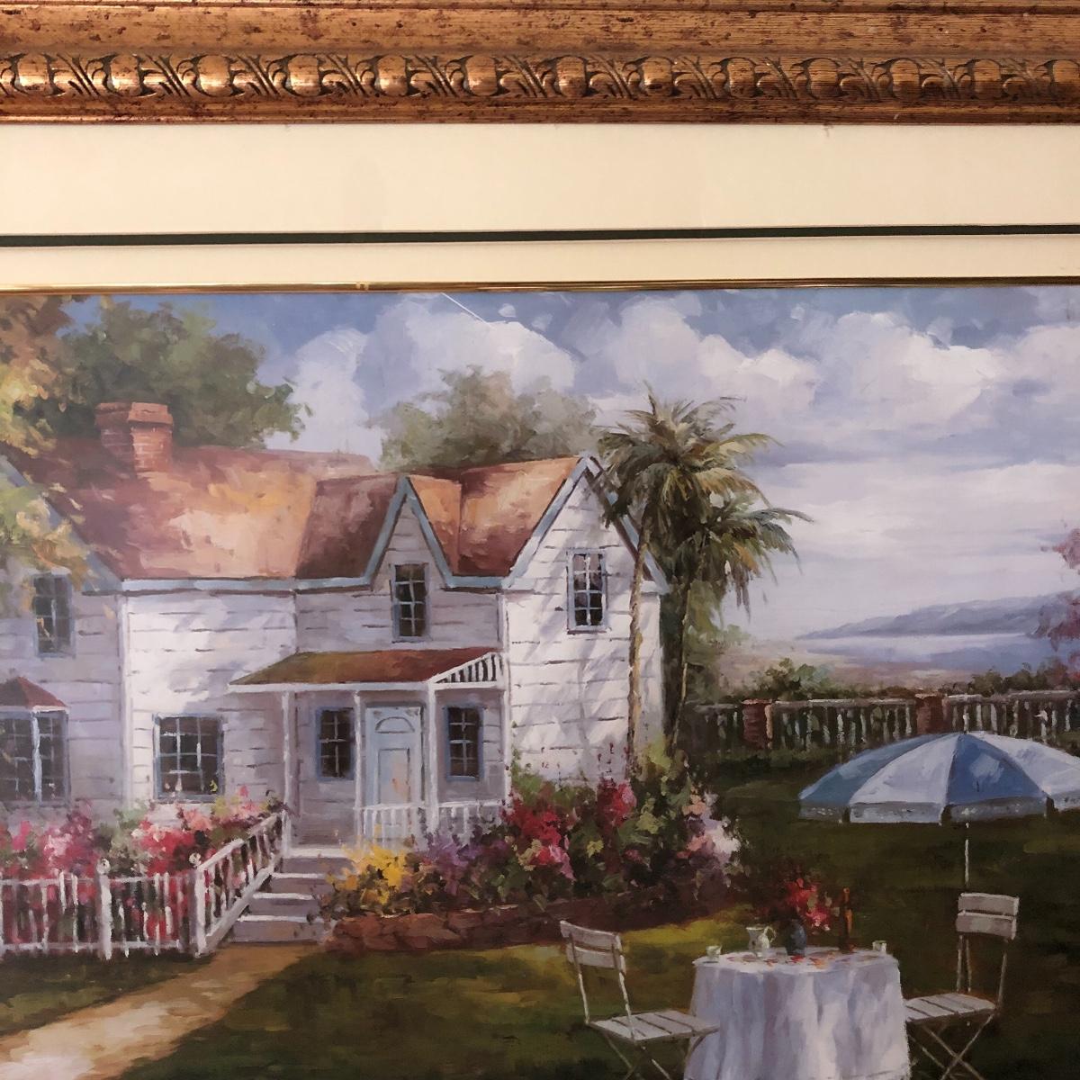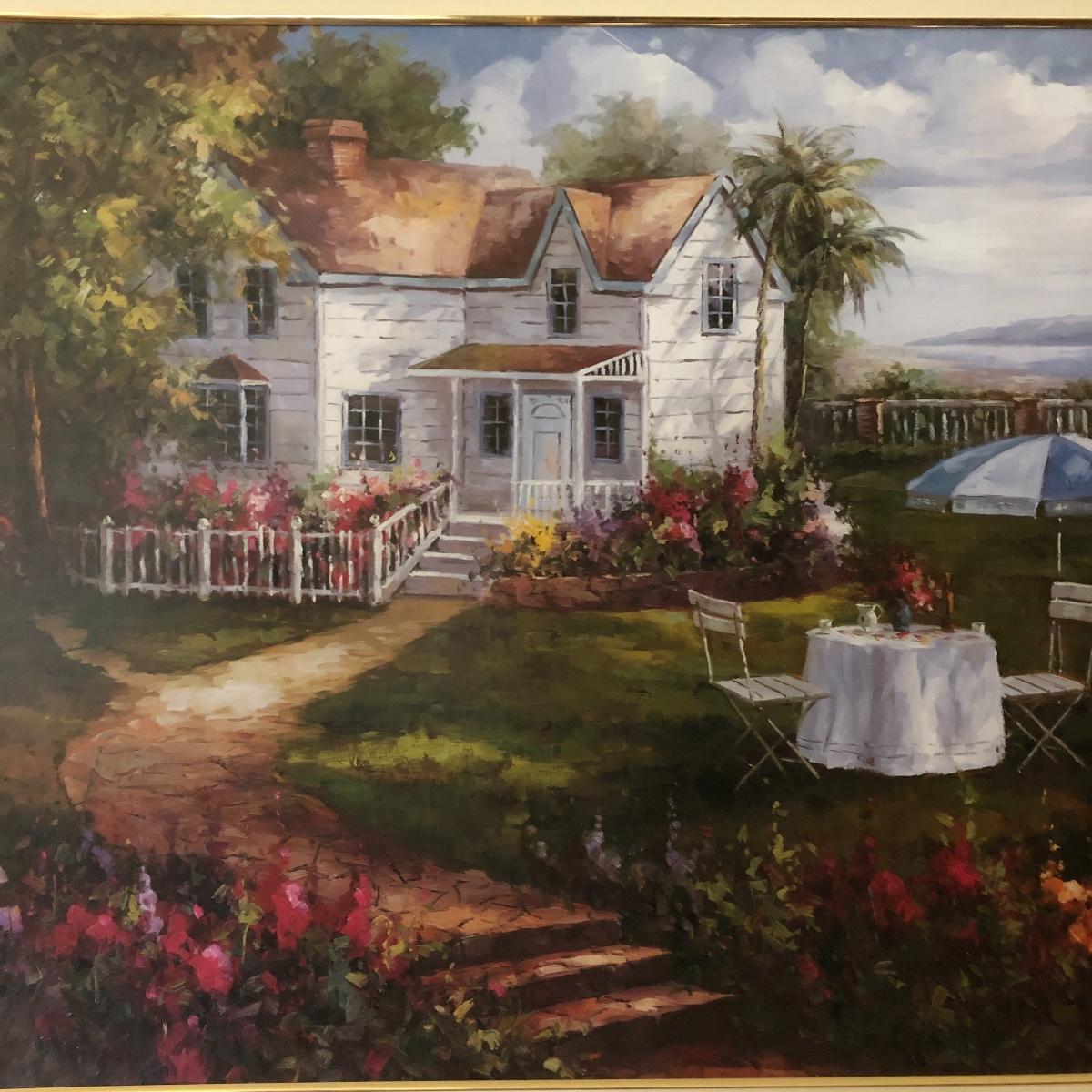 Painting of a home and garden, artist unknown. It is 41.5 inches by 32 inches and sits in a gold frame with paper framing another two layers in.