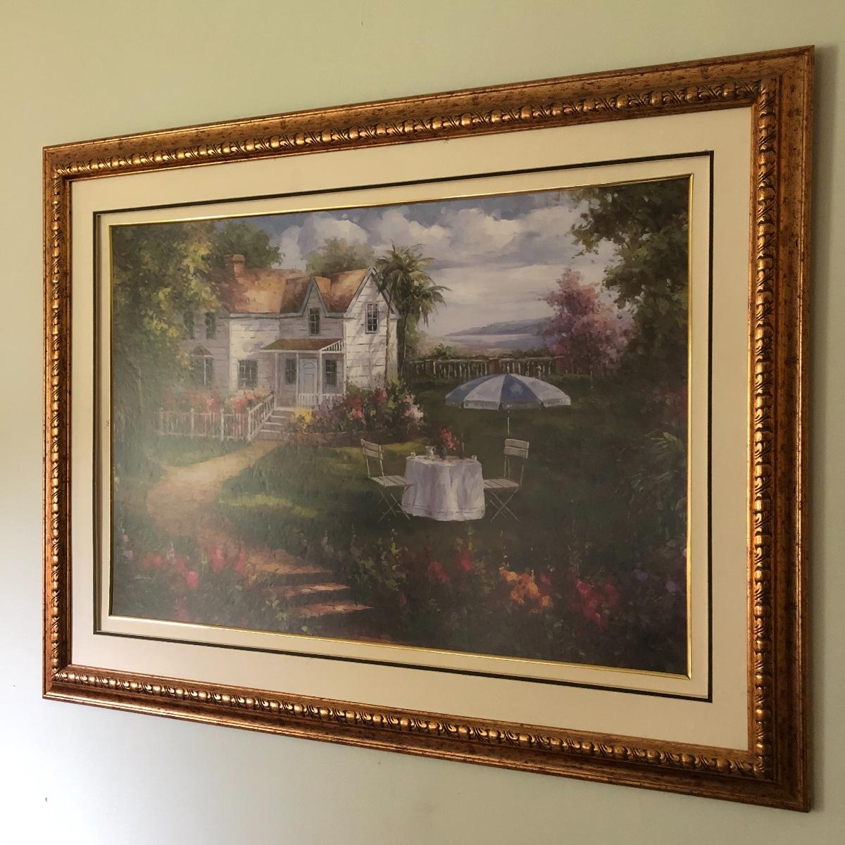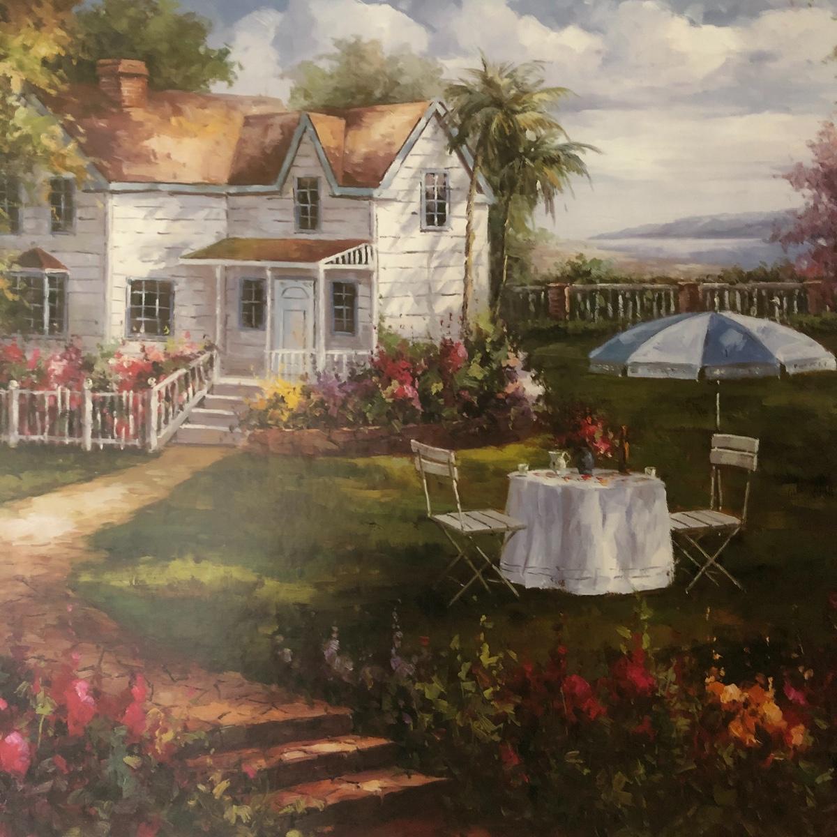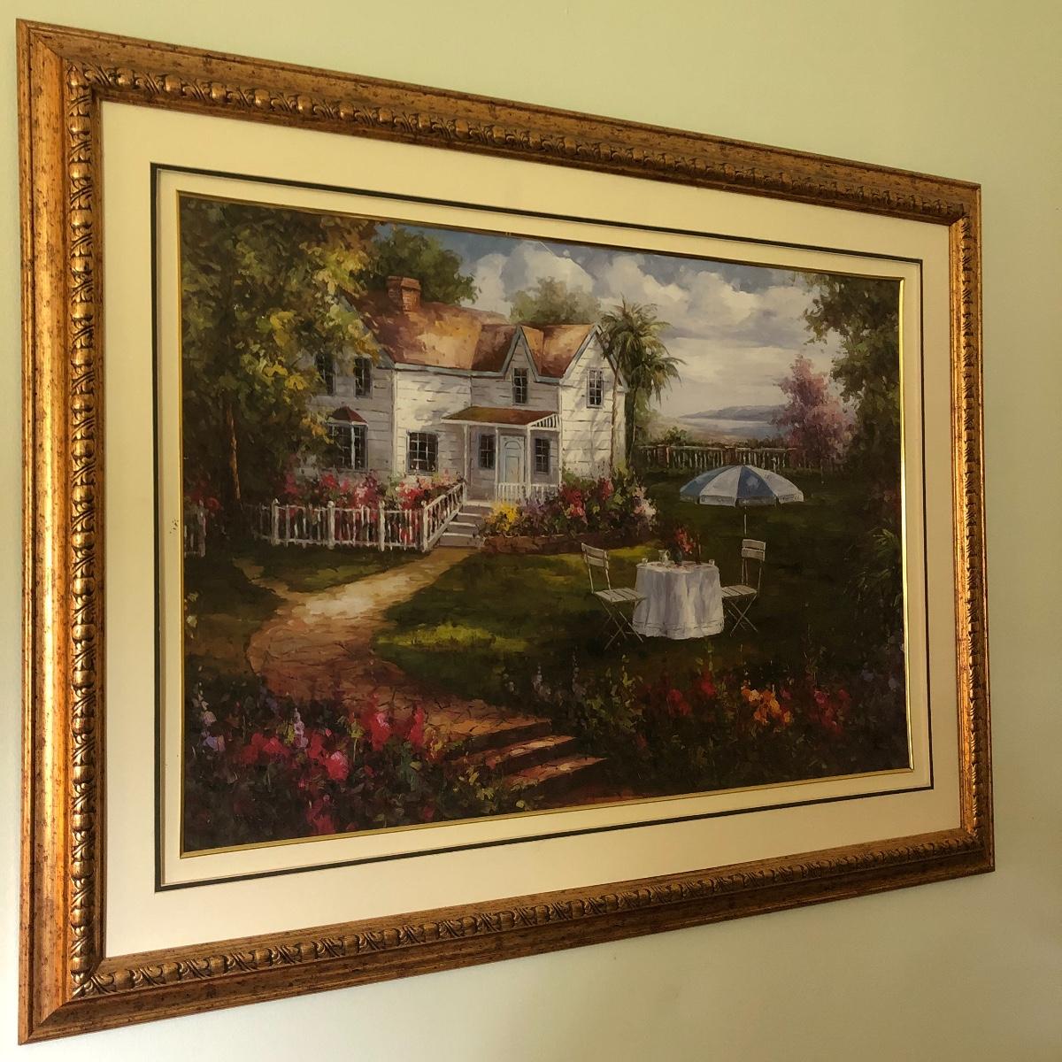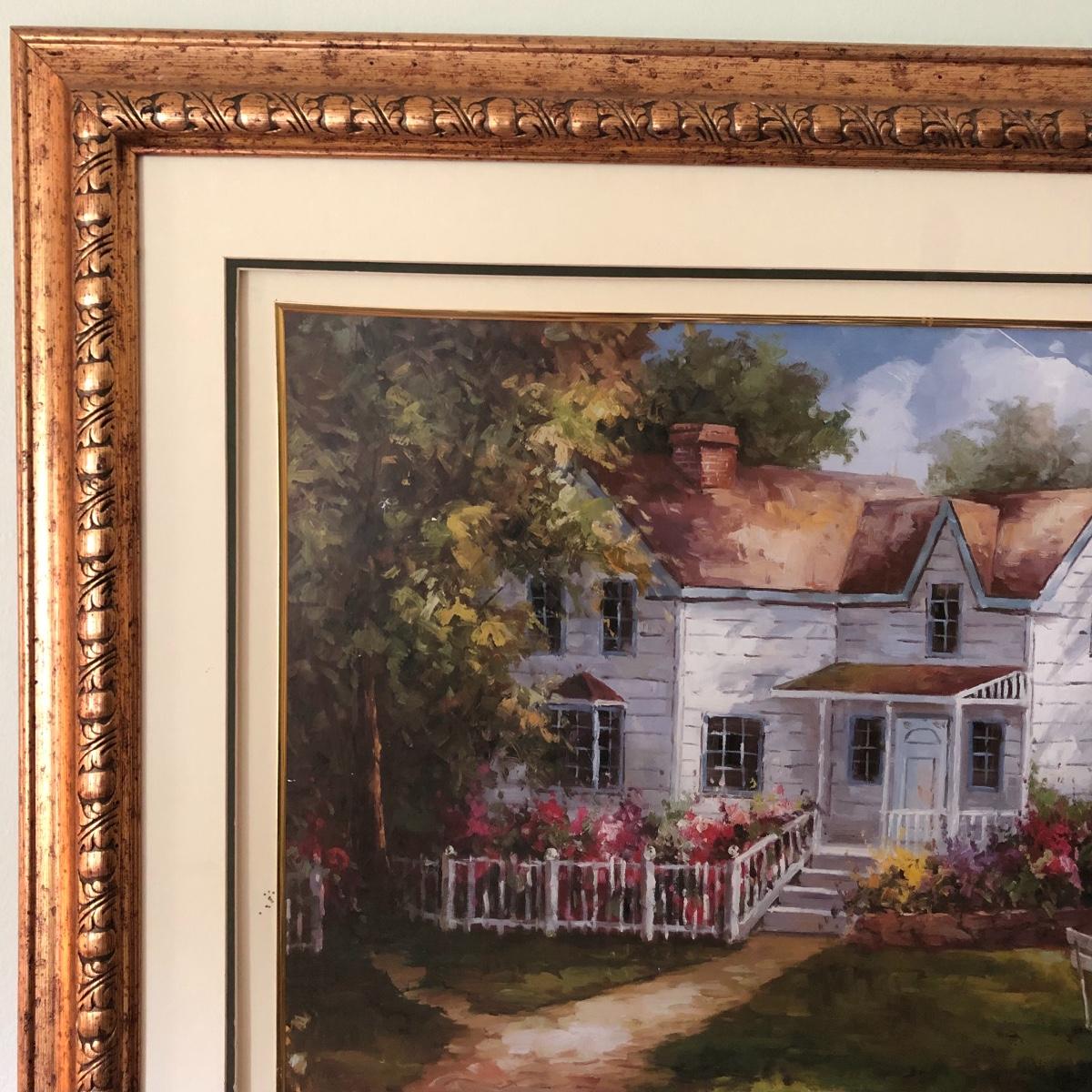 Painting of a home and garden, artist unknown. It is 41.5 inches by 32 inches and sits in a gold frame with paper framing another two layers in.