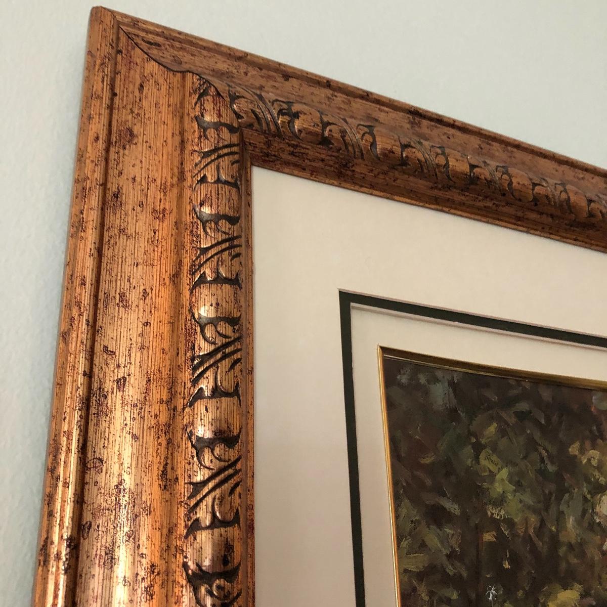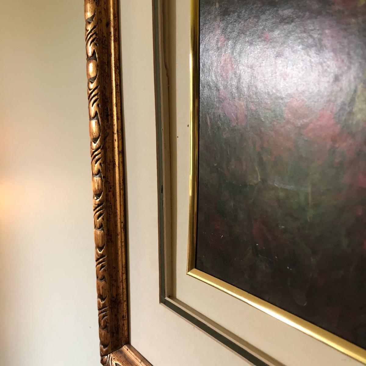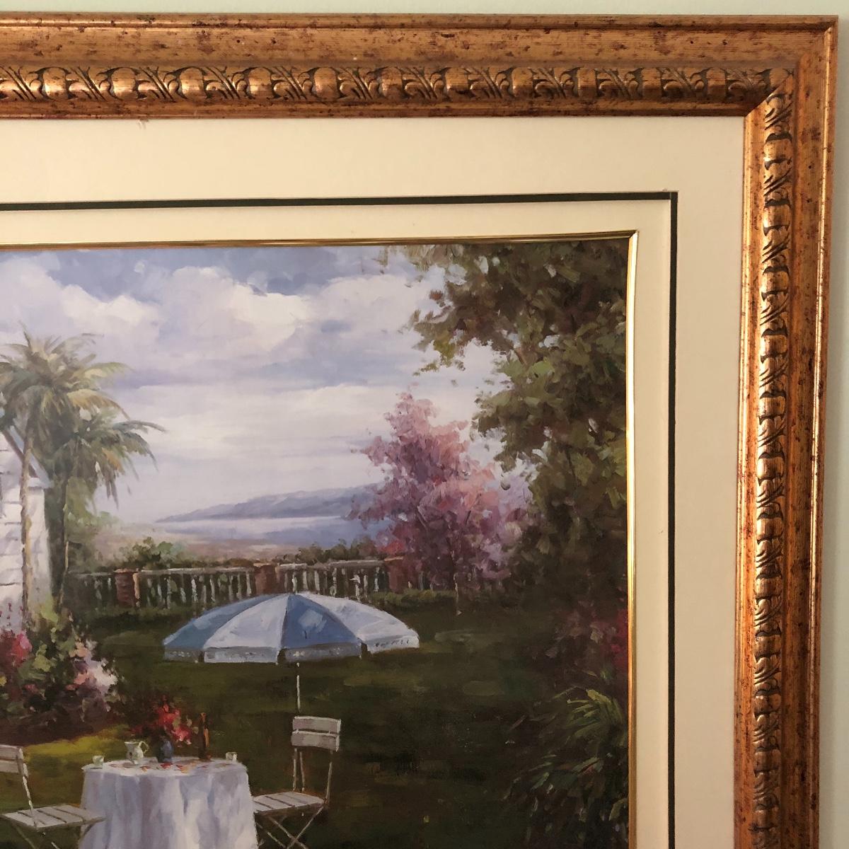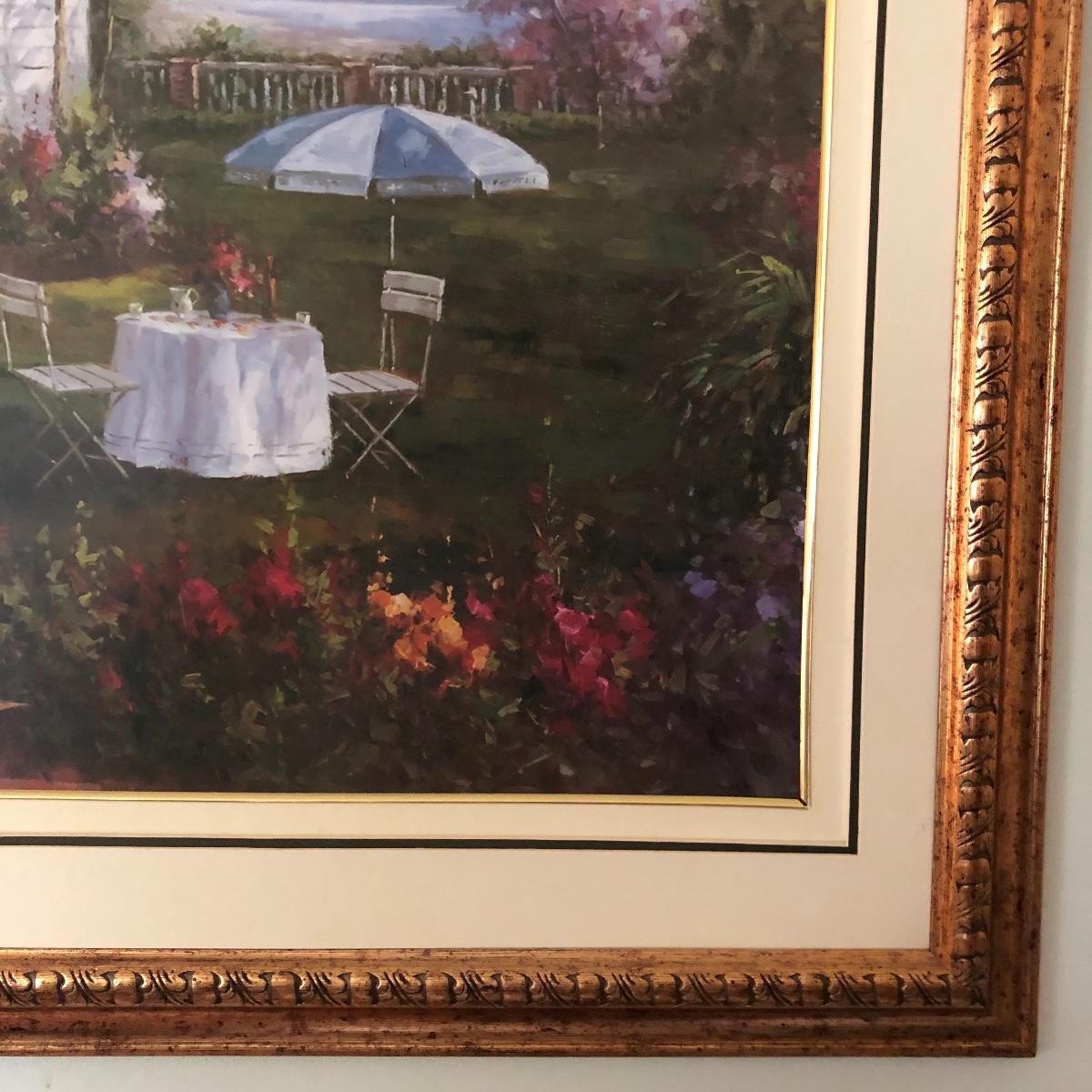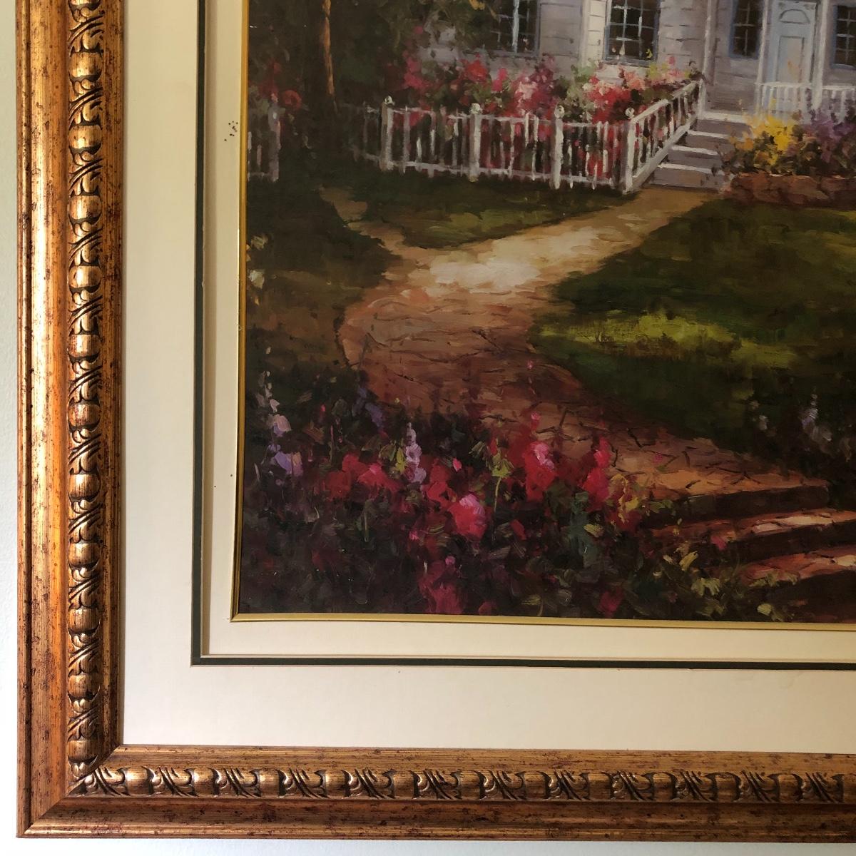 Painting of a home and garden, artist unknown. It is 41.5 inches by 32 inches and sits in a gold frame with paper framing another two layers in.