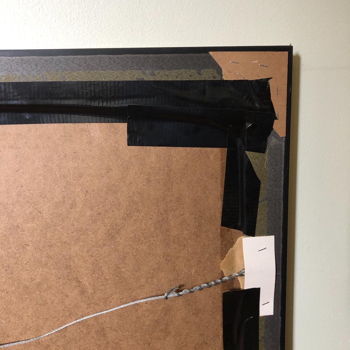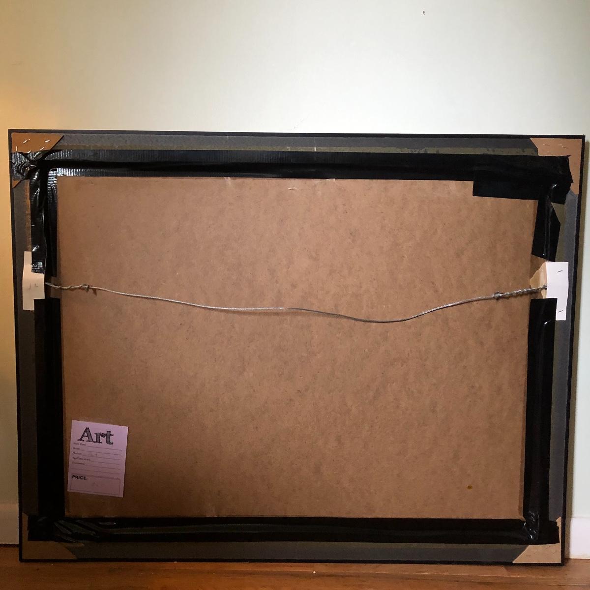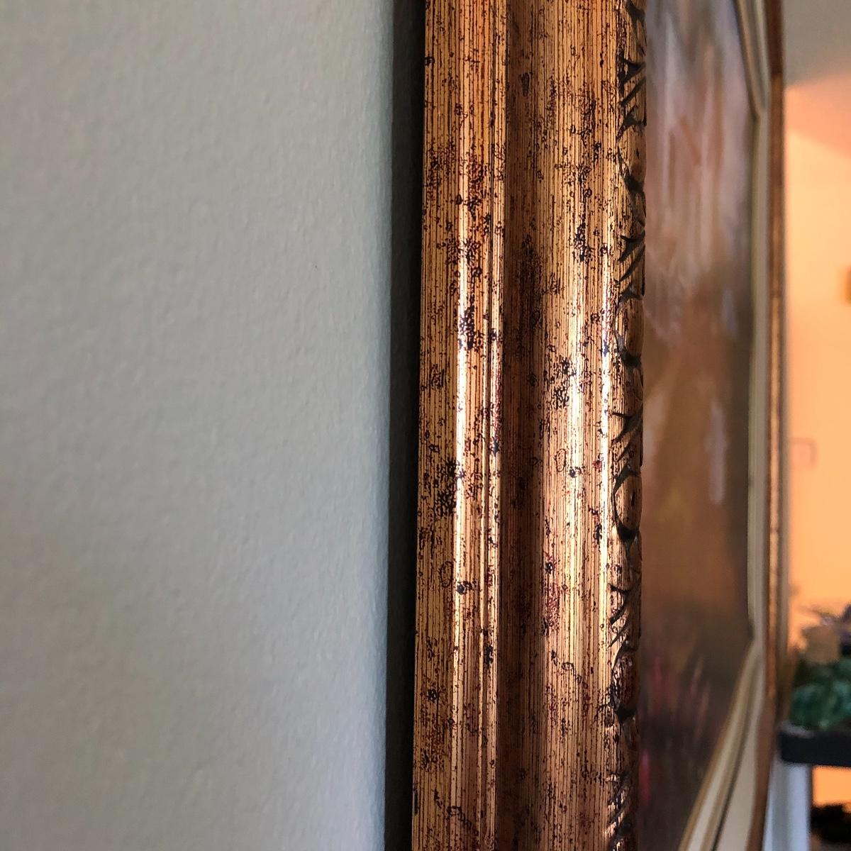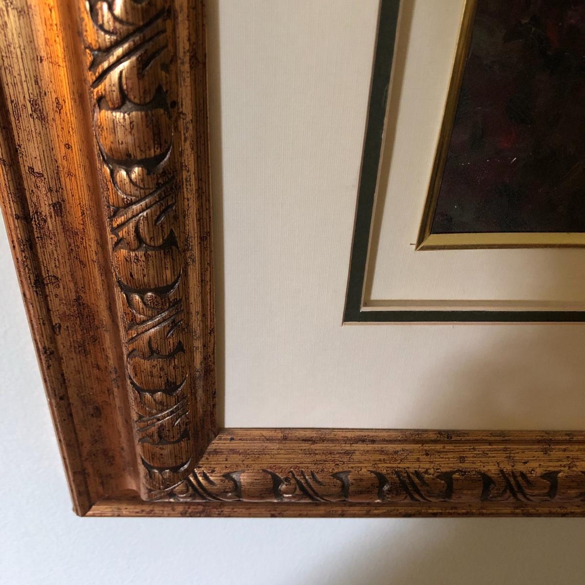 Painting of a home and garden, artist unknown. It is 41.5 inches by 32 inches and sits in a gold frame with paper framing another two layers in.