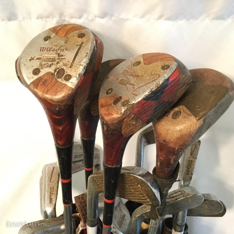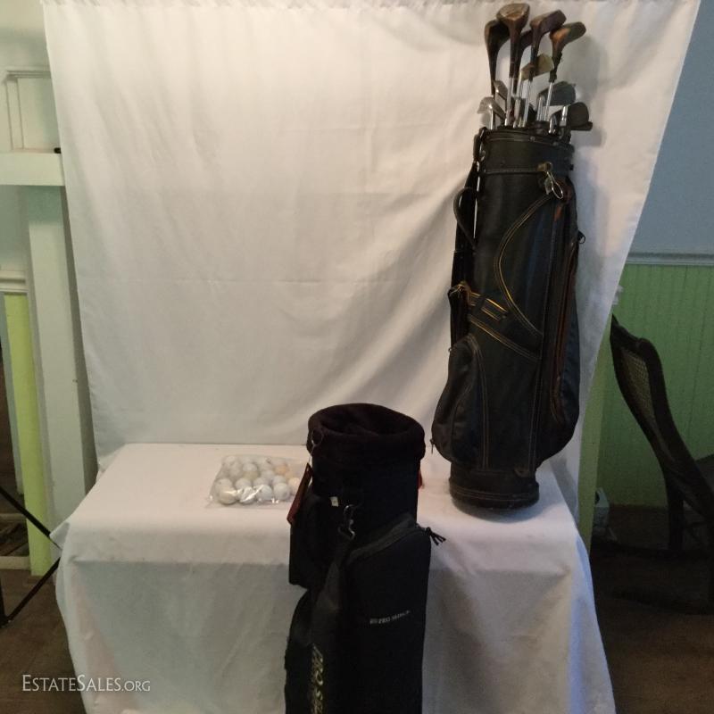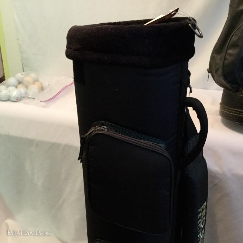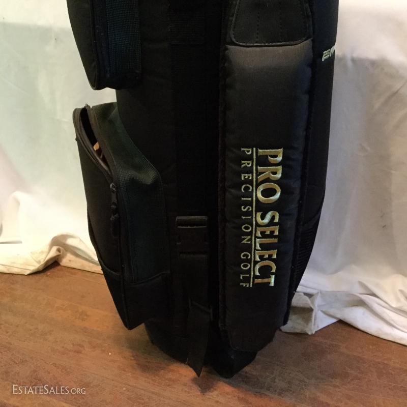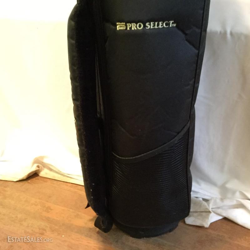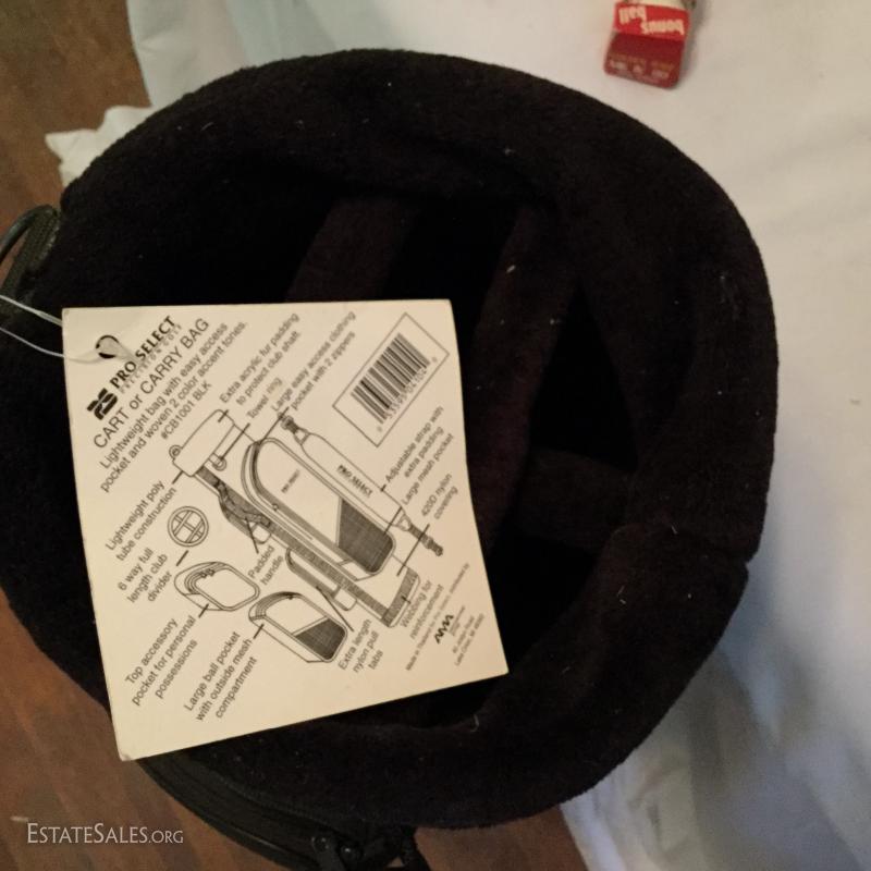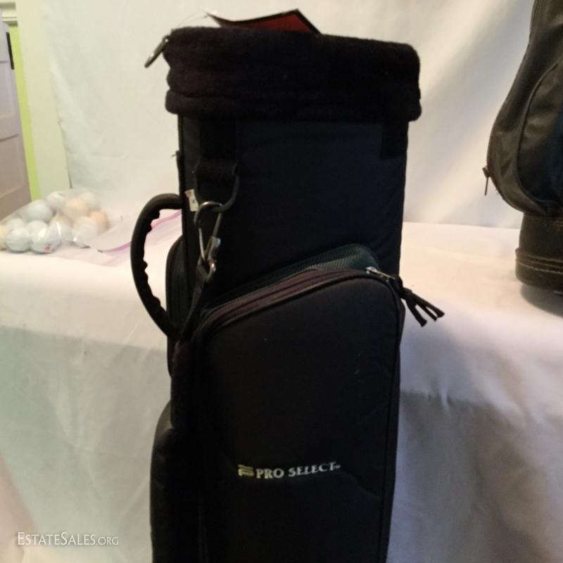 Golf -Vintage wristwatch golf scorer, vintage Fairway by Leeds NY golf bag and a new with tags Pro Select golf bag. Also a set of Billy Casper clubs and Wilson woods.