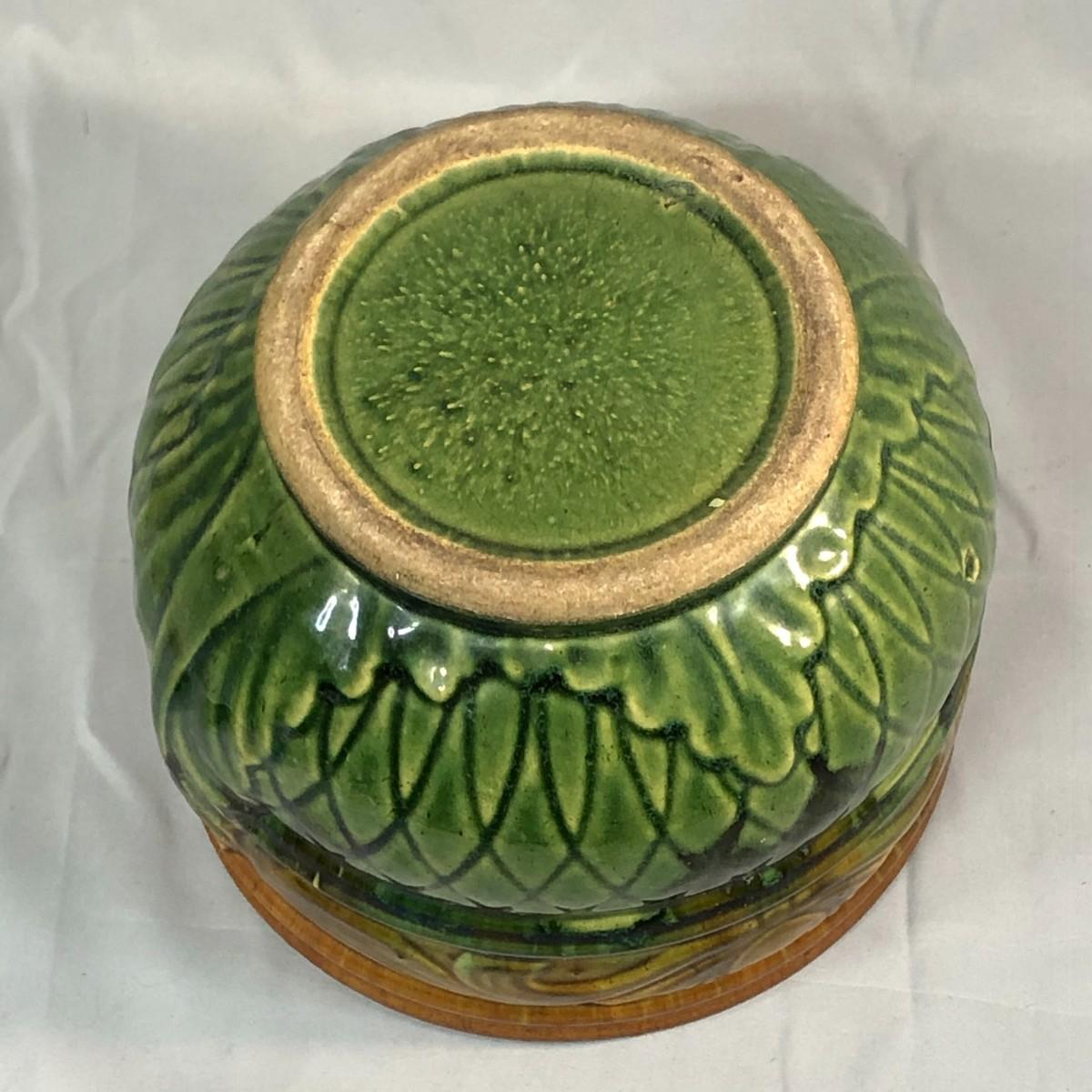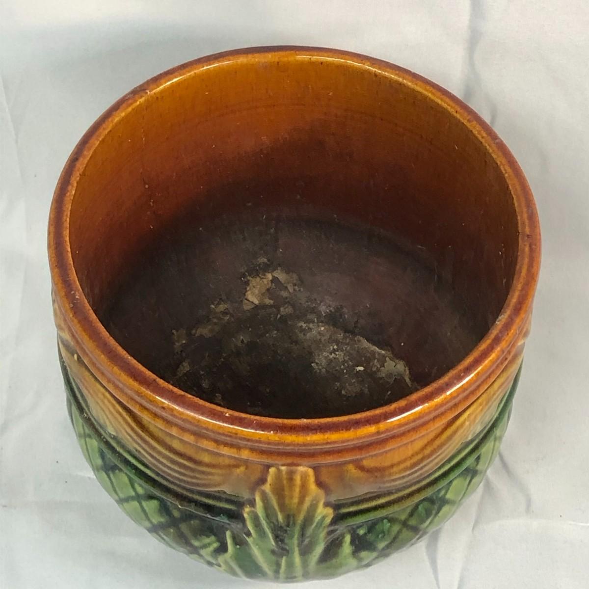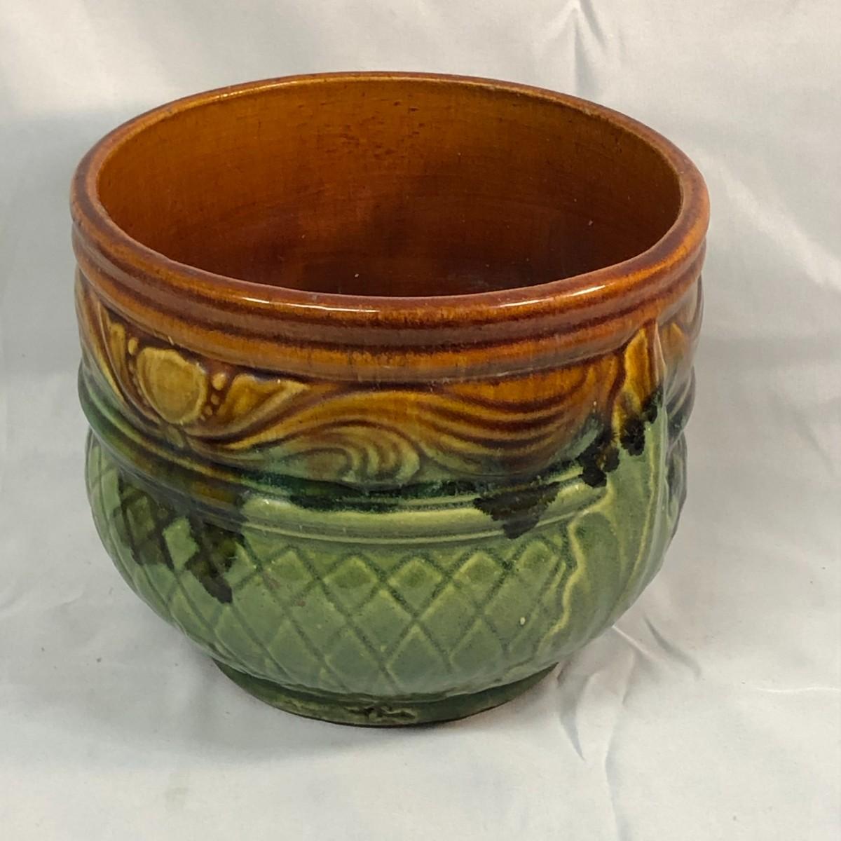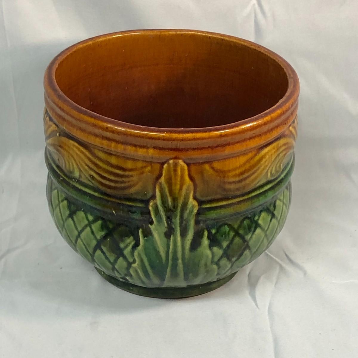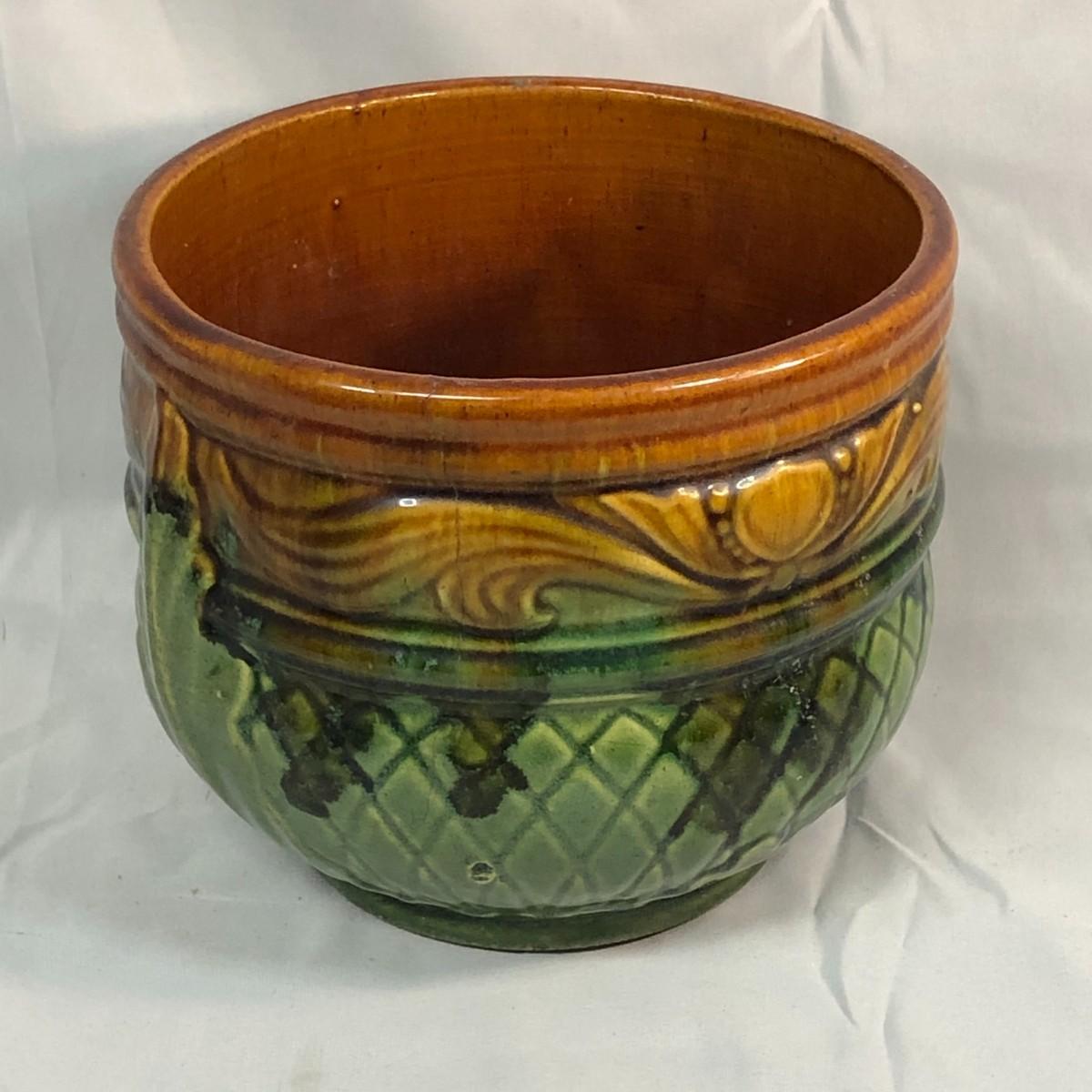 This planter is in great condition. I don't know what it is - the raised embellishments, the drip paint colors, or the colors themselves, but I like this one. Excellent condition and stands about 6.5" tall and about 7.5" in diameter.