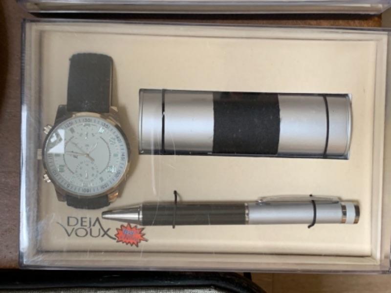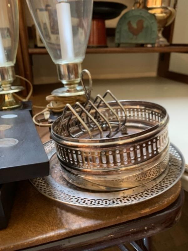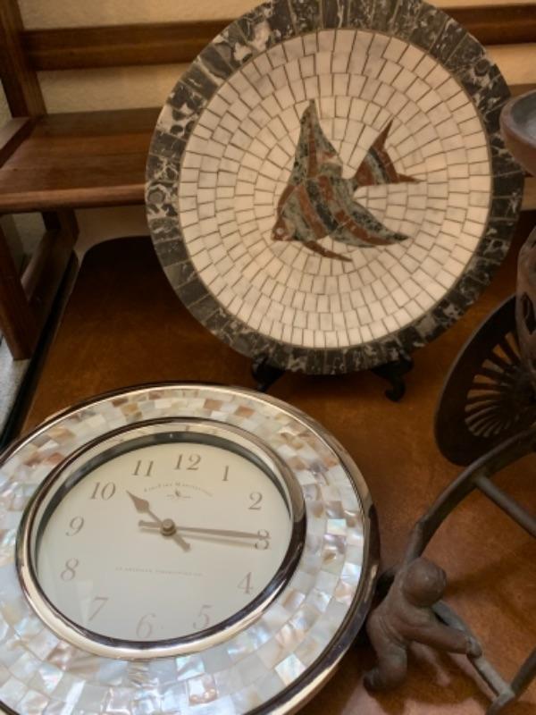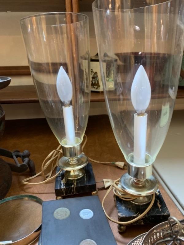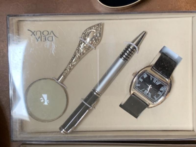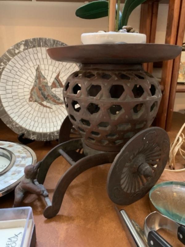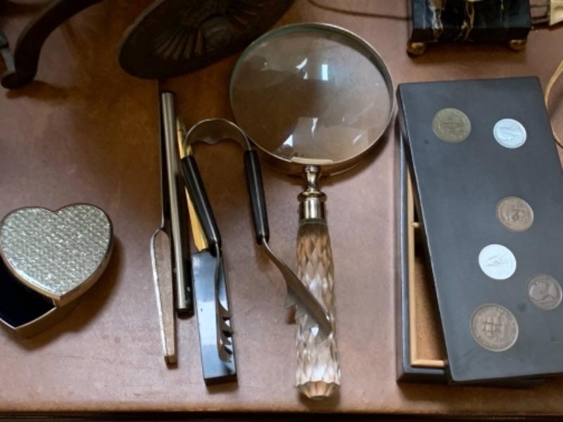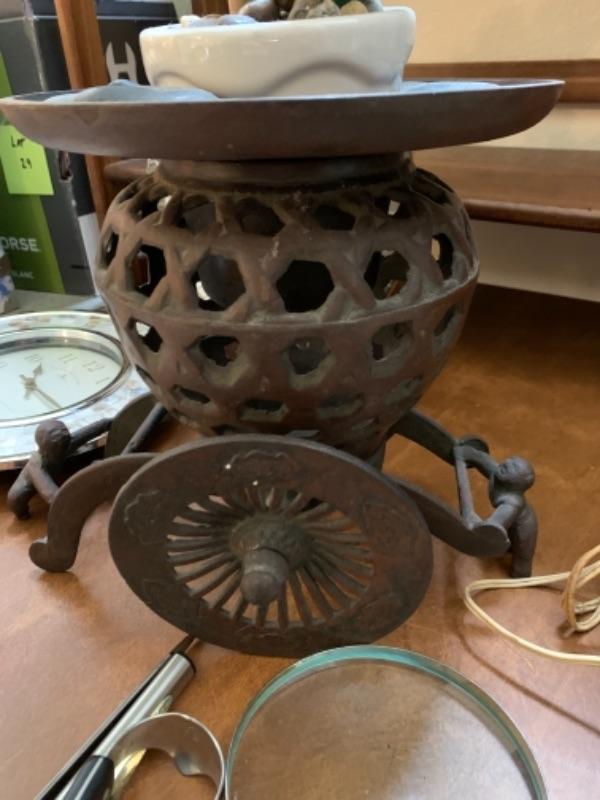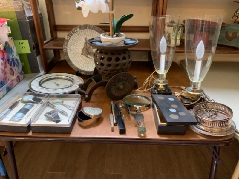 Lot 33. Japanese cast iron plant holder, two pen and pencil kits, clock, jewelry boxes, plug-in table lamps, silver plate wine coasters, plates, magnifying glass, etc.--$95
