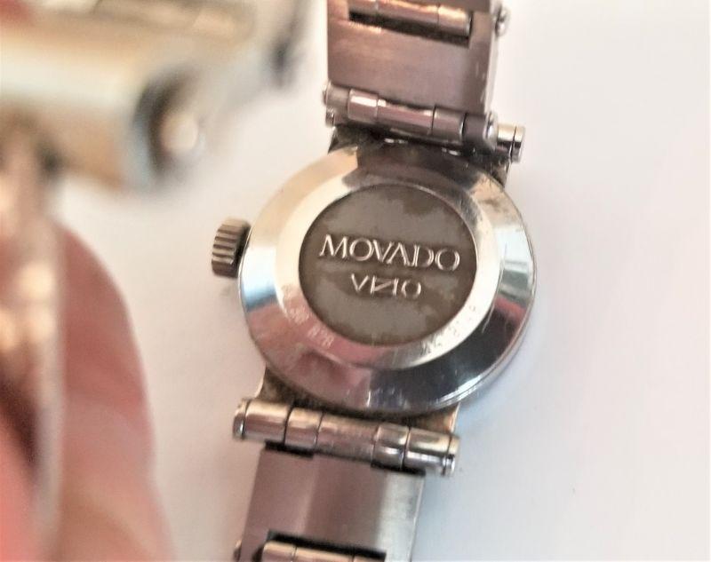 Ladies Movado Stainless Steel Wristwatch with time/date. No box/papers. Genuine Movado. Has been in storage so battery has run down. You can set the time. Not running as it needs a battery. Has been worn, some light scratching to band from daily use.