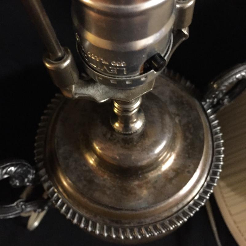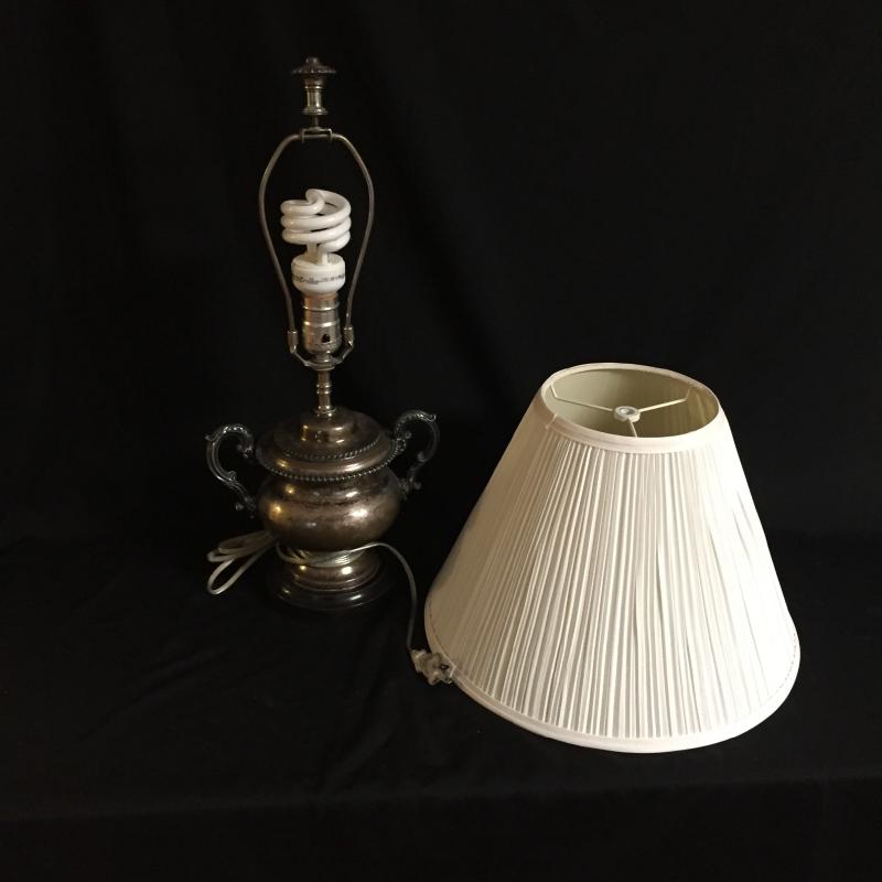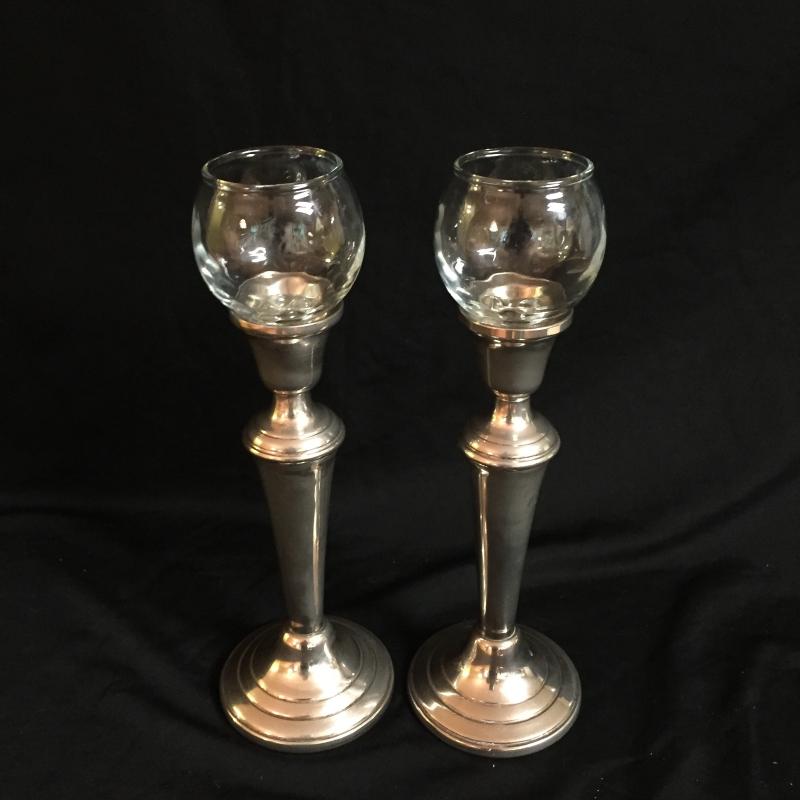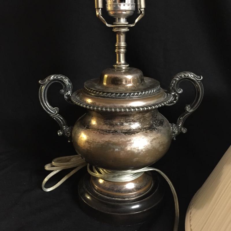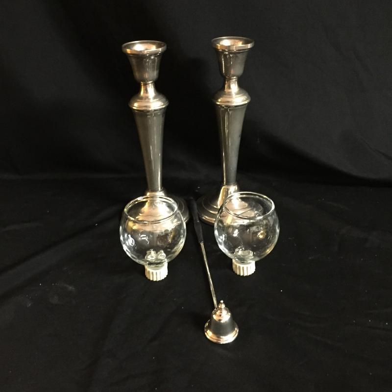 Unique Silver Lamp (very tarnished) with shade that Measures 18” Tall. Lot also includes a pair of Candle Sticks with removable glass bulb and a Candle Snuffer. Candle sticks are 8.5” Tall. Local Pickup Only
