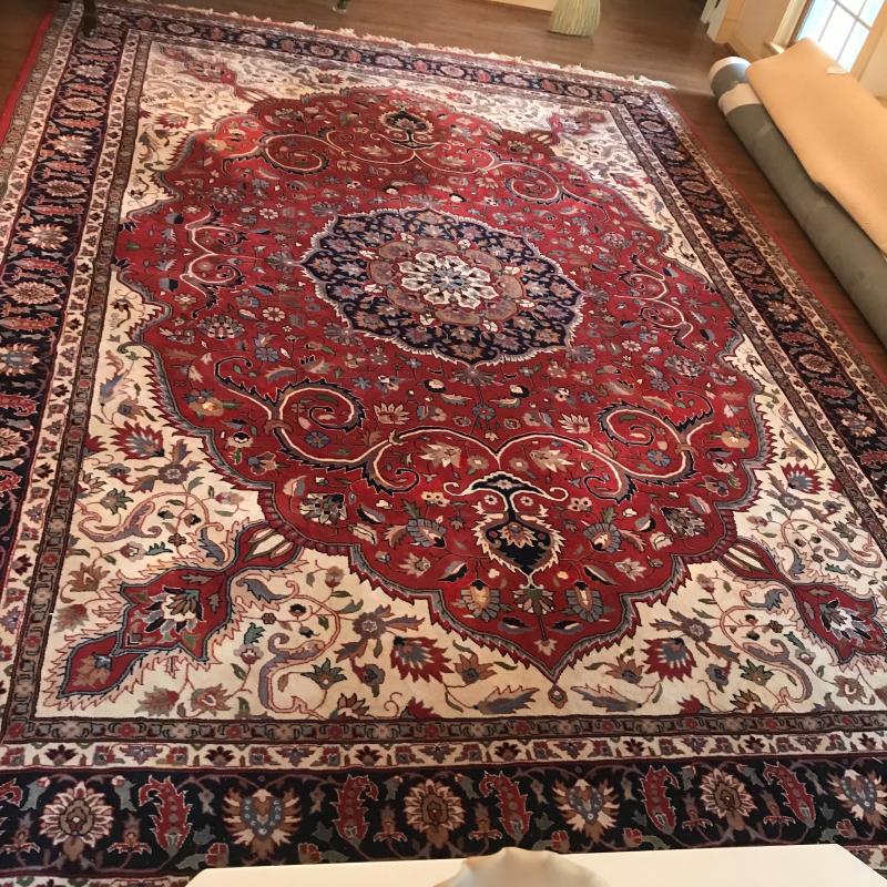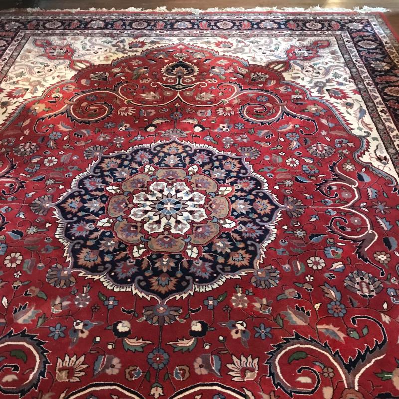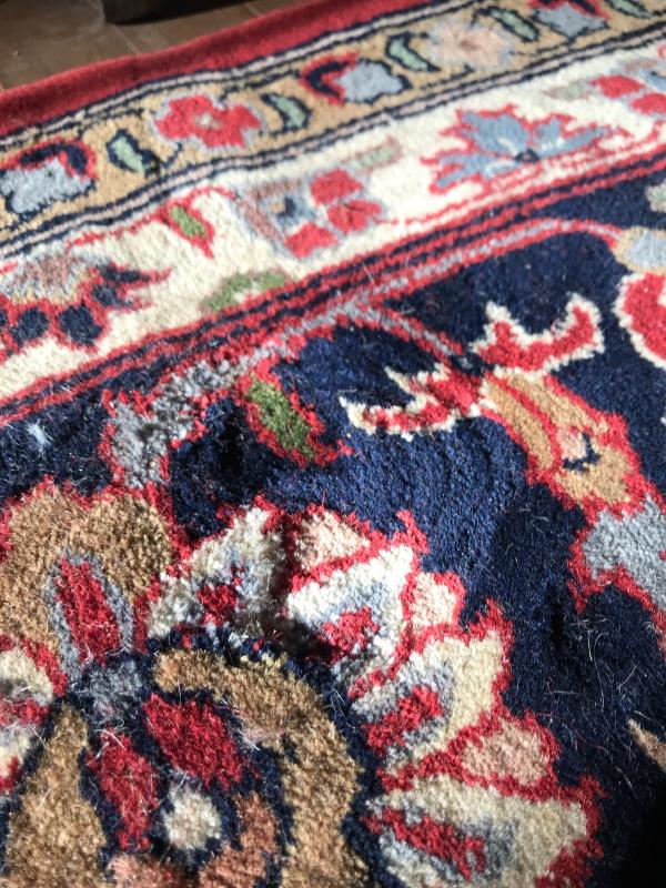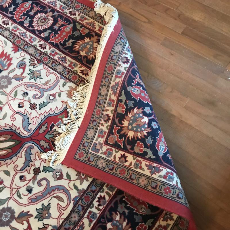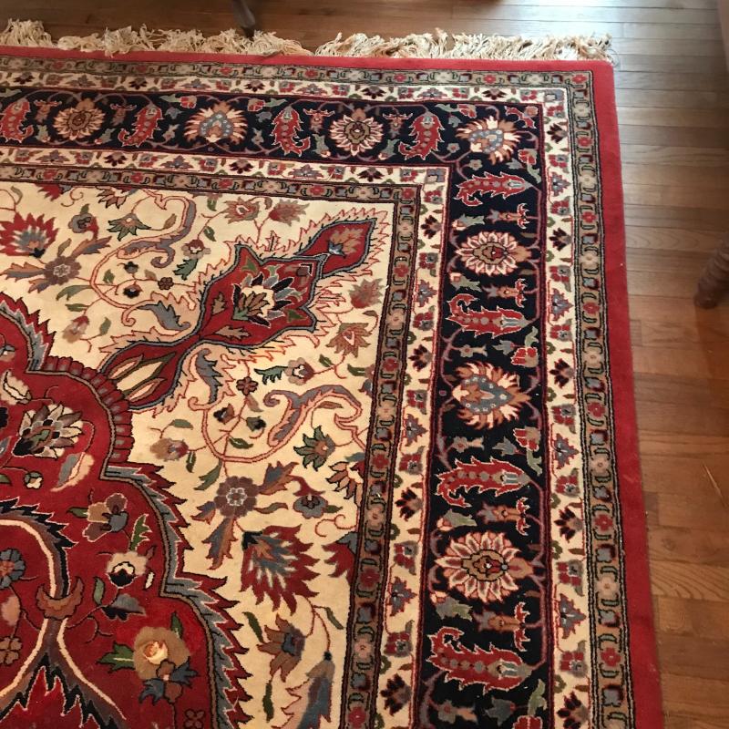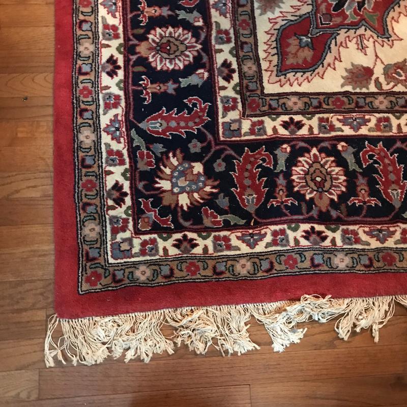 Deep rich colors of red, blues and cream in this beautiful wool-fringed rug. In great shape. Measures approx. 176” x 120” (with the fringe). Small indention in one corner from Furniture. Should come out over time. In last photo. This lot is available for local pick up in Flat Rock, NC only.