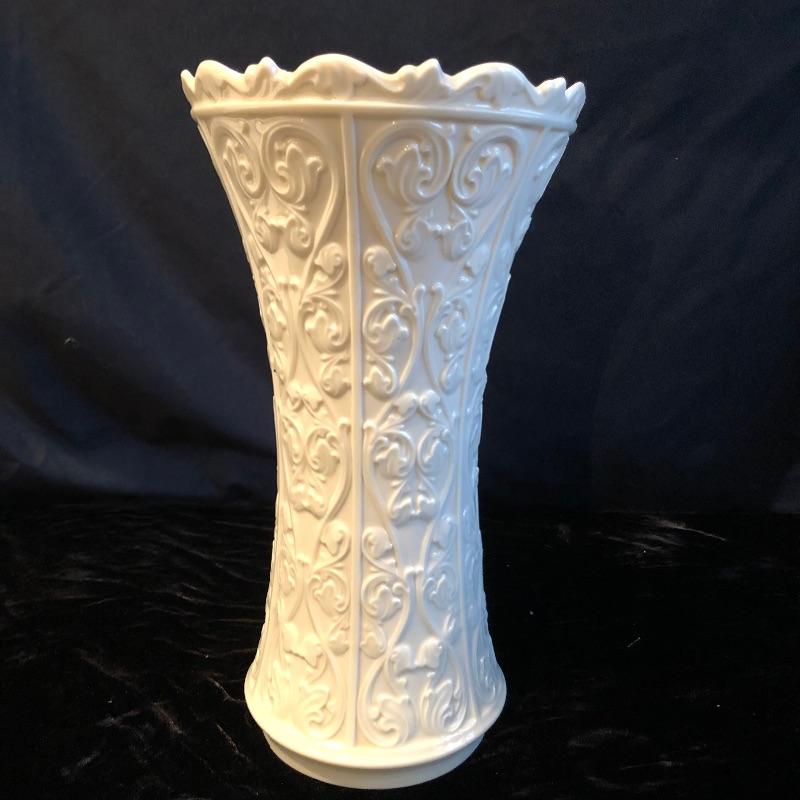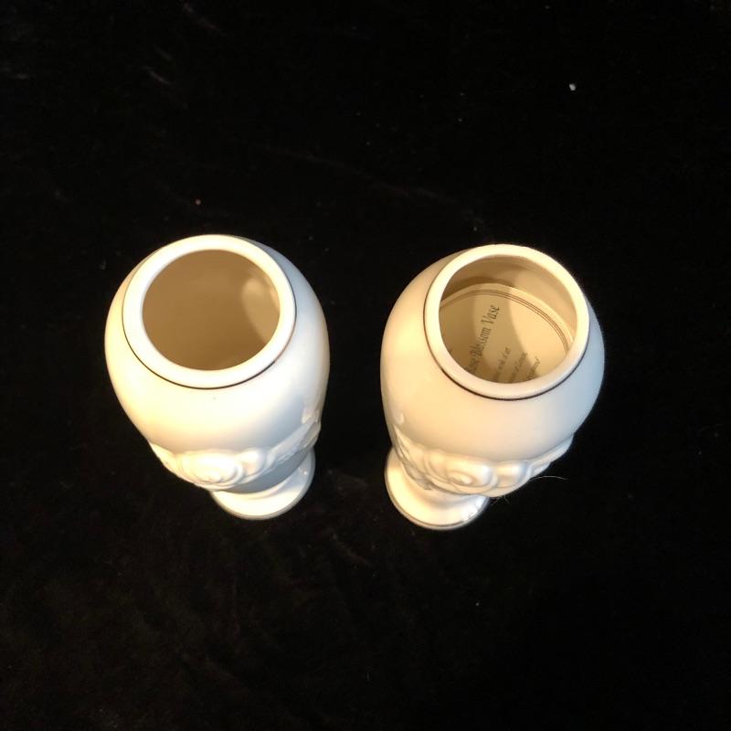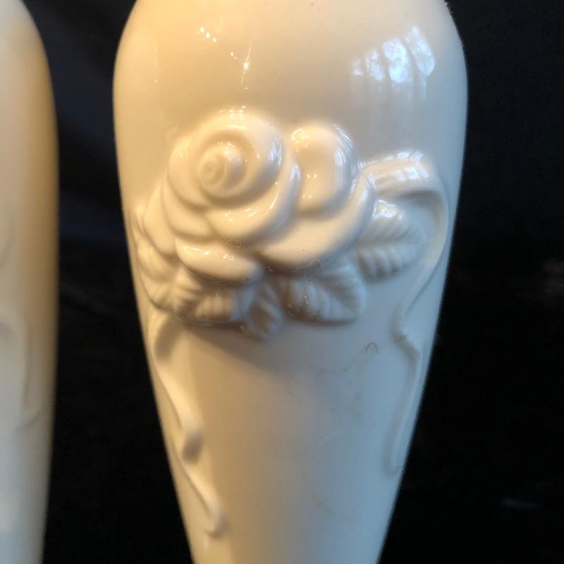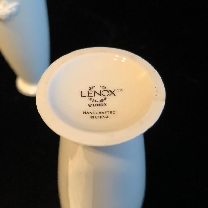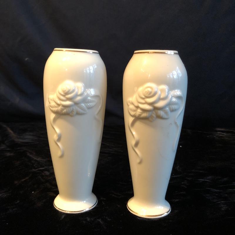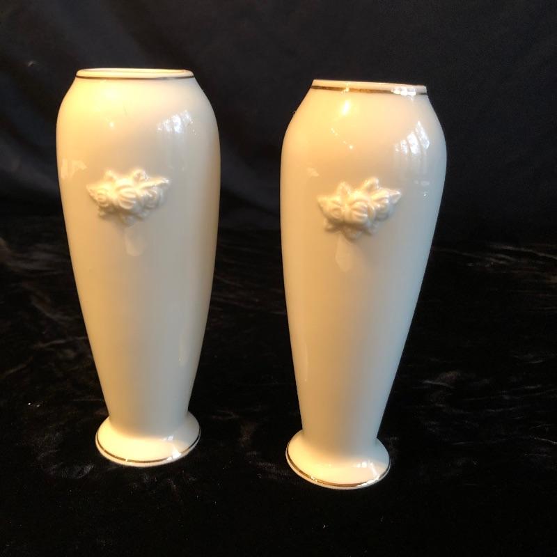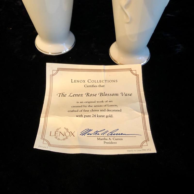 This trio of Lenox vases look good with or without flowers! The two smaller vases are a match set and come with a COA that notes that they are the Lenox Rose Blossom Vases, made of fine China and 24 karat gold. The taller Lenox vase measures 11” tall.