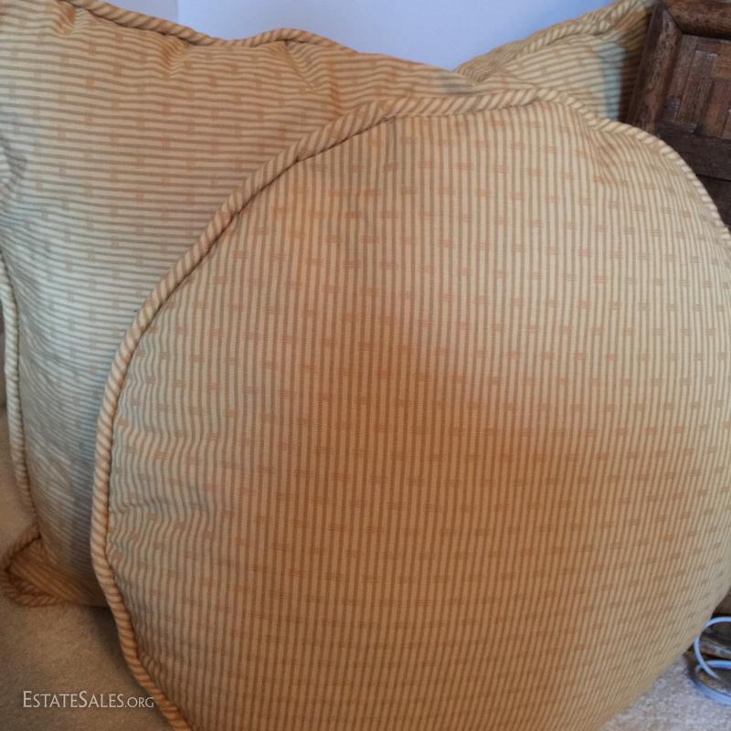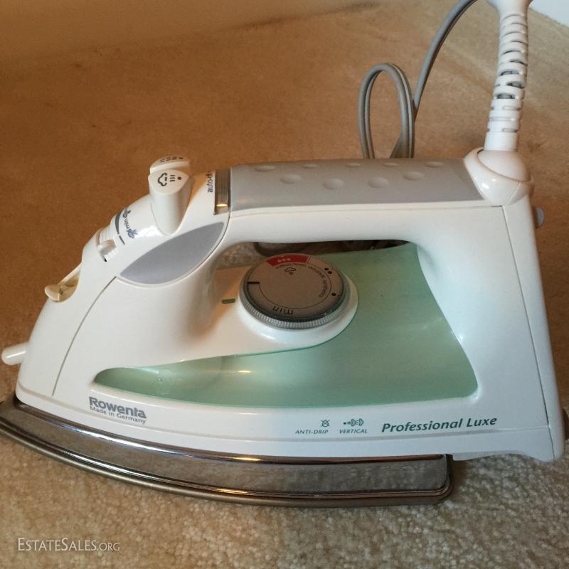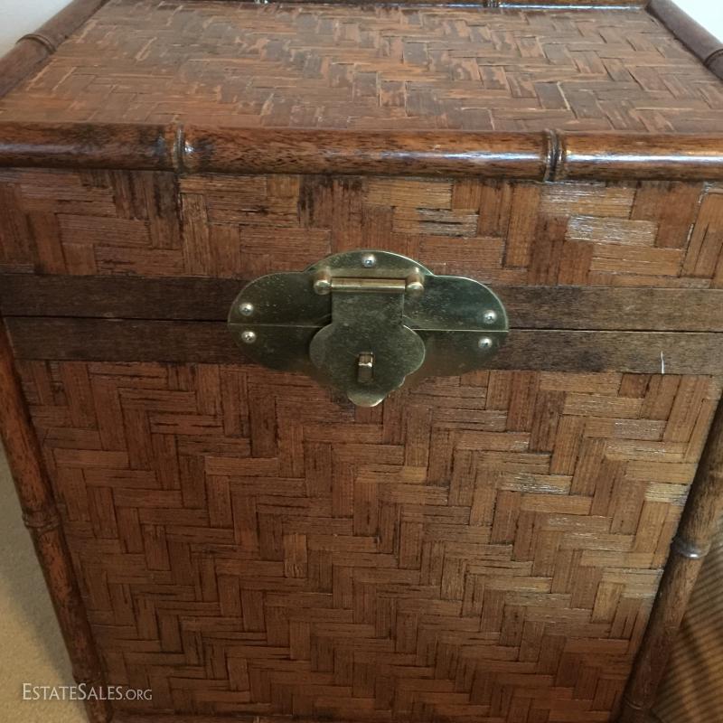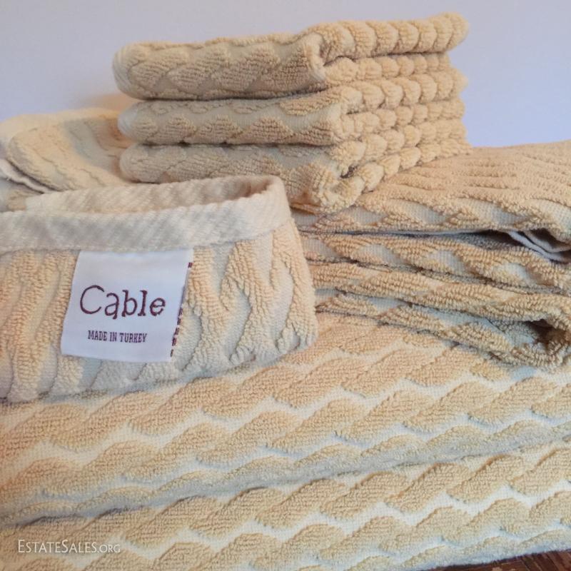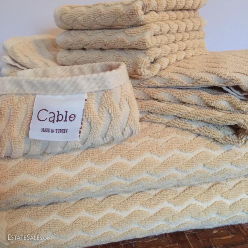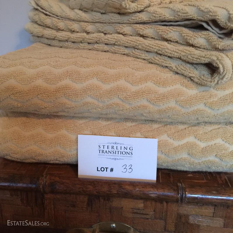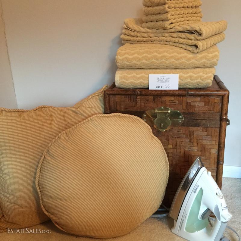 Woven chest with brass hardware, Set of Cable , made in Turkey 2 towels/4 washcloths/2 hand towels, 2 yellow/gold pillows (square and round) and Rowente made in Germany iron.